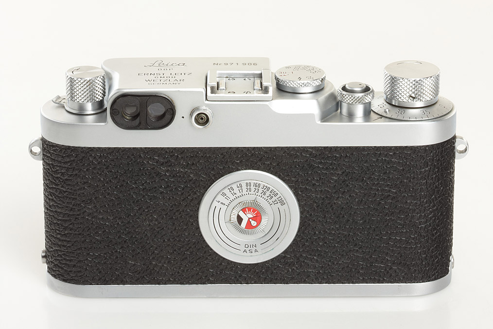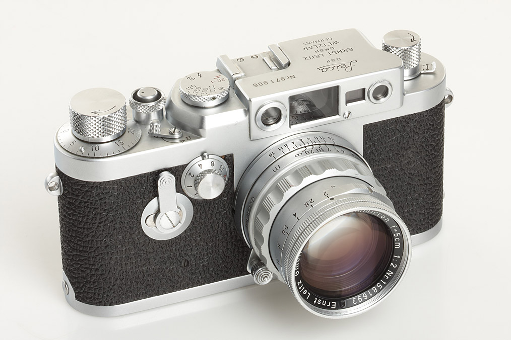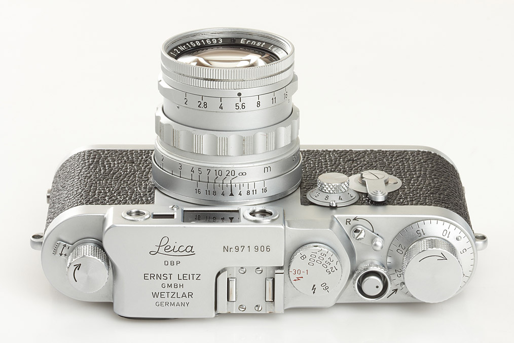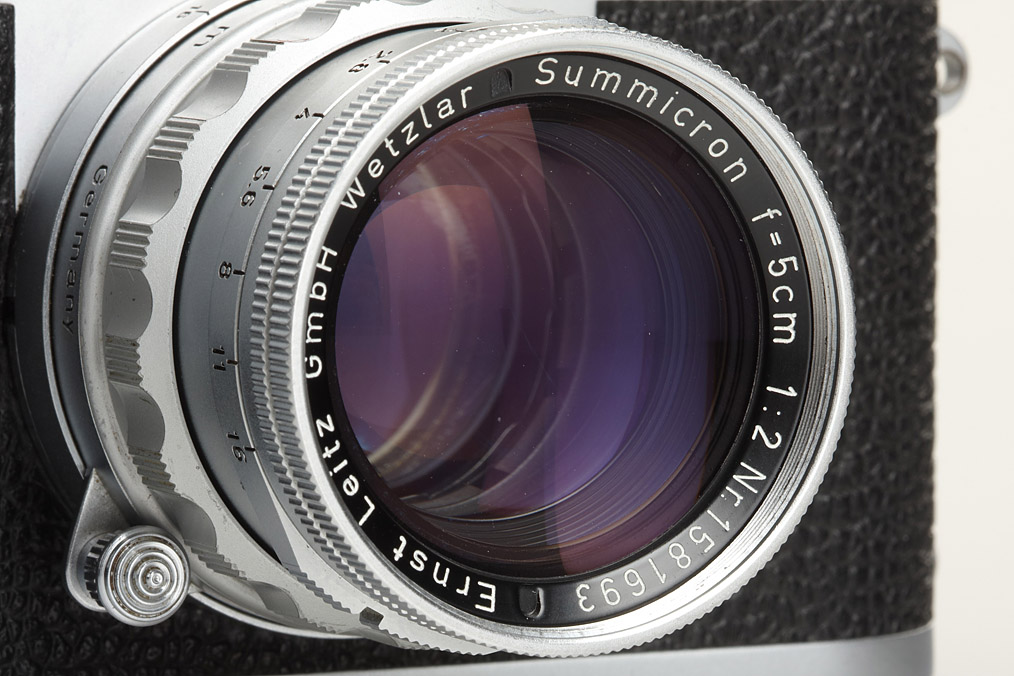 IIIg outfit with 5 lenses: rare rigid Summicron 2/5cm no.1581693 (cond. B, identical serial number inside, cap), Summaron 5.6/2.8cm no.1501672 (cond. B+, caps), rare original screw mount Summicron 2/35mm no.1671873 (cond. B/A, very clean lenses, focusing to 1m, caps), Elmarit 2.8/90mm no.1685188 (cond. A/B, caps), VIOOH universal finder no.70753 with TUVOO 2.8cm attachment
