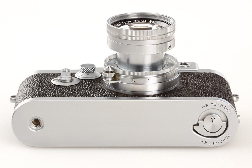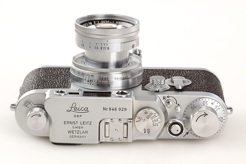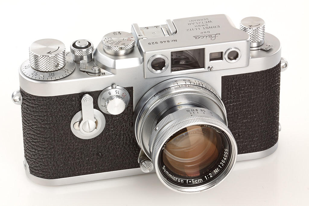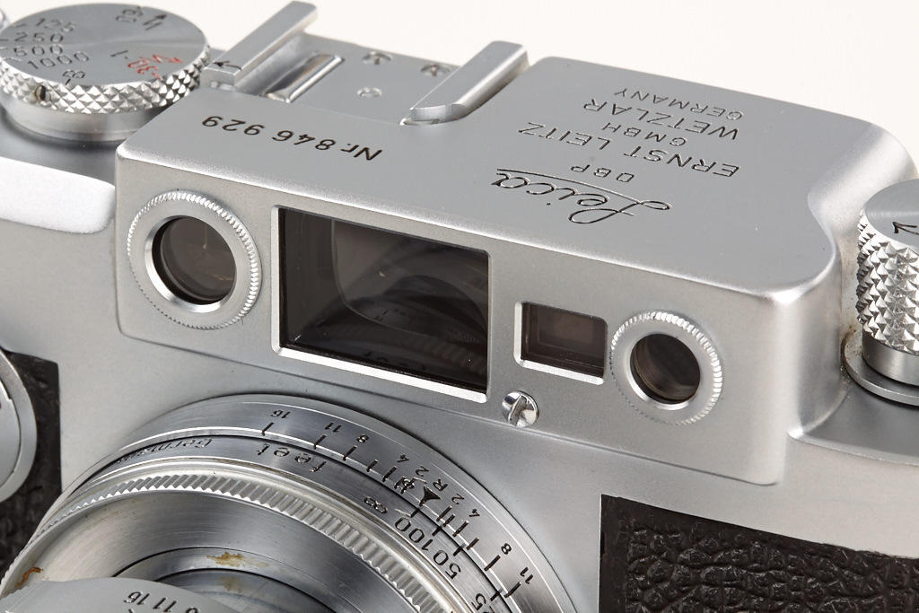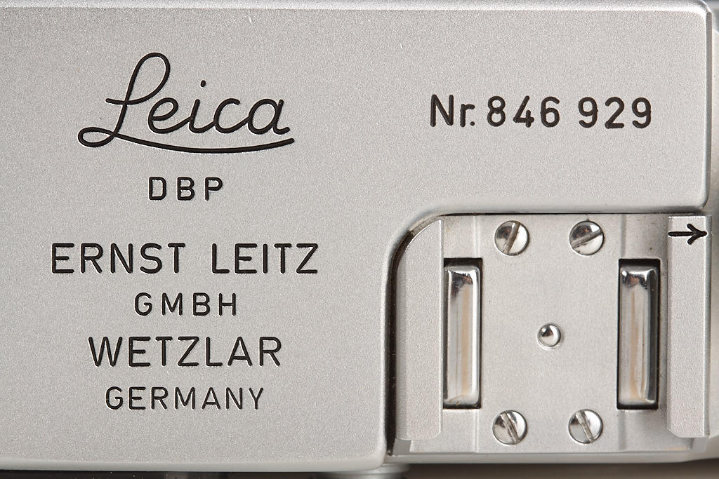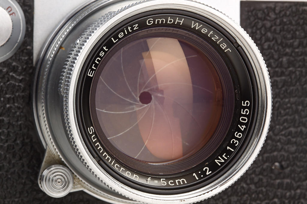 body in almost mint condition and good working order with coll. Summicron 2/5cm no.1364055 (cap, case), W-Nikkor-C 3.5/2.8cm no.715836 (good lenses) with matching Nikon 2.8cm finder, original screw mount Elmarit 2.8/90mm no.1649204 (cap), VIOOH universal finder no.79587 with TUVOO 28mm attachment (E.Leitz Inc.), Leicavit SYOOM, SOOFM hood (engraved 'Summicron'), ADVOO close-up device (in maker's box) and SOOKY close focusing device (in maker's box)