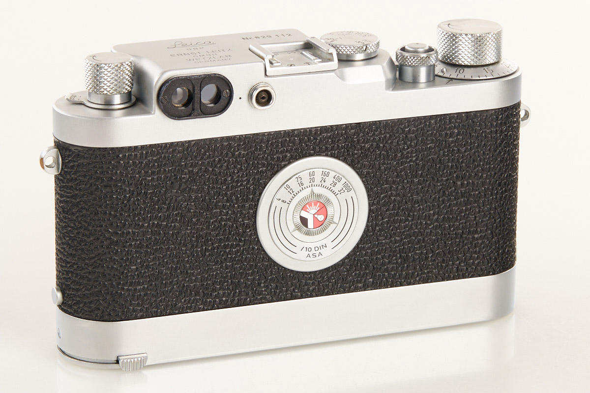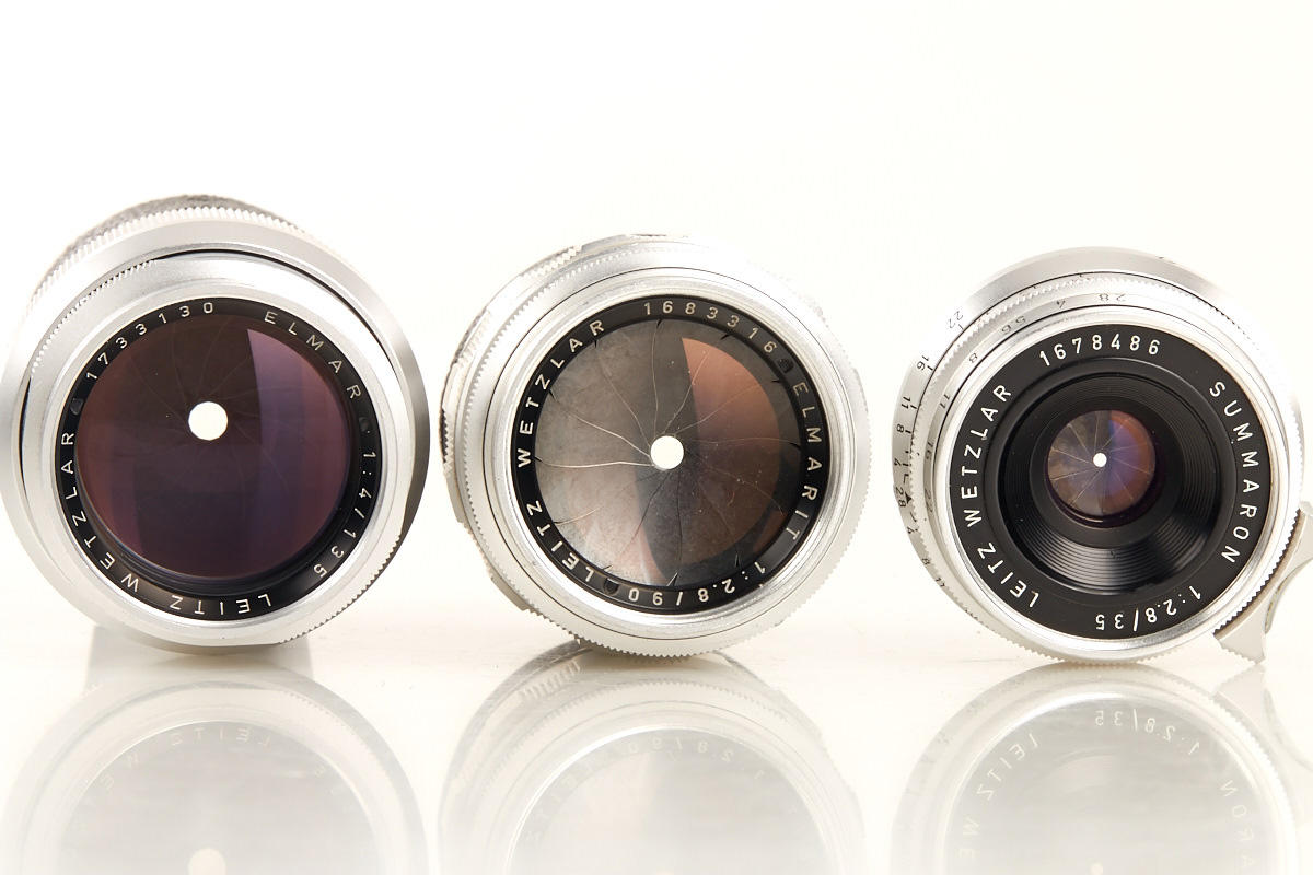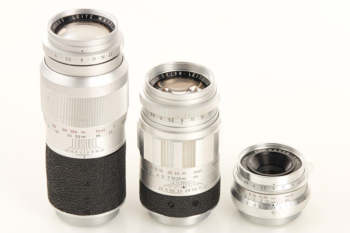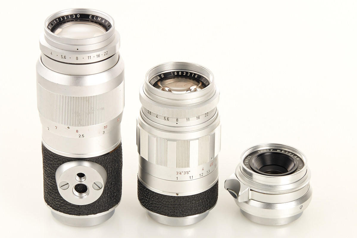 early body in perfect working order with Leicavit SYOOM (red maker's box), regular base plate, Elmar 2.8/5cm no.1494643 (cap), Wetzlar Summaron 2.8/35mm no.1678486 (caps), Elmarit 2.8/90mm no.1683316 (caps), Elmar 4/135mm no.1733130 (caps), VIOOH universal finder no.86335 (cond. B)