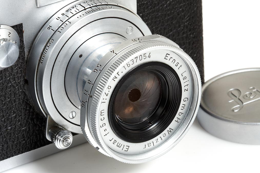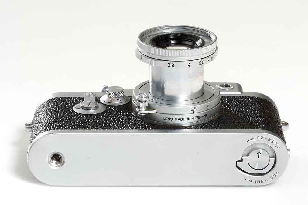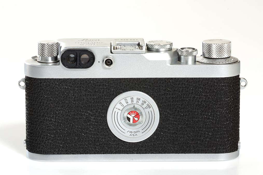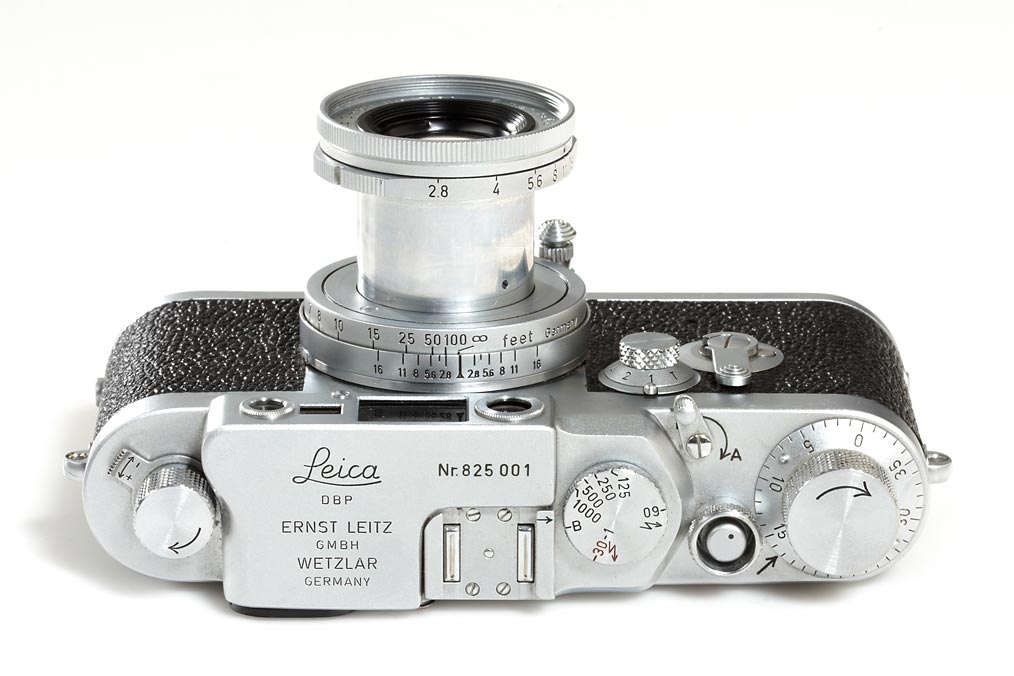 this is the very first IIIg produced, a very historical collectors piece in fine and fully original condition (all early features like early type advance knob, high sheen shutter speed dial, internal chassis number 825001 perpendicular to film plate). The camera was family property for more that 40 years, it was apparently delivered to US and never on the market before. It is in perfect working order with Elmar 2.8/5cm no.1637054, cap