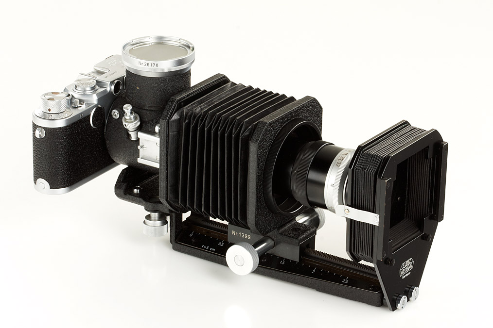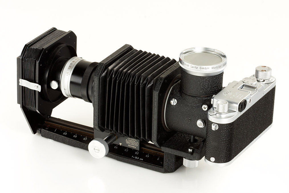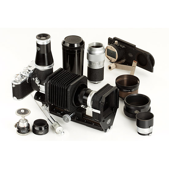 black dial body in good working order (cond.B+) with OZYXO Visoflex I, UXOOR universal focusing bellows, UOOYW adapter ring, UOOVH extension tube, 31mm extension tube (engraved: Repro), Hektor 4.5/13.5cm no.1268059, FIKUS hood, Q63bellows lens hood UZEOO, USOOR adapter ring for Summitar 5cm, OOBAZ focusing stage, VXOOT helical focusing mount, VALOO aperture setter, ball head, double cable release, instruction book - all in very good condition in fitted UYOOG fibre covered outfit case
