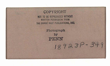 Vintage silver print, mounted on original cardboard 42,0 x 39,8 cm (16.5 x 15.7 in) Photographer's “Photo by Penn” stamp, Condé Nast copyright stamp and handwritten negative number on the reverse PROVENANCE Collection Roland Pleterski LITERATURE John Sarkowski (ed.), Irving Penn, Museum of Modern Art, New York 1984, plate 50 (same series).