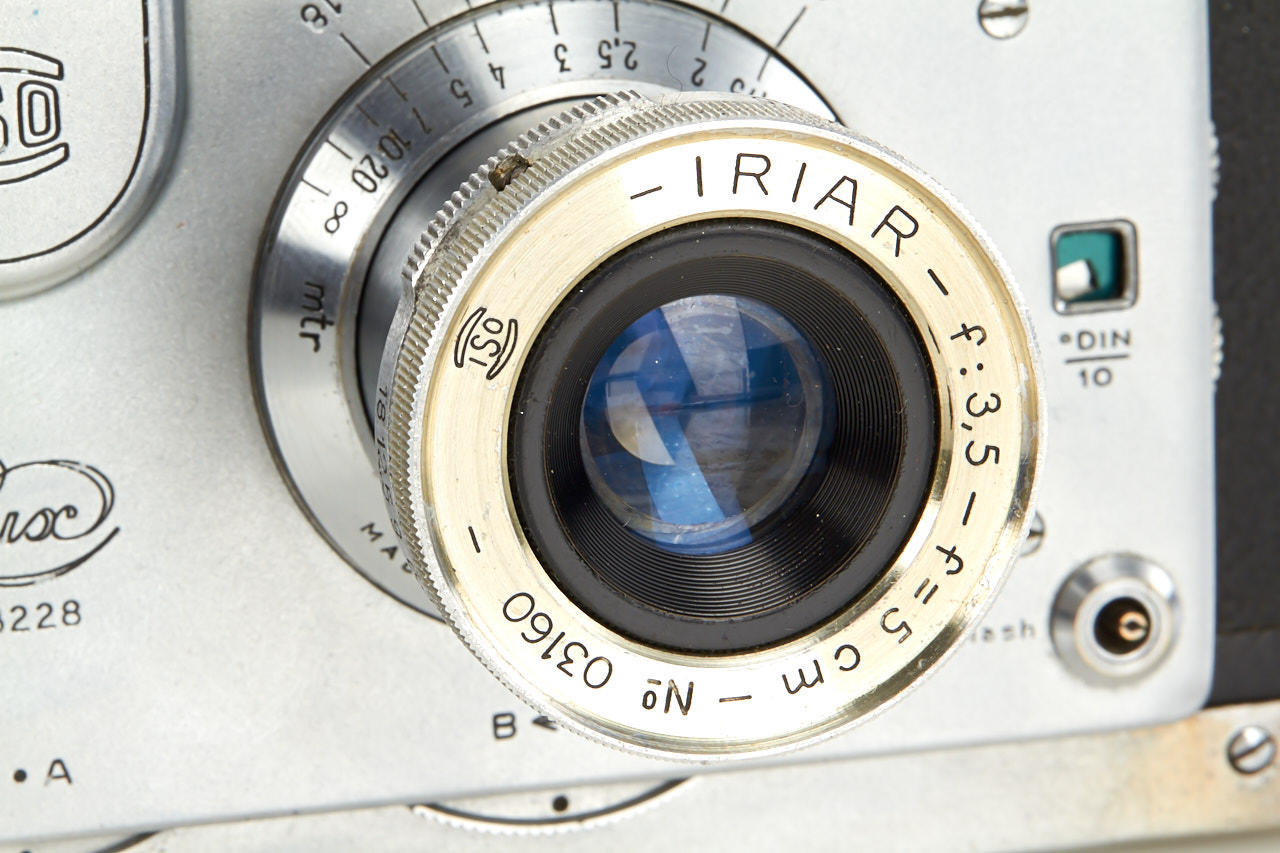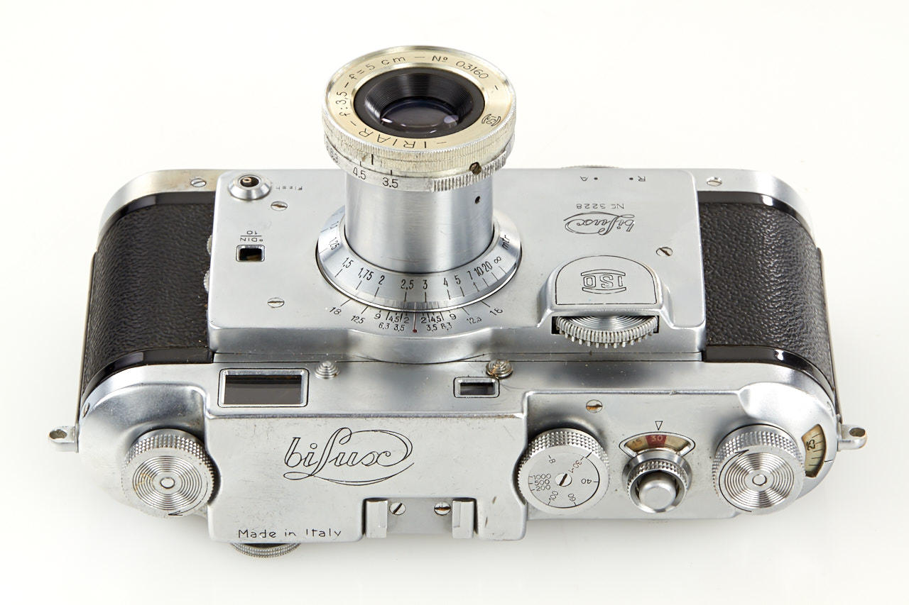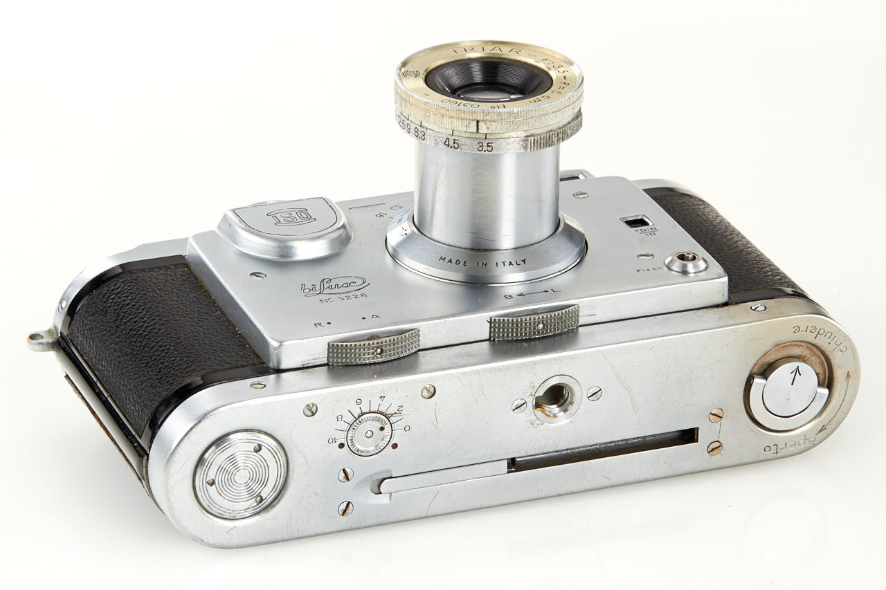 beautiful and rare Italian Leica copy with folding trigger in base plate, in very fine and perfect working condition, Iriar 3.5/5cm lens no.03160, lens cap, original everready case