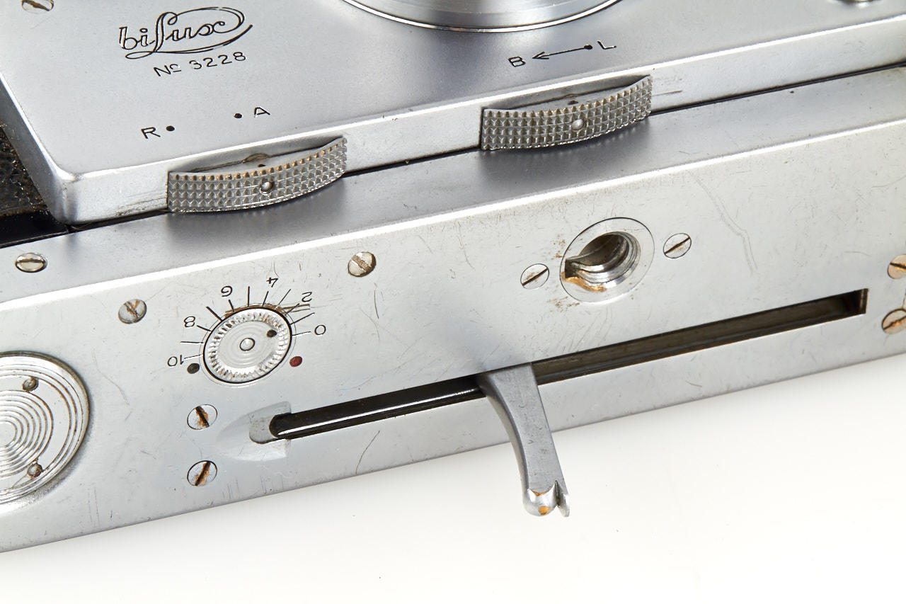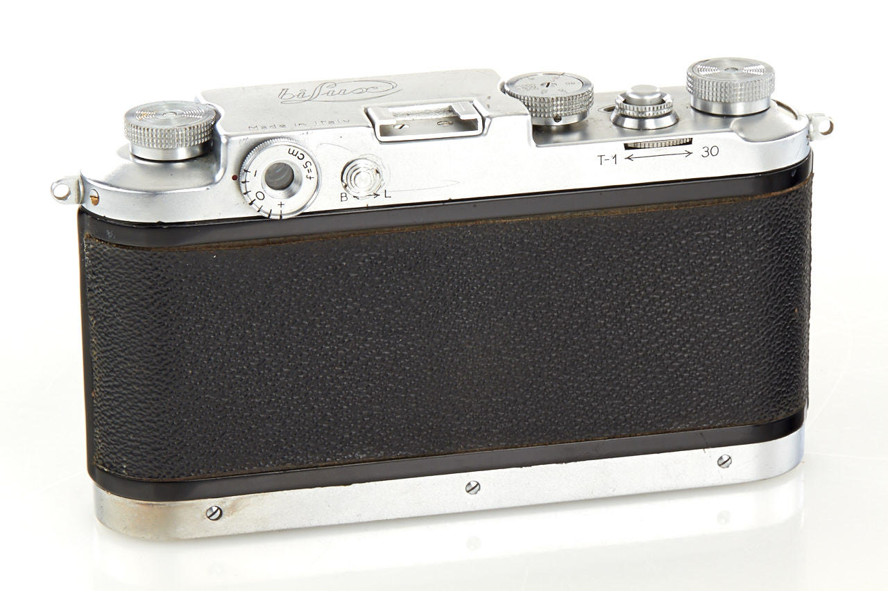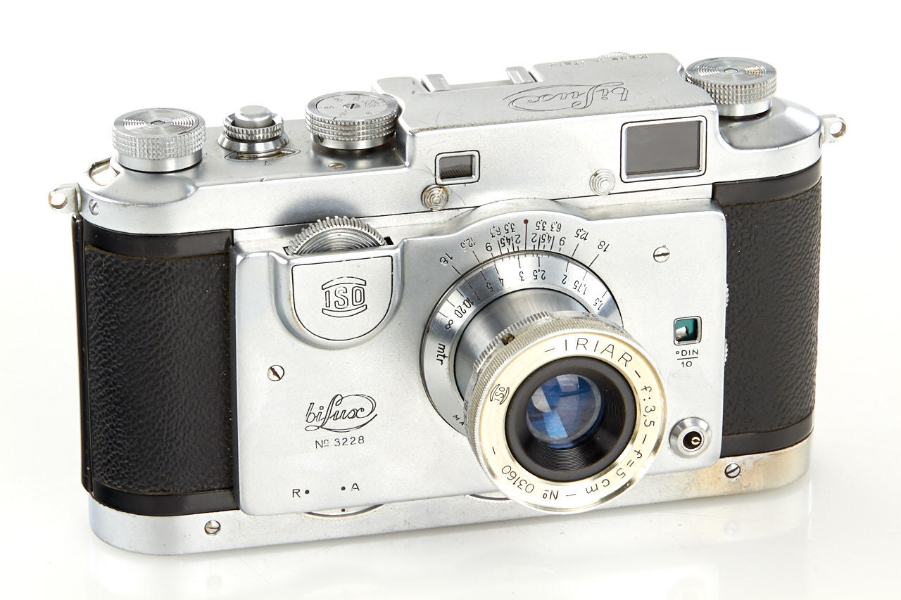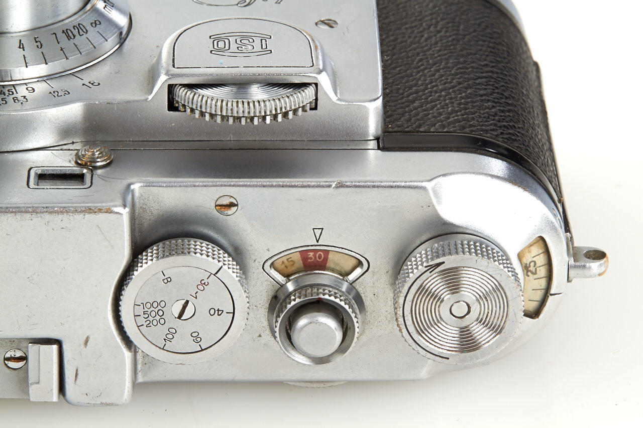 beautiful and rare Italian Leica copy with folding trigger in base plate, in very fine and perfect working condition, Iriar 3.5/5cm lens no.03160, lens cap, original everready case
