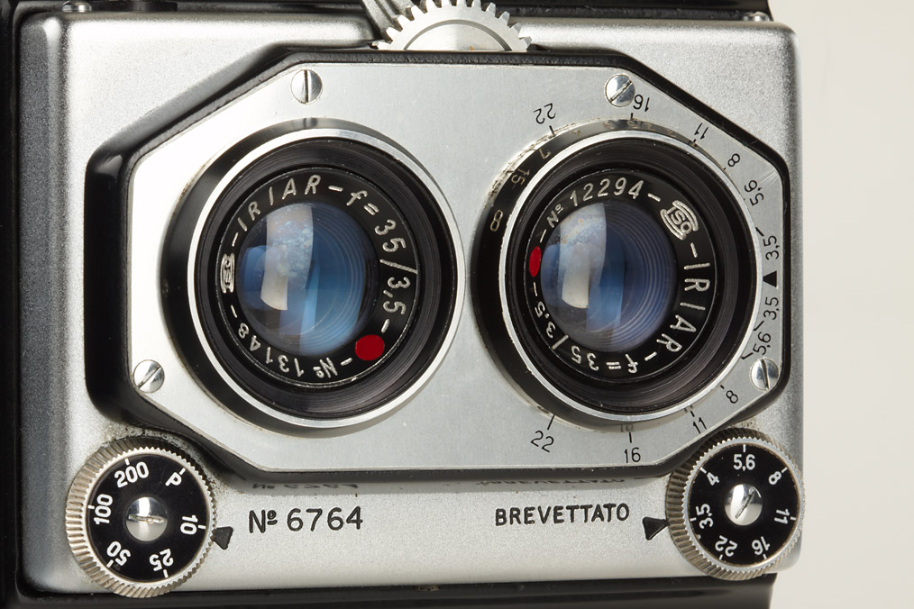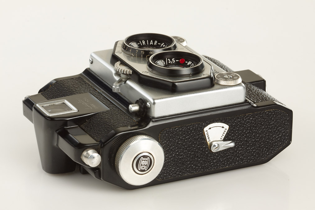 35mm stereo camera in near mint condition with a pair of Iriar 3.5/35mm lenses nos.12294/13148, case, film cutter with frames in maker's box, slide viewer in maker's box