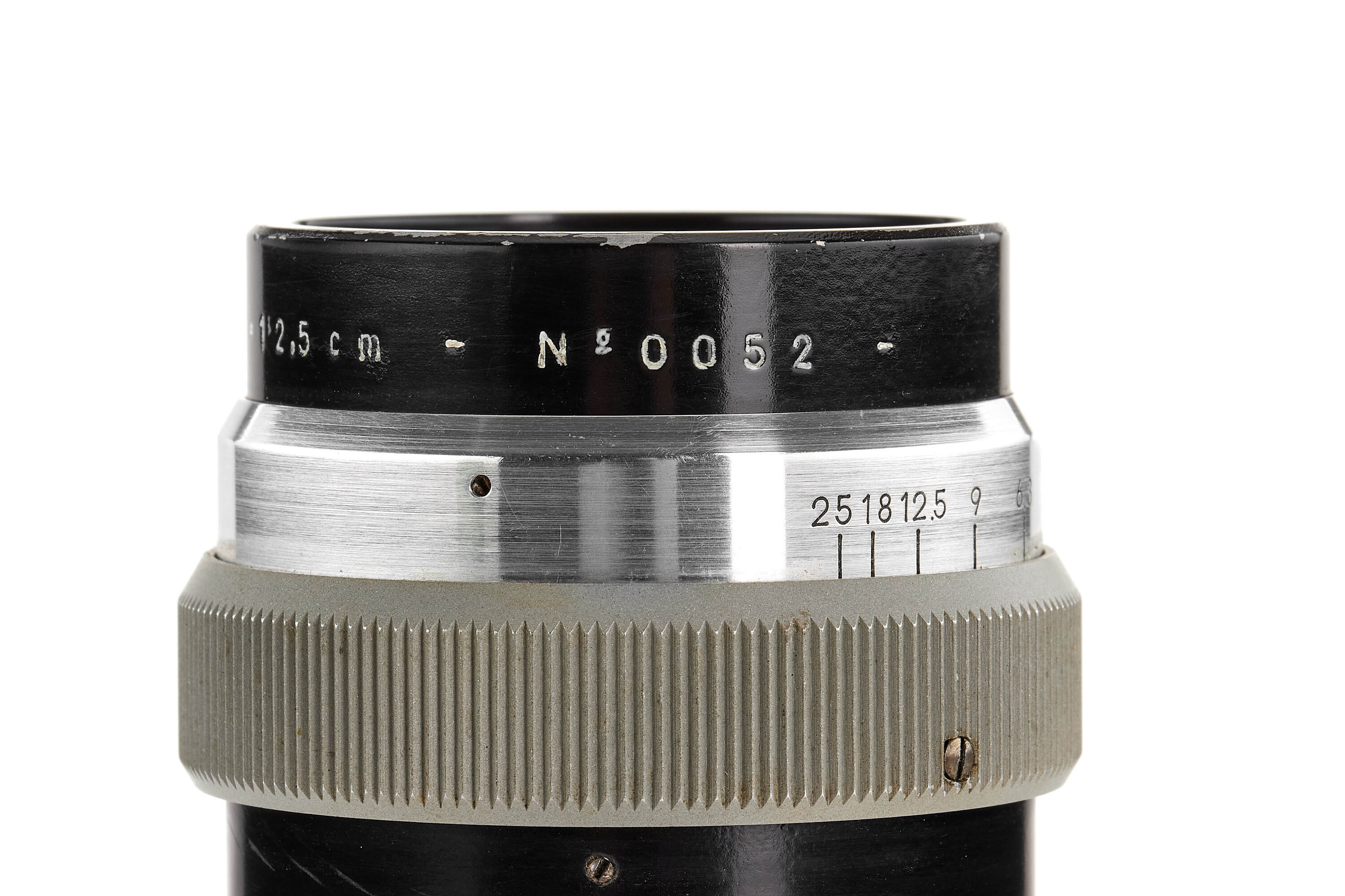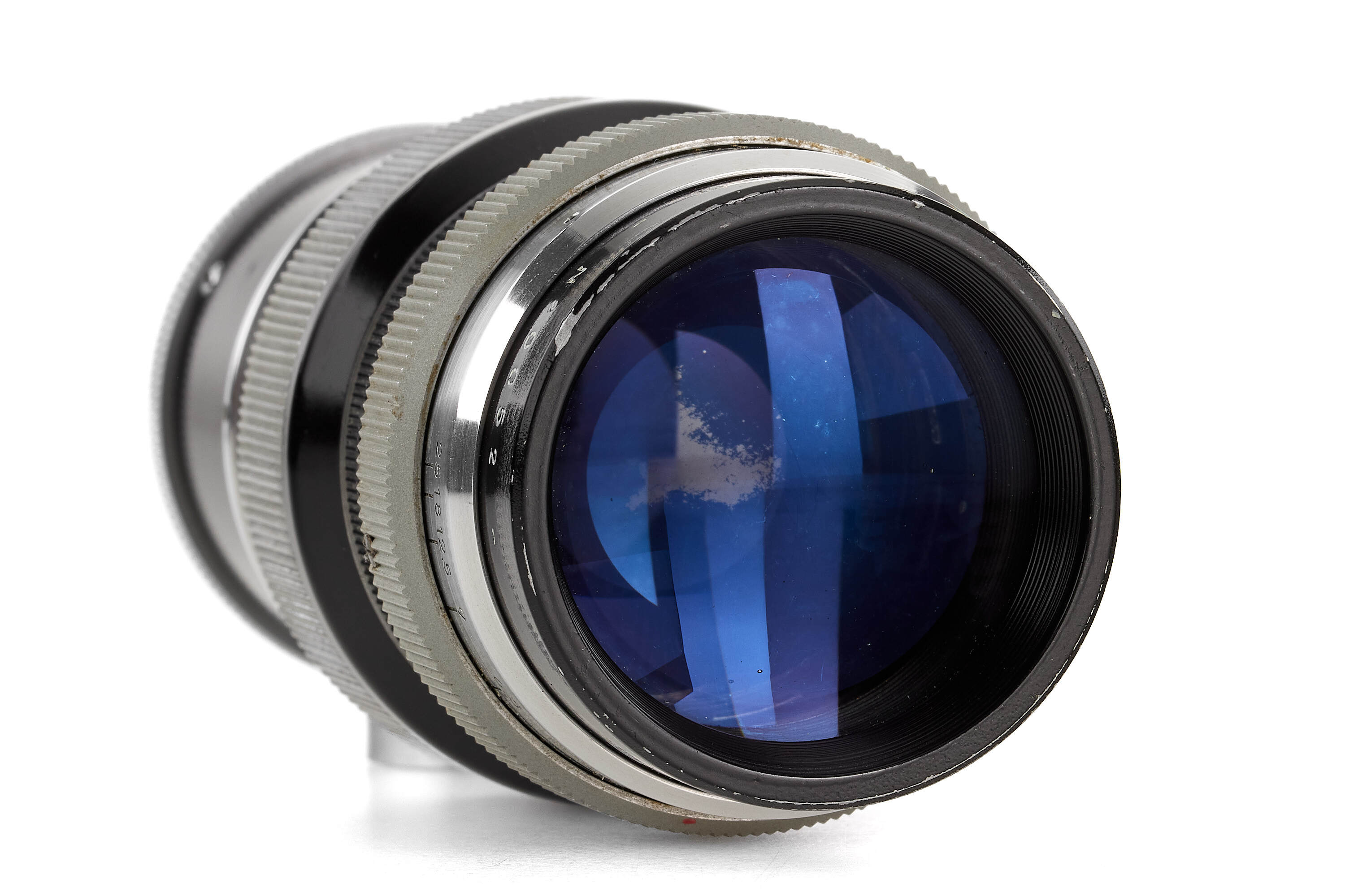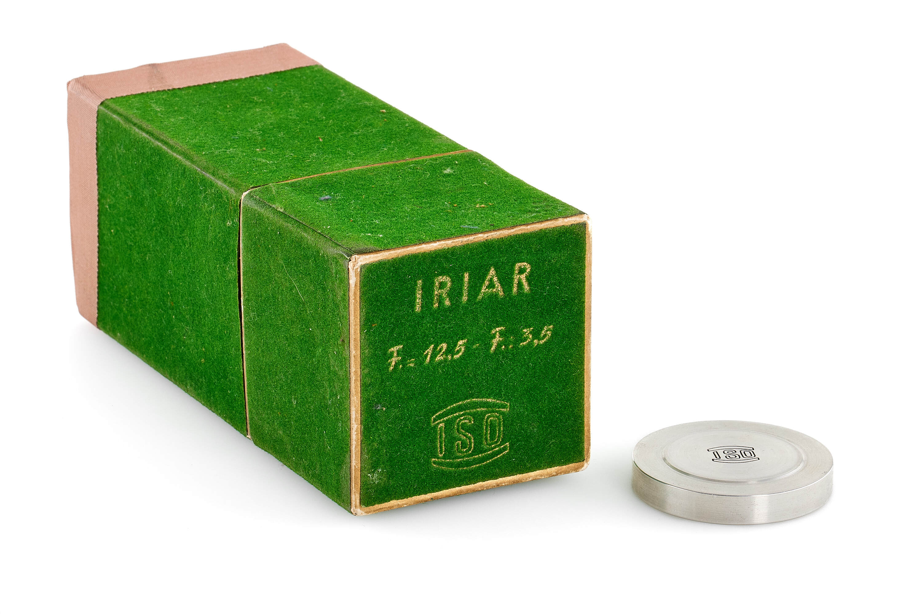 Extremely rare Italian ISO telephoto lens prototype in rangefinder-coupled M36 screw mount for the ISO Bilux camera. This experimental lens, known only from a 1951 ISO advertisement and believed never to have gone into series production, is preserved in exceptional, near-mint condition. The coated optics show only faint traces of previously removed fungus. The set includes the original ISO metal front cap, a special rear cap containing a rare 12.5 cm finder adapter, and the original green maker’s box.