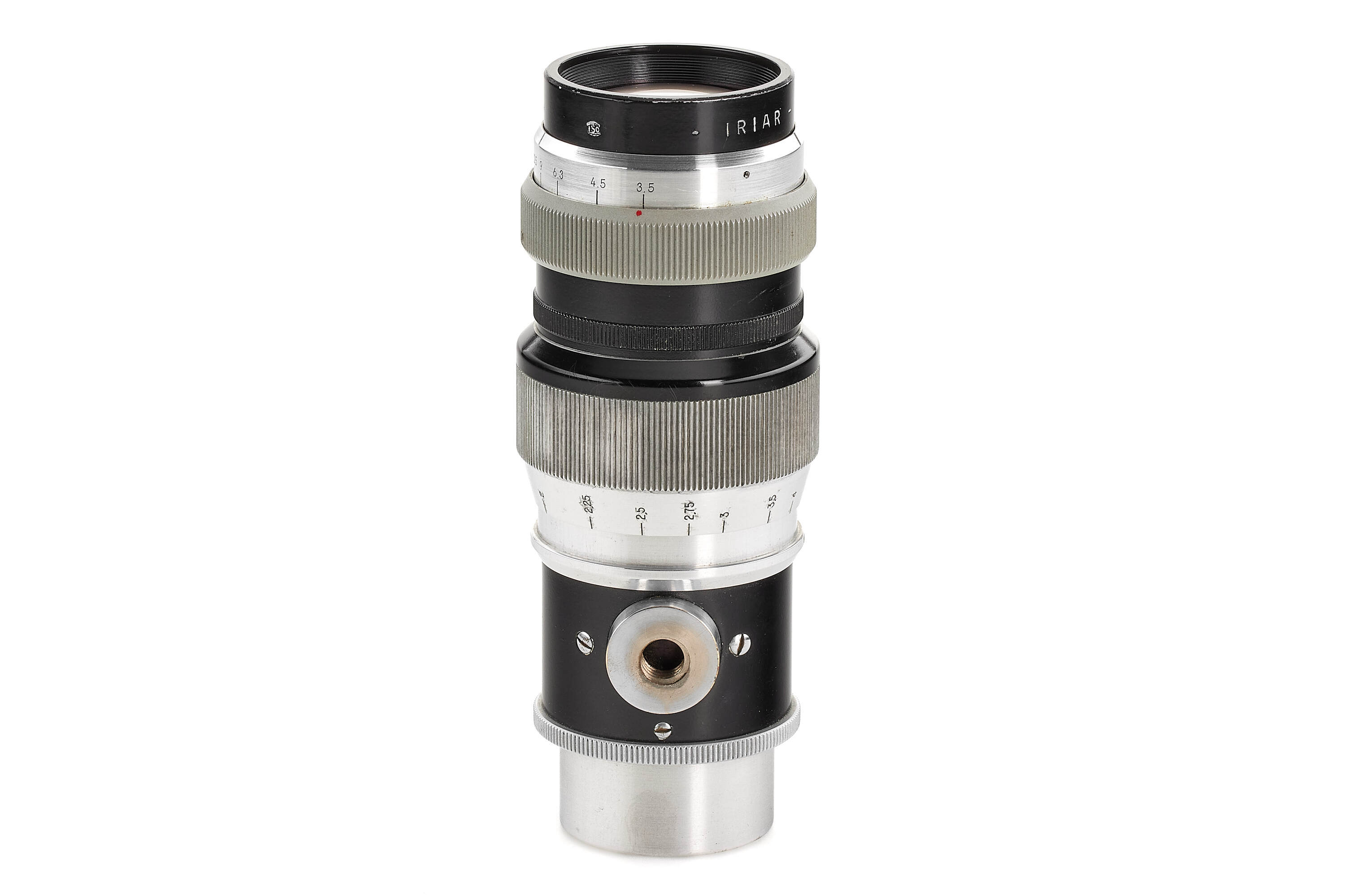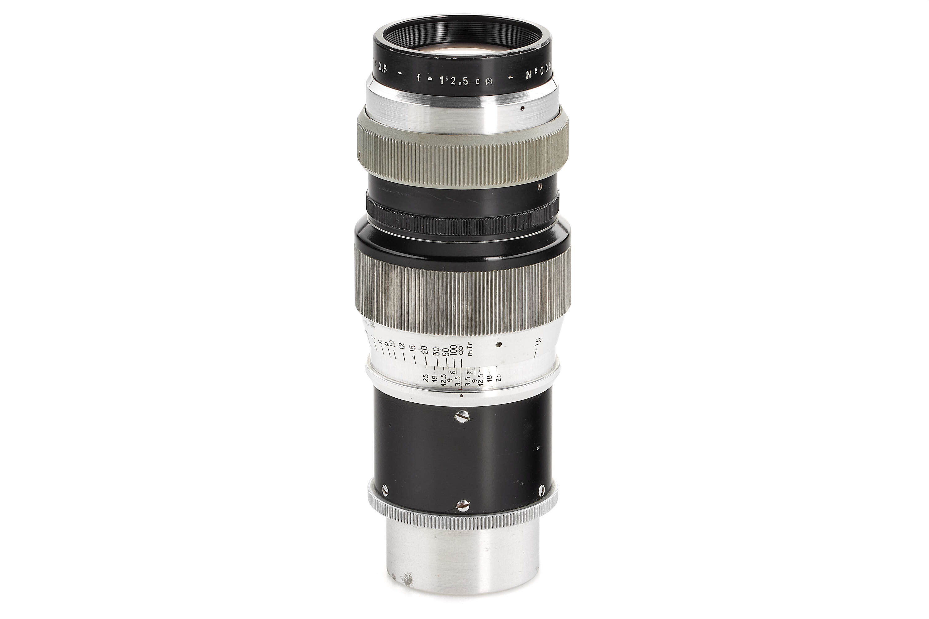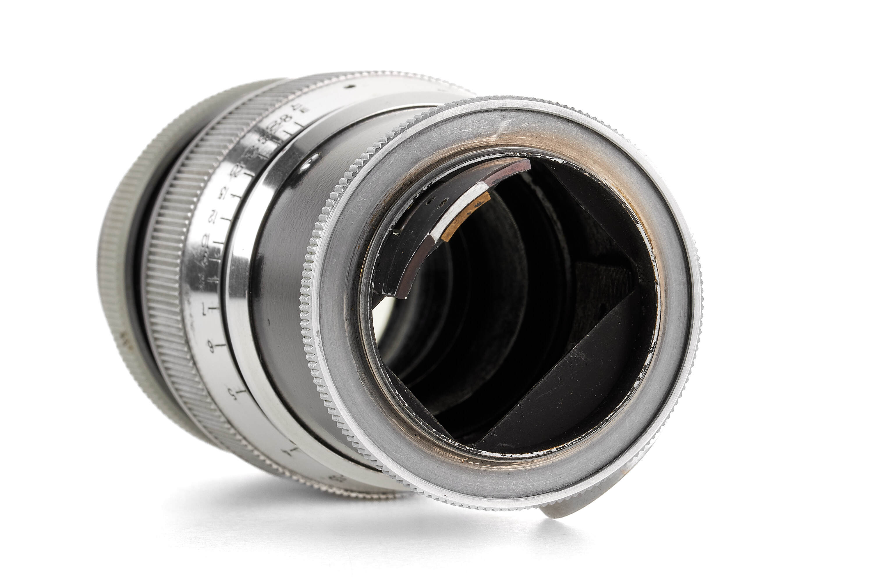 Extremely rare Italian ISO telephoto lens prototype in rangefinder-coupled M36 screw mount for the ISO Bilux camera. This experimental lens, known only from a 1951 ISO advertisement and believed never to have gone into series production, is preserved in exceptional, near-mint condition. The coated optics show only faint traces of previously removed fungus. The set includes the original ISO metal front cap, a special rear cap containing a rare 12.5 cm finder adapter, and the original green maker’s box.