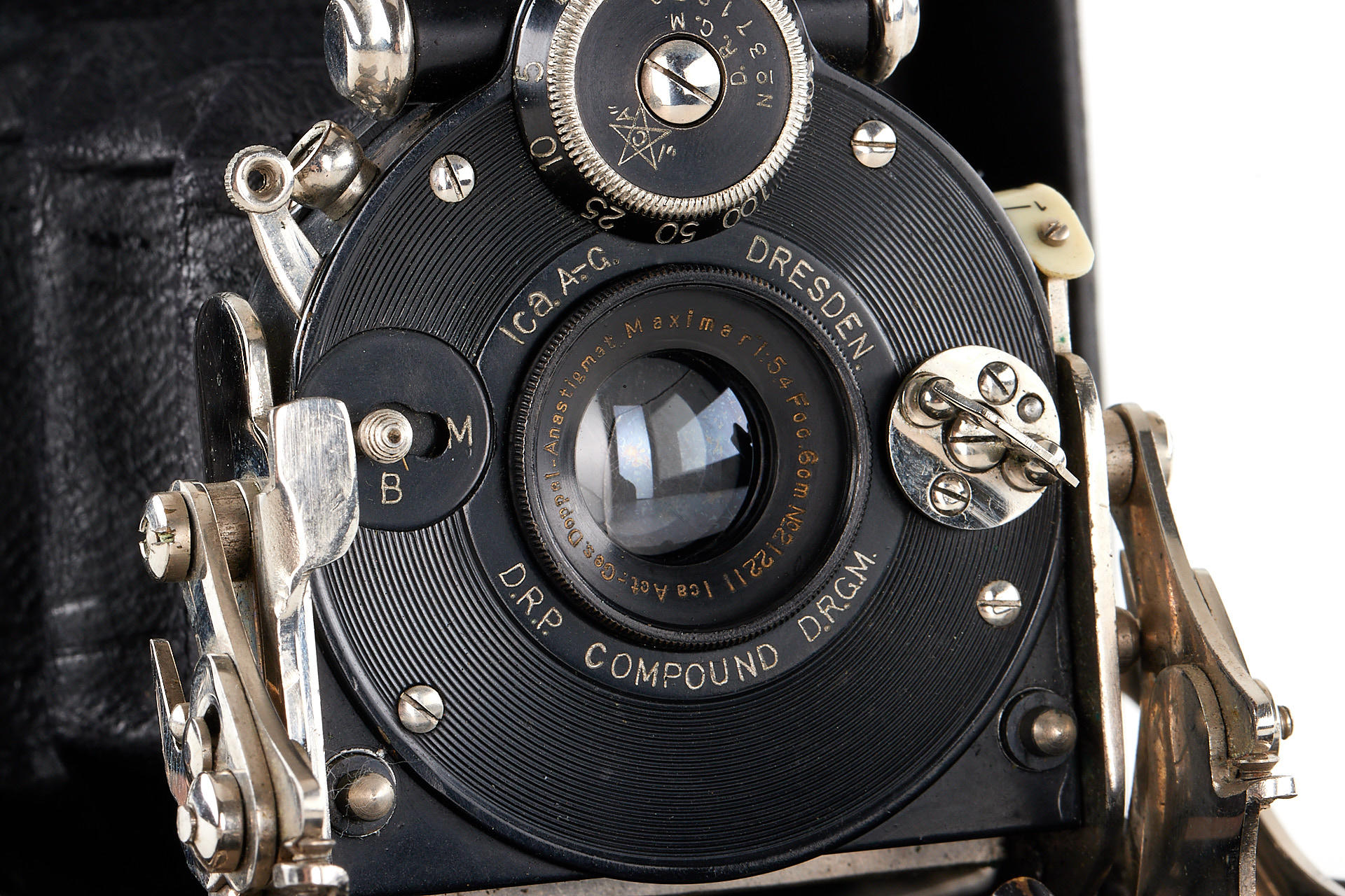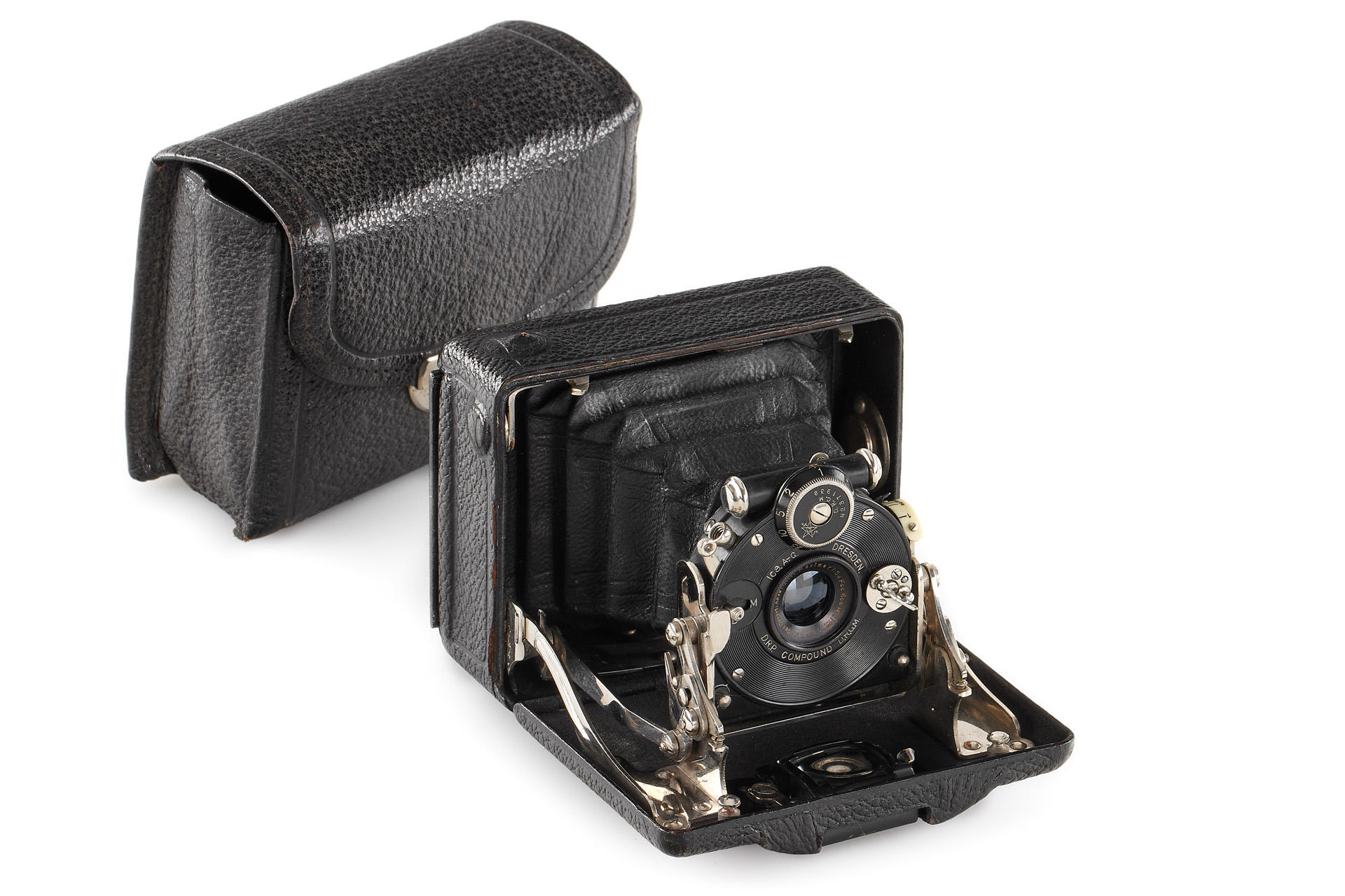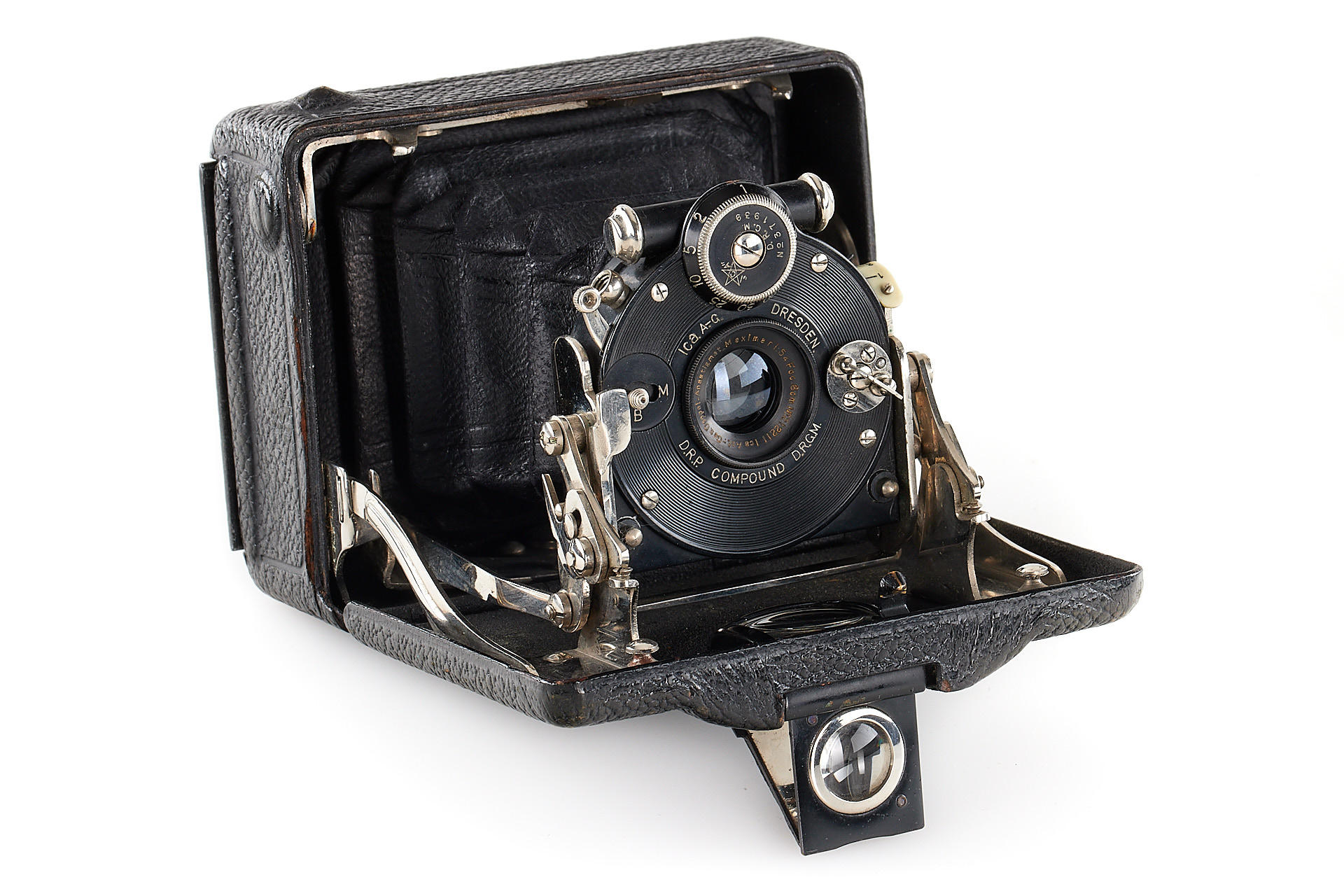 uncommon horizontal version (with special folding viewfinder built into the bed for vertical exposures), in very good condition, with Maximar 5.4/6cm no.212211 mounted in Compound shutter, with groundglass and original leather case