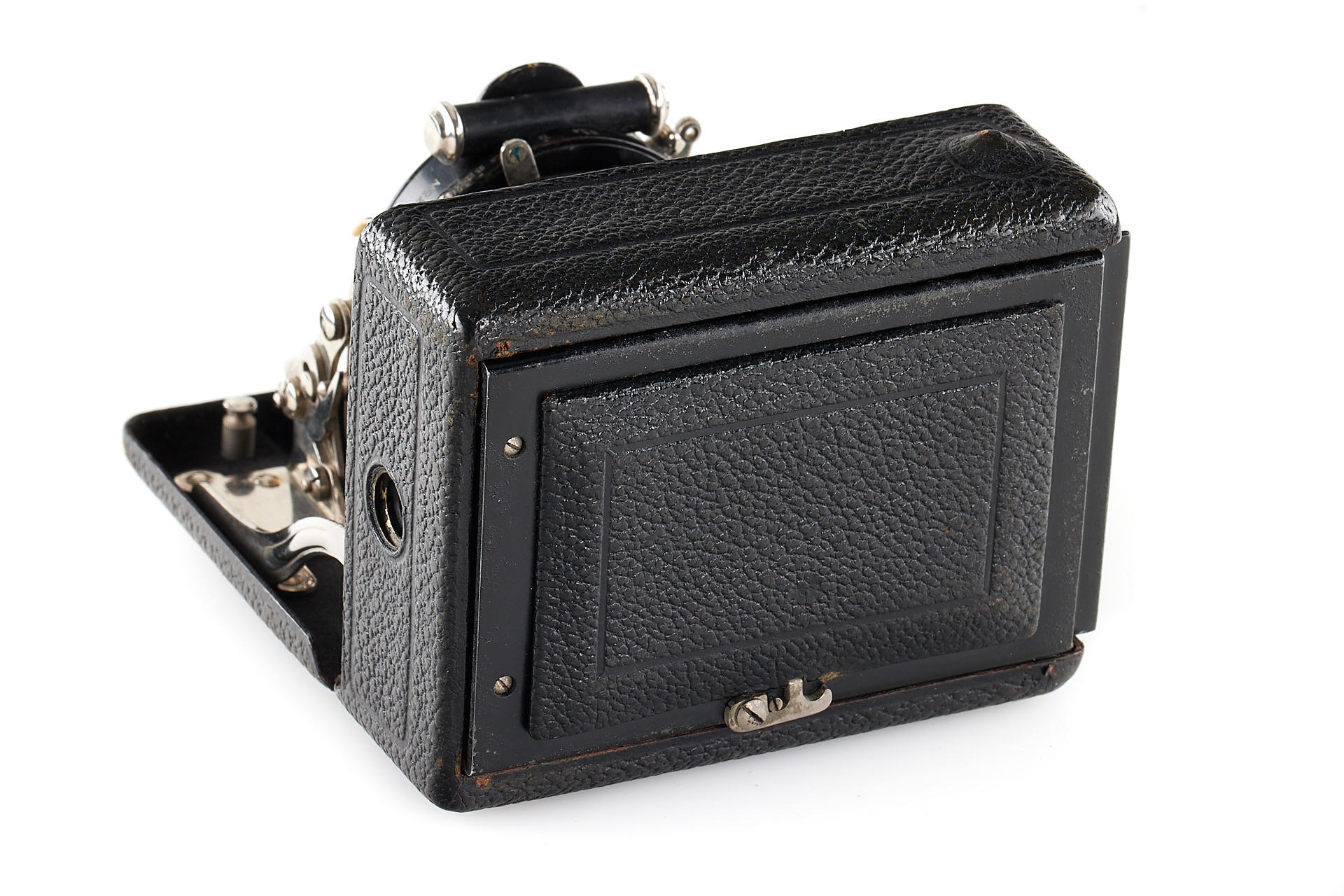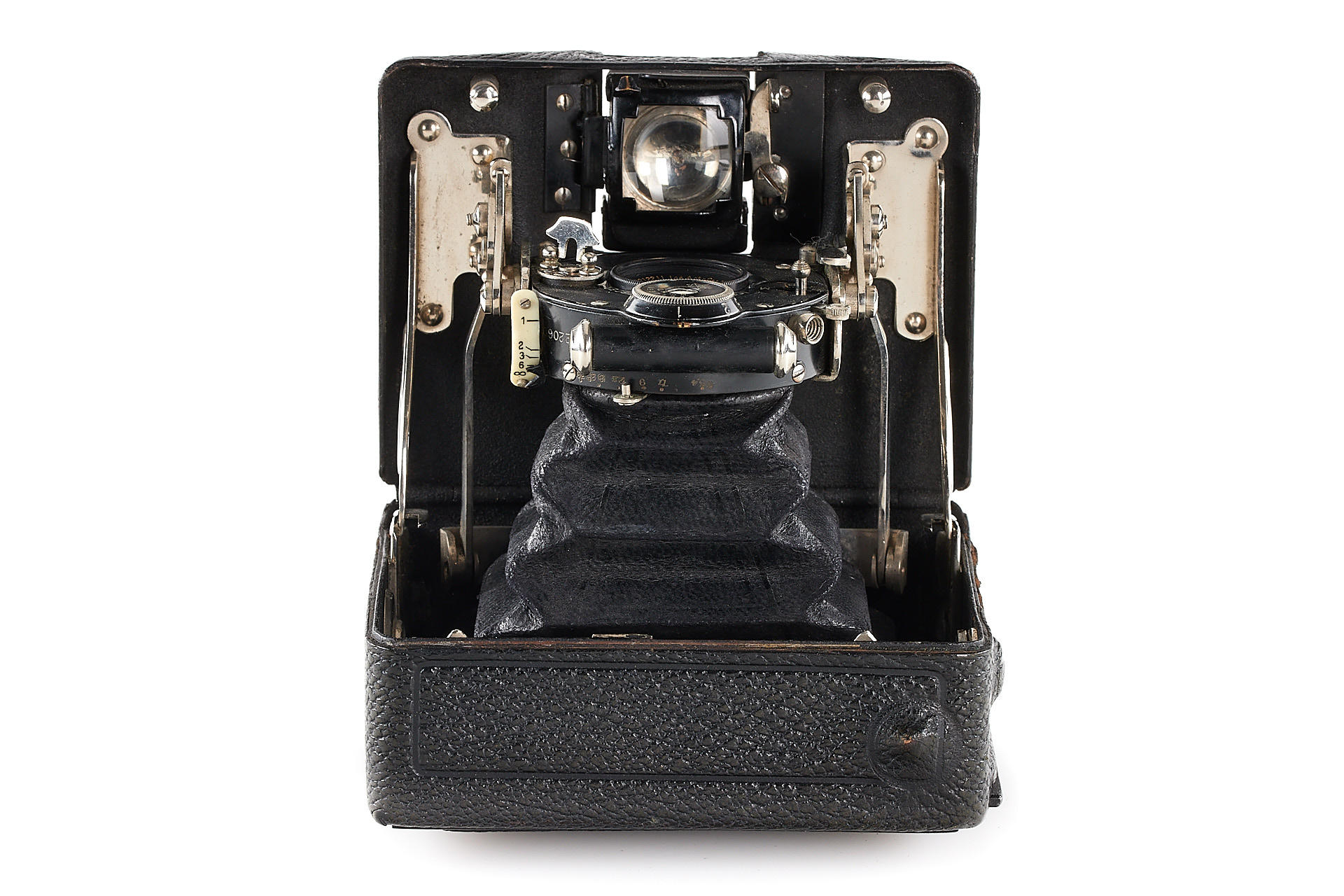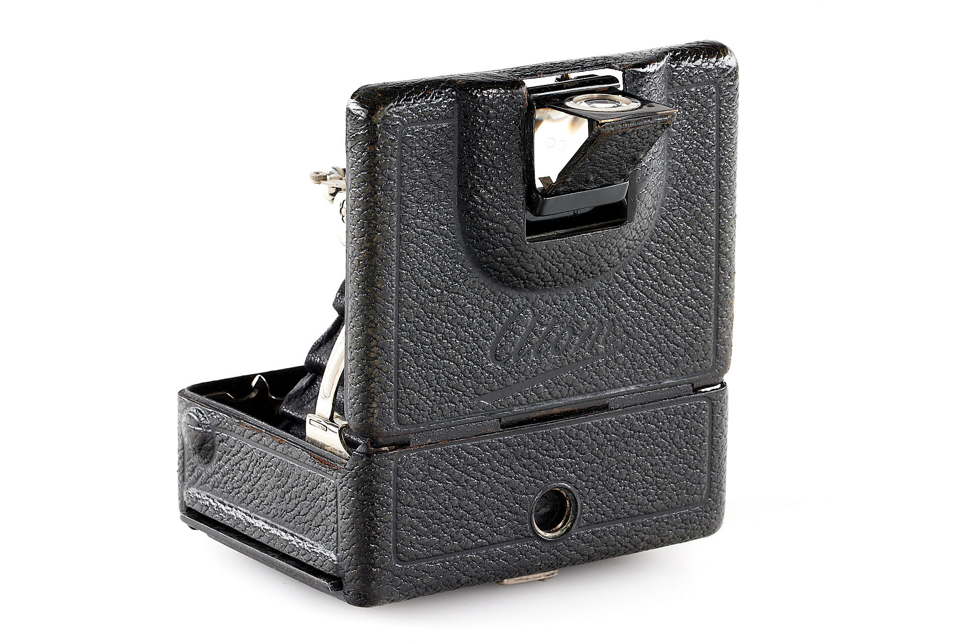 uncommon horizontal version (with special folding viewfinder built into the bed for vertical exposures), in very good condition, with Maximar 5.4/6cm no.212211 mounted in Compound shutter, with groundglass and original leather case