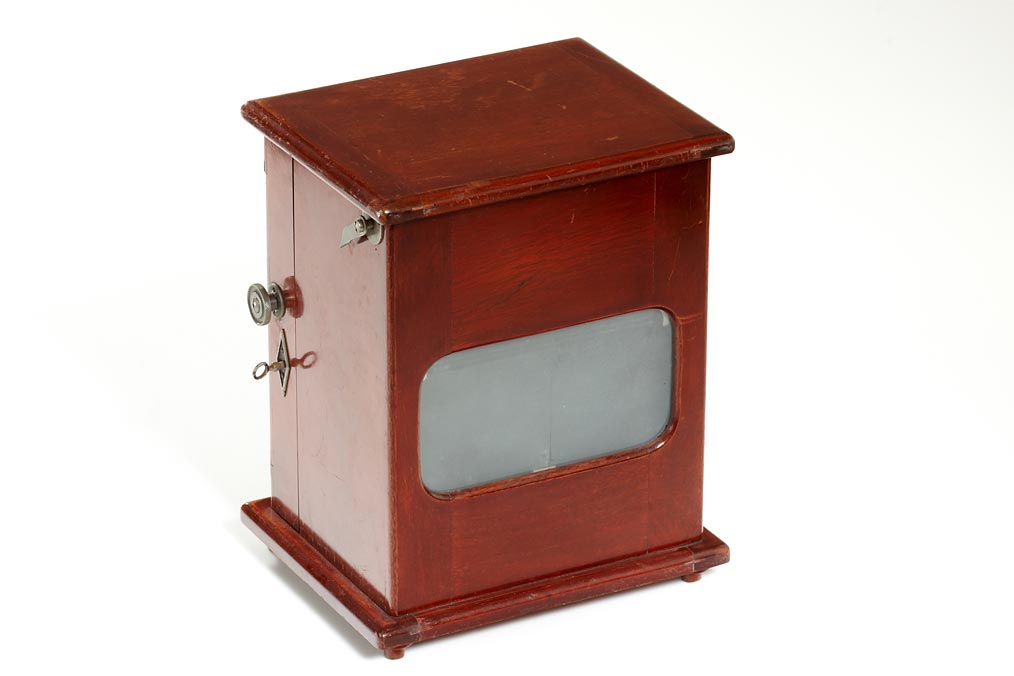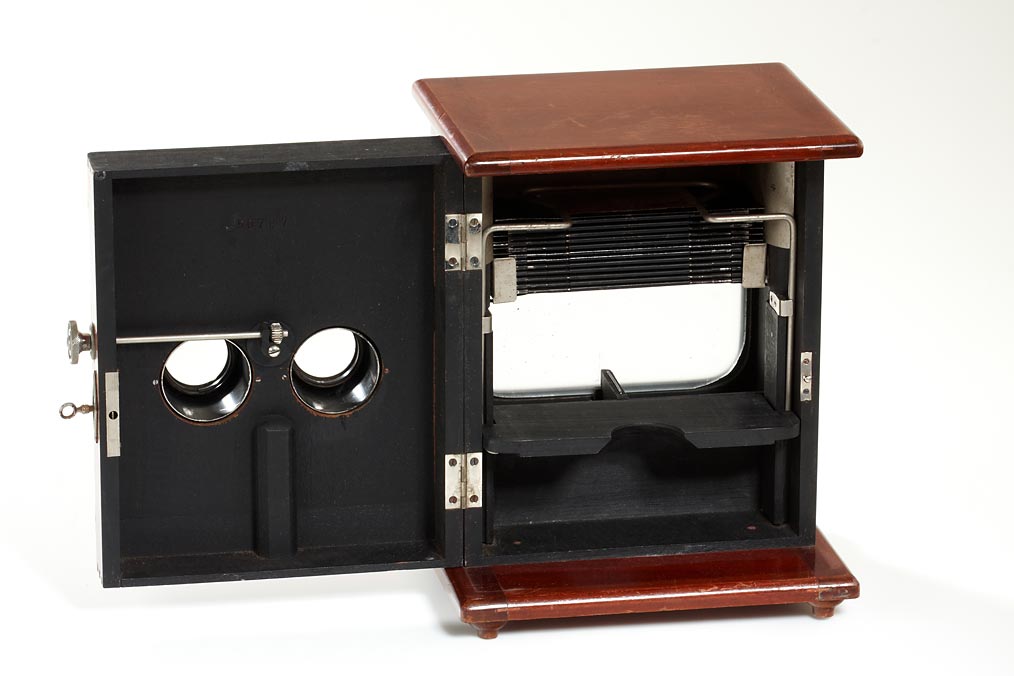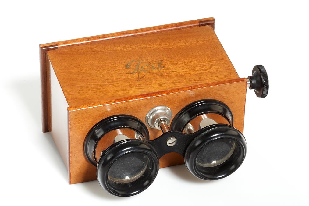 set of two viewers made by Ica Dresden, (1) sought-after 'Stereospekt' table-top viewer with brass makers label on the front, this compact multiple viewer is adapted for sets of 12 glass slides mounted in folded fan fashion in die-stamped metal frames, a lever (top right)releases the pictures one by one, rack and pinion focus (2) handheld ICA stereoscope with rack and pinion focus for 45x107 glass slides. ICA pentagram logo on top side, in perfect condition. A wonderful and highly collectable pair of two classic German viewers! (2)
