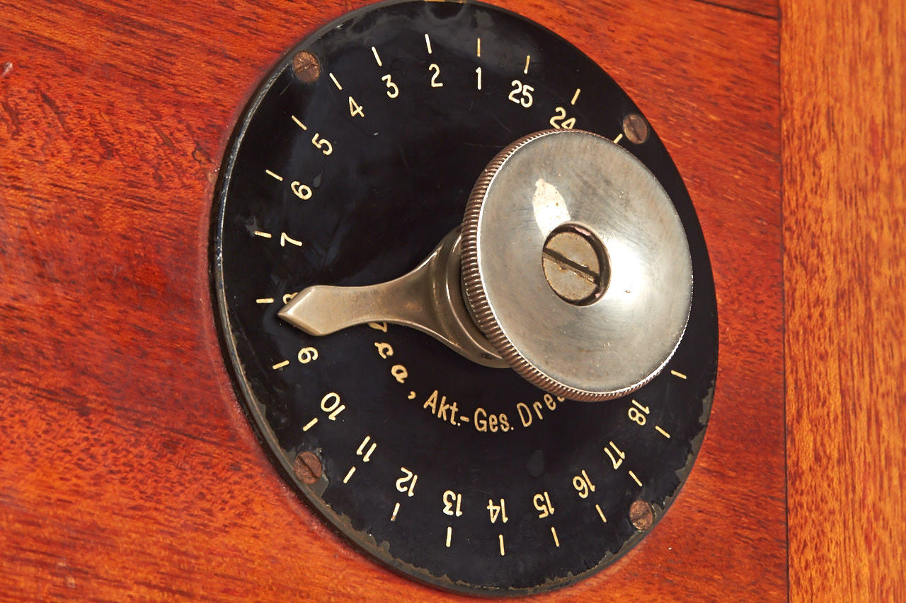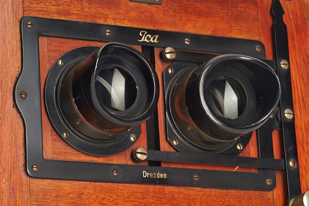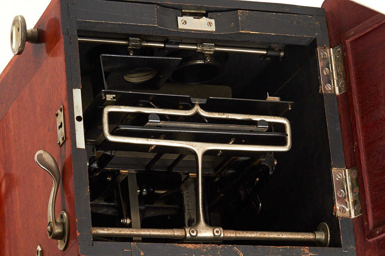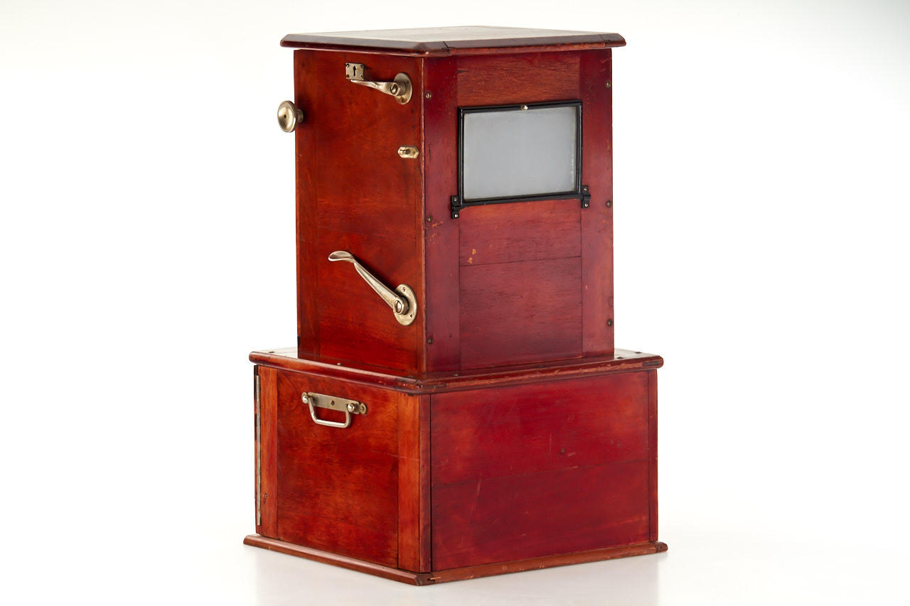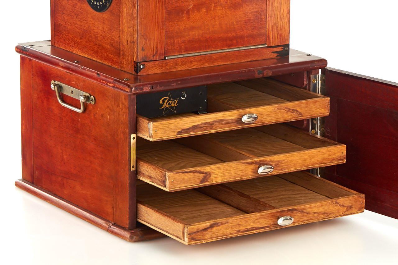 large table-top stereo viewer for 43x107mm plates in special cassettes, built-in drawers for storage, with one cassette with 23 glass plates with pictures