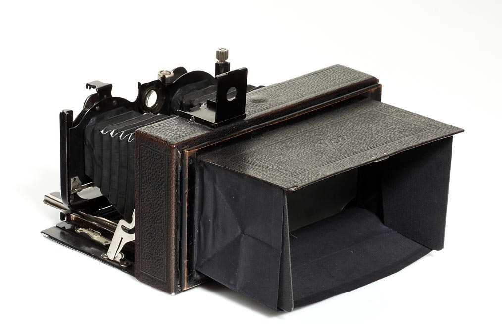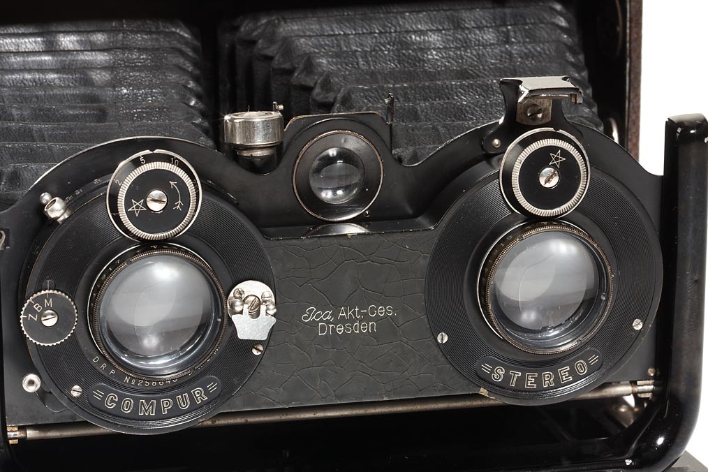 9x18cm, folding stereo camera with a pair of Tessar 4.5/12cm lenses nos.441917/9 in Compur Stereo shutter, dealers engraving at the inside of door: Foto-Martinec Kr. Vinohrady
