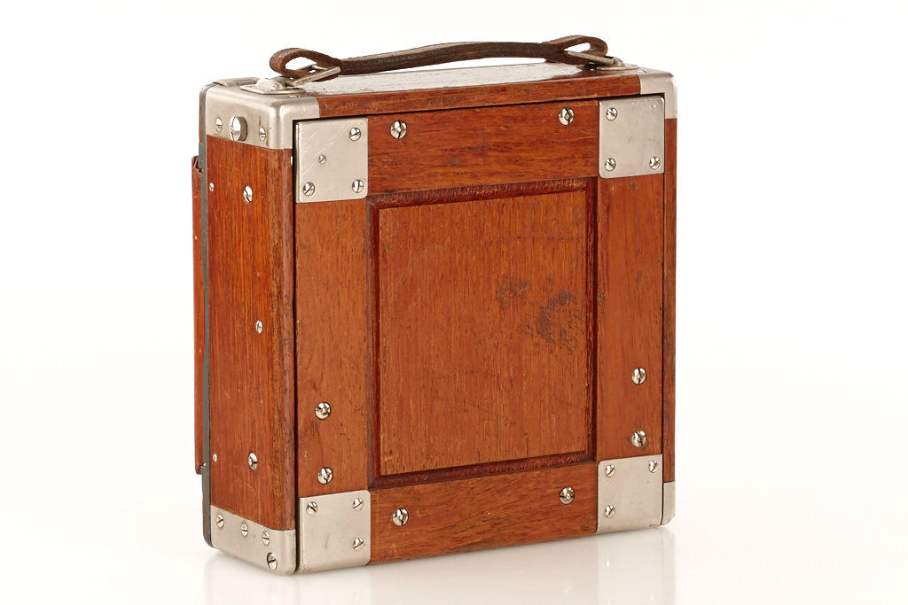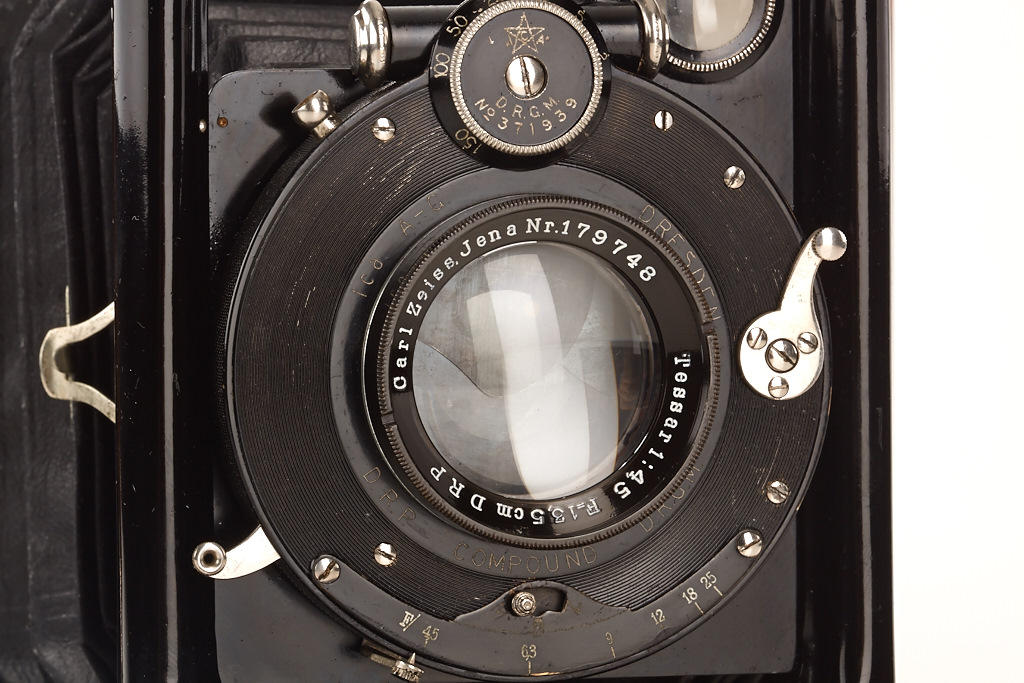 rare 9x12cm folding bed camera with nickel fittings, black leather bellows, adjustable back, in good original condition with Tessar 4.5/13.5cm no.179748 in Compound shutter