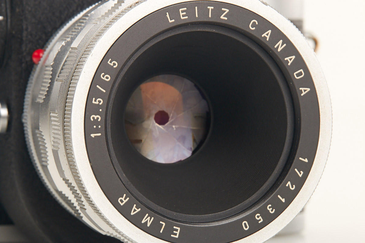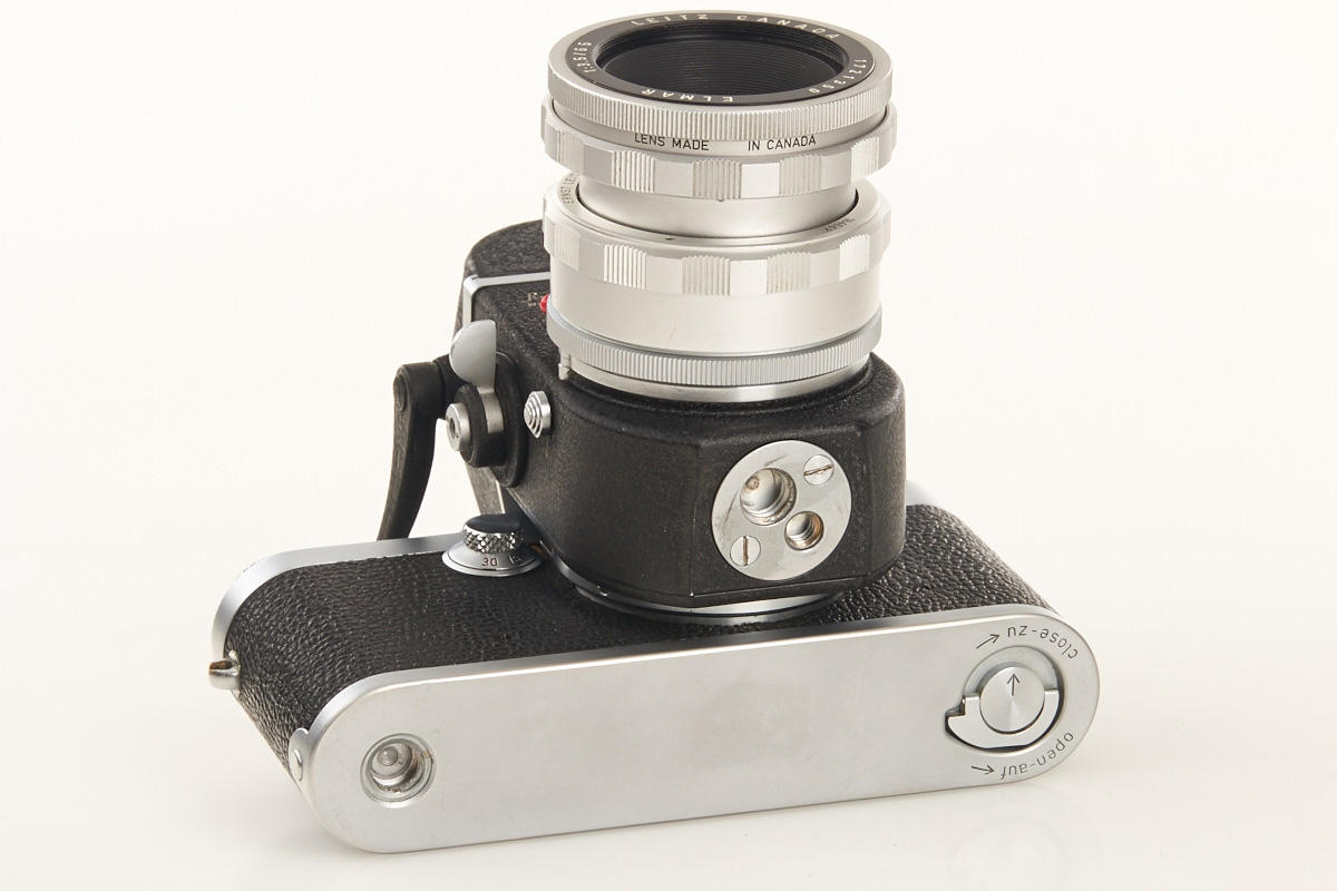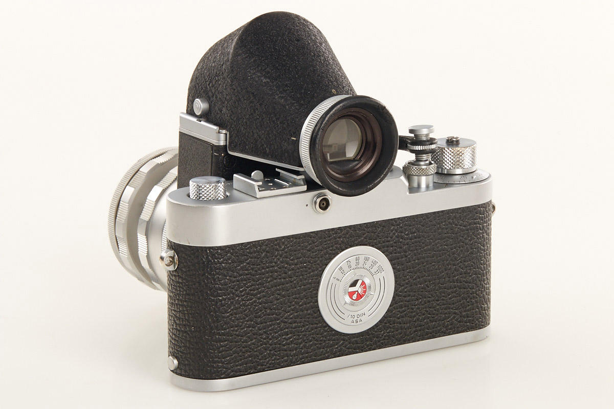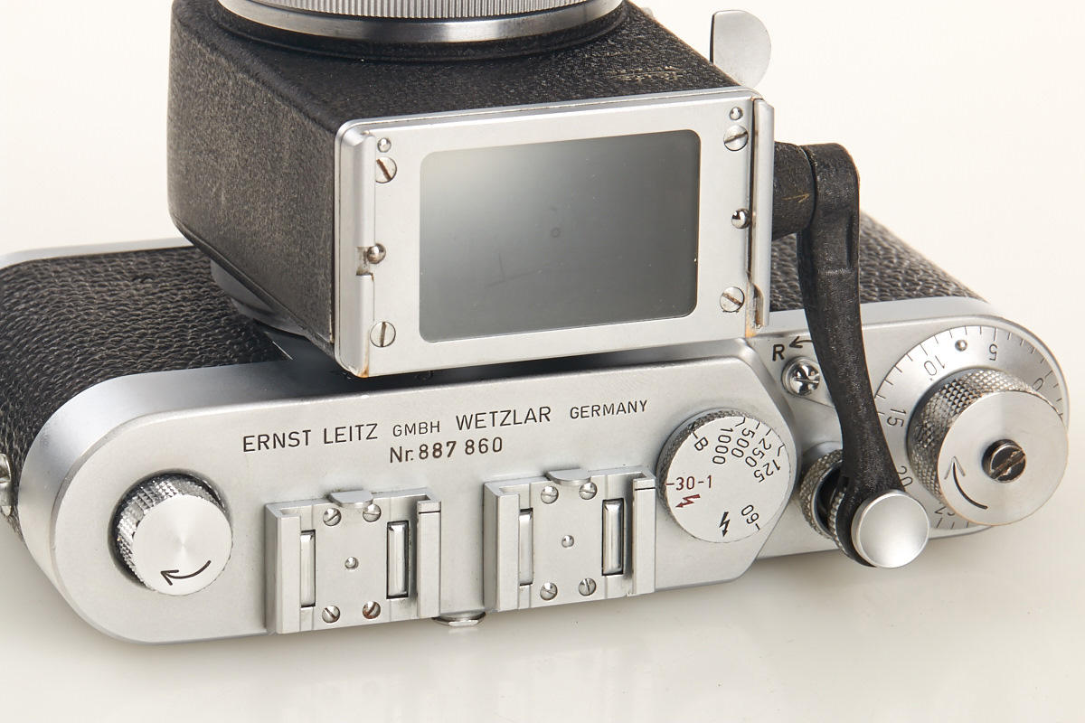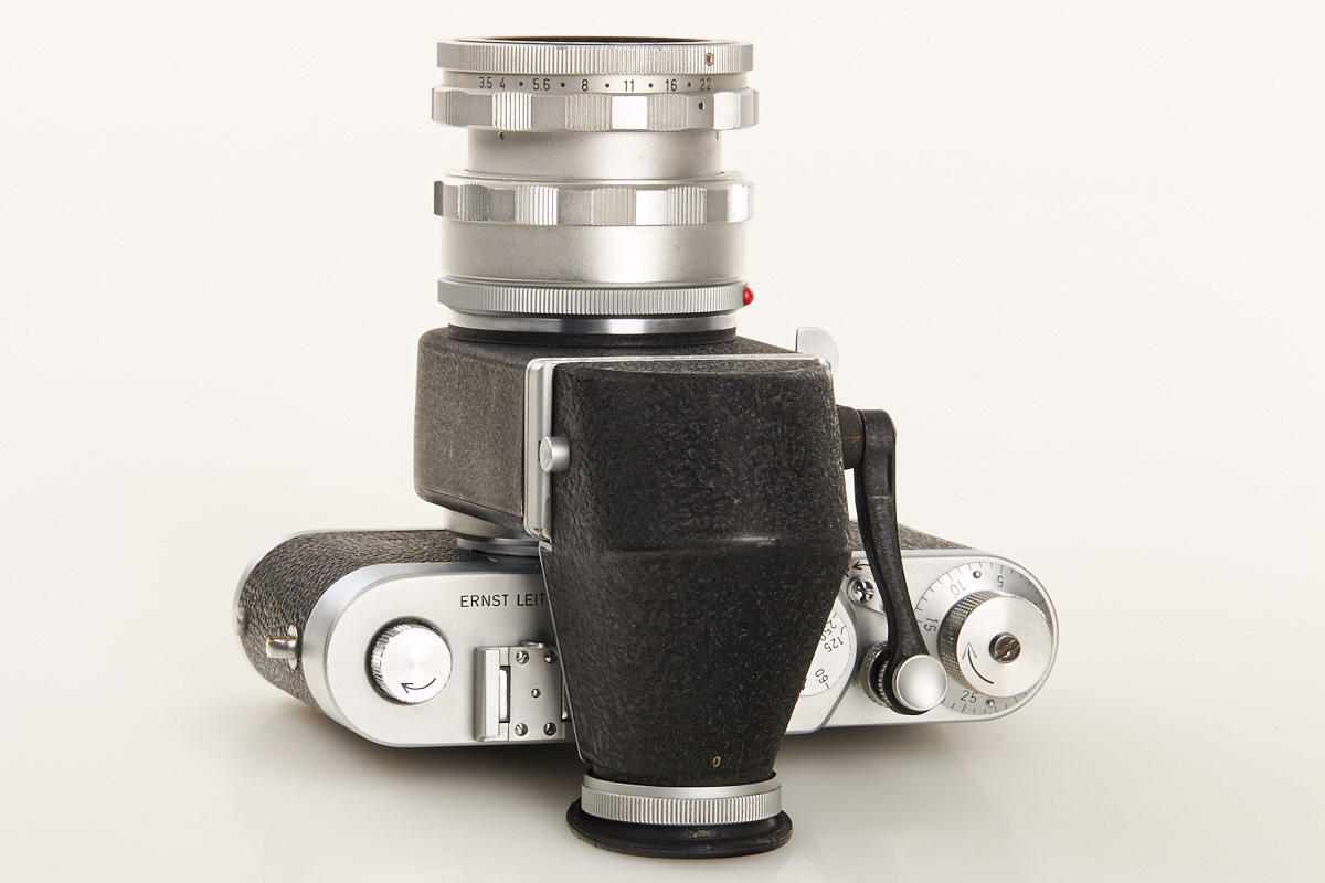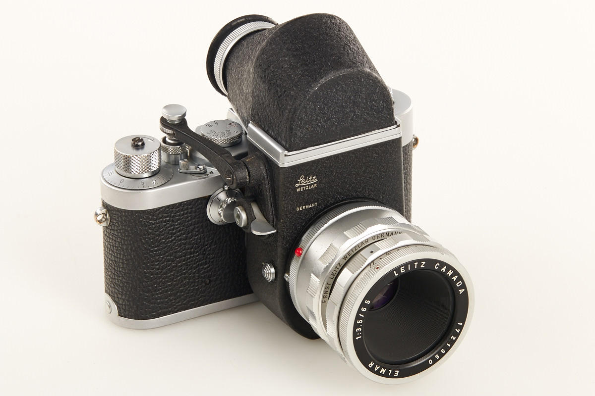 body from the first production year with modified winding knob, Visoflex II (box) with prism finder and chrome Elmar 3.5/65mm no.1721350 in OTZFO short focusing mount (good lenses)