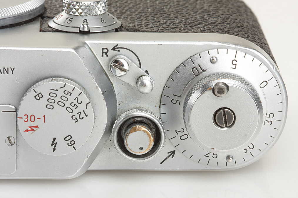 rare modified Ig for use in Siemens electron microscopes (without accessory shoe, strap lugs, synchronisation are removed), modified wind knob with drive pin, cap