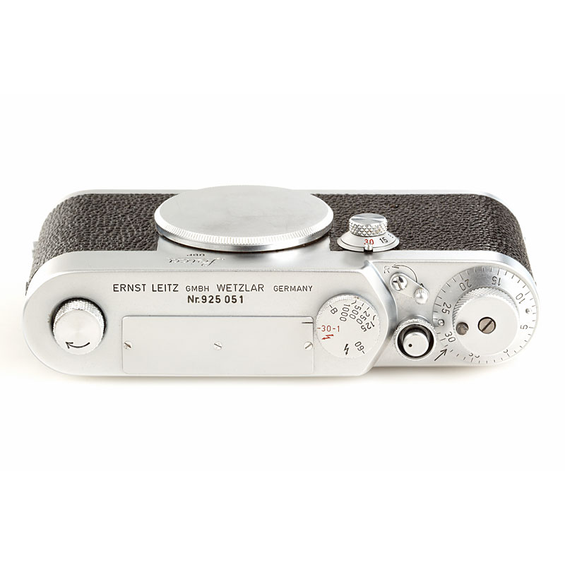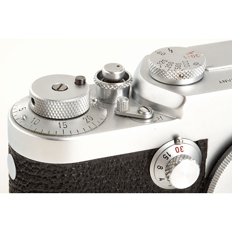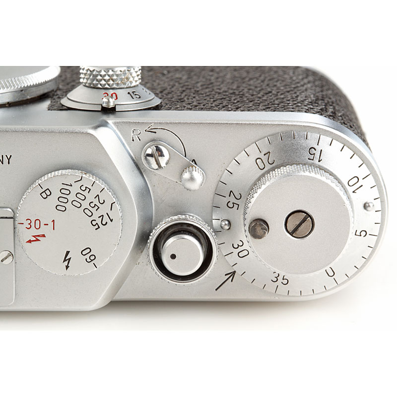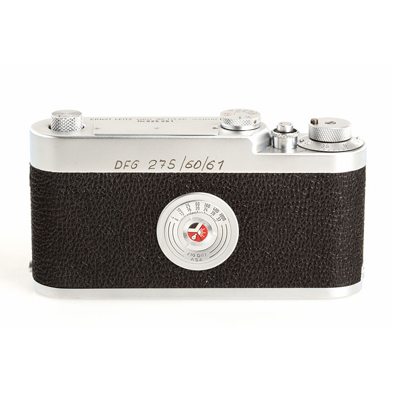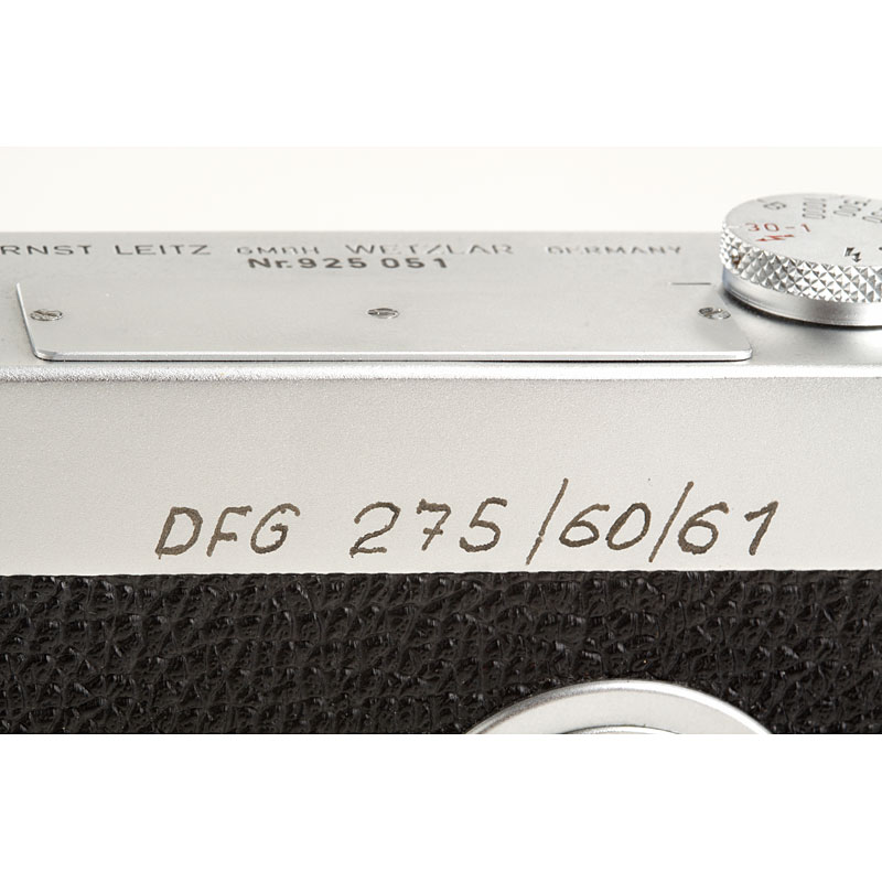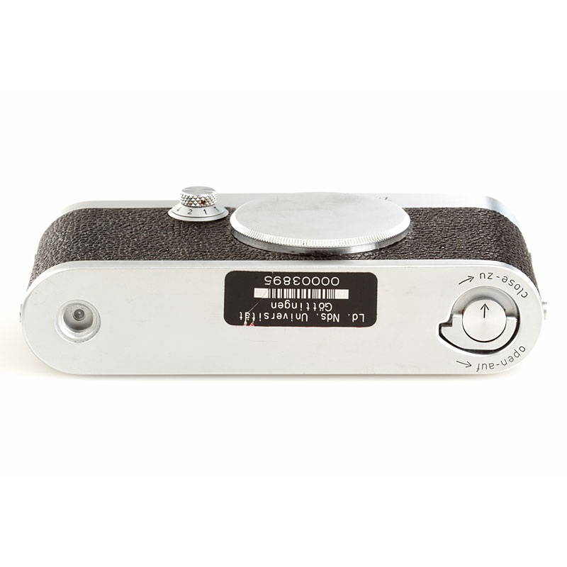 rare modified Ig for use with Siemens electron microscopes (this special version has no accessory shoe, strap lugs and synchronisation), modified wind knob with drive pin (cap), 'FDG 275/60/61' engraved on back of top plate, 'Ld. Nds. Universität Göttingen 00003895' sticker on base plate