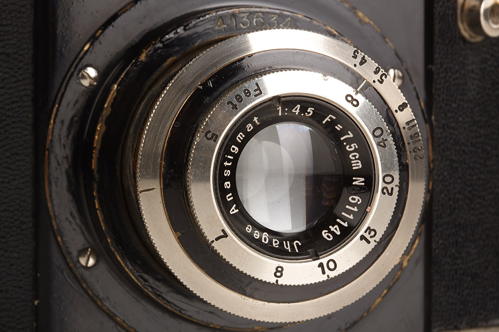 very rare first type black Ihagee Junior with 'sun' logo engraved on name plate, without flash sockets, Anastigmat 4.5/7.5cm no.611149 (cap), in original condition (shutter not operable as usual)