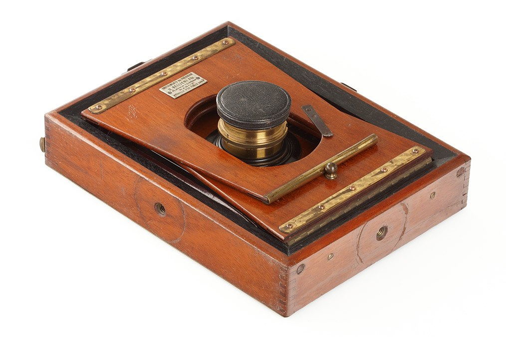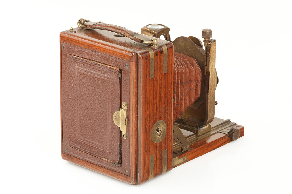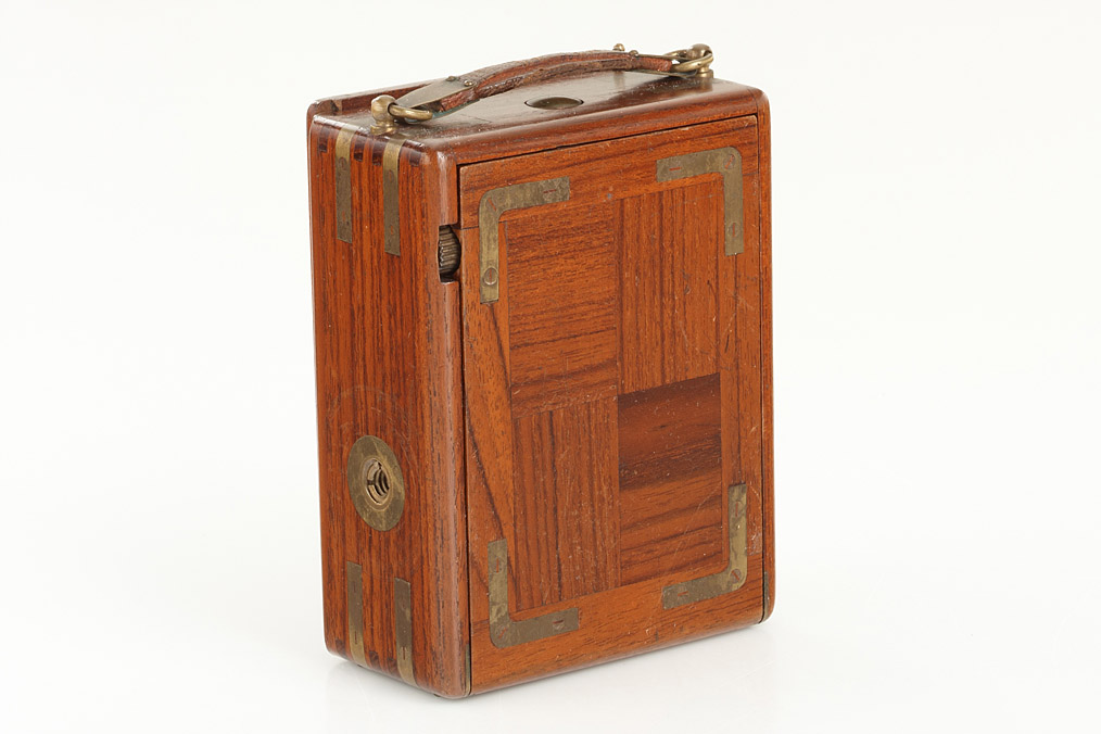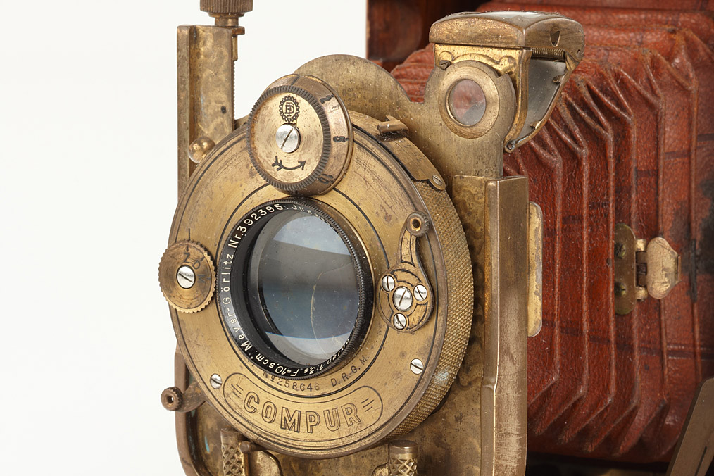 6.5x9cm tropical folding plate camera, polished teak wooden body, brass fittings, brown leather bellows, Hugo Mayer Trioplan 3.8/10.5cm no.392395 in gilt Compur shutter, rare camera in fine condition with original screen adapter