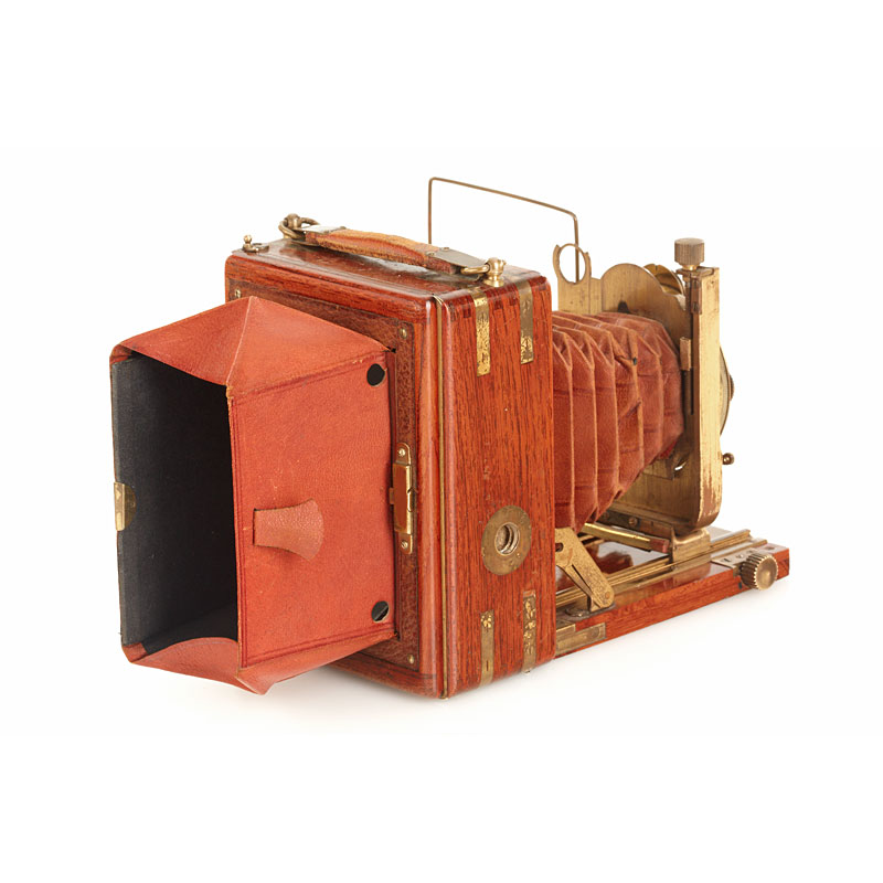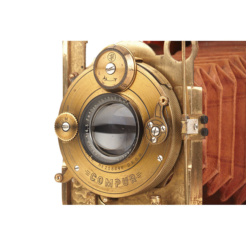 6.5x9cm tropical folding plate camera, polished teak wooden body, brass fittings, brown leather bellows, Goerz Dogmar 4.5/10cm no.591797 in gilt Compur shutter, rare camera with original screen adapter, reflex finder missing
