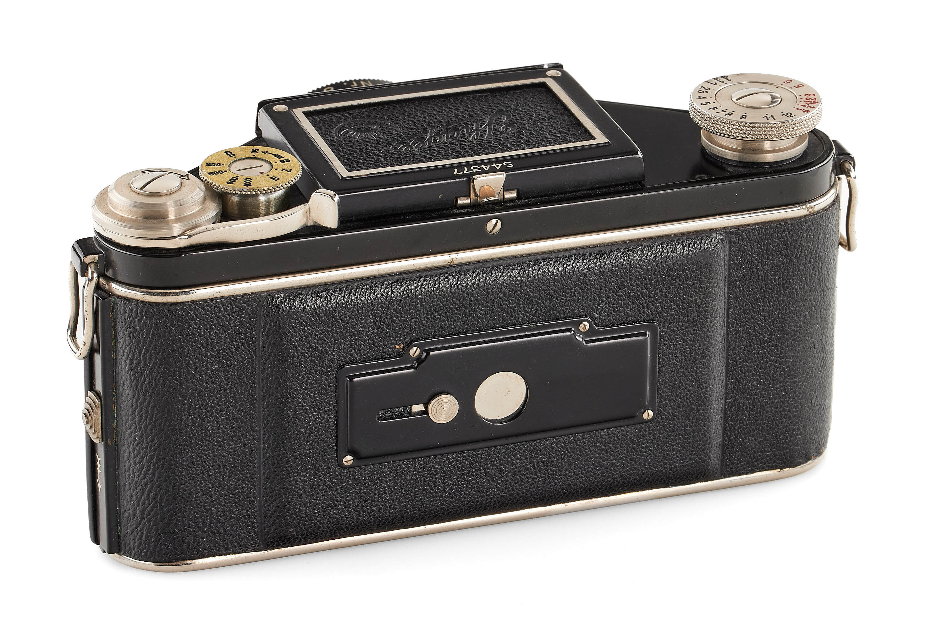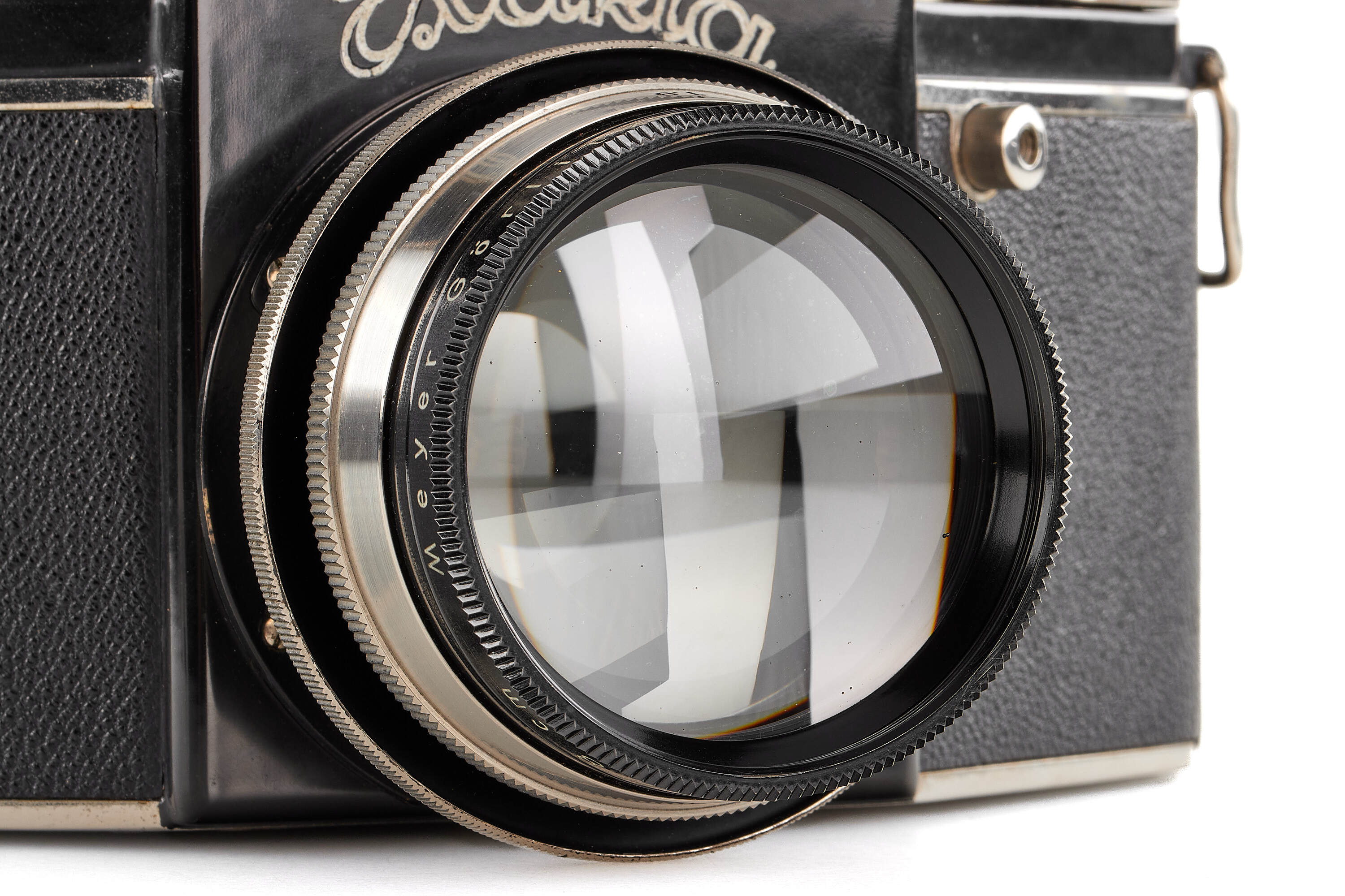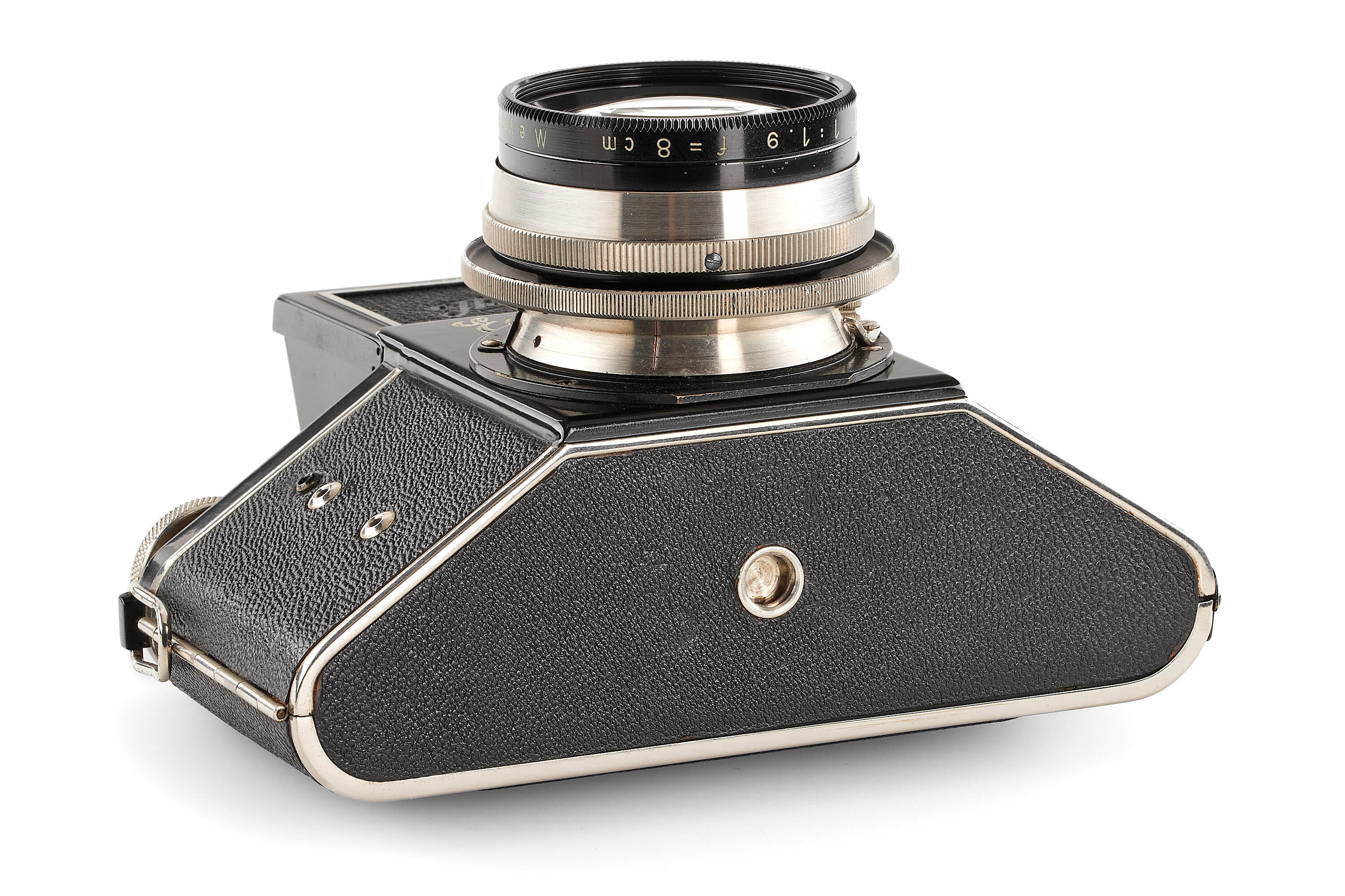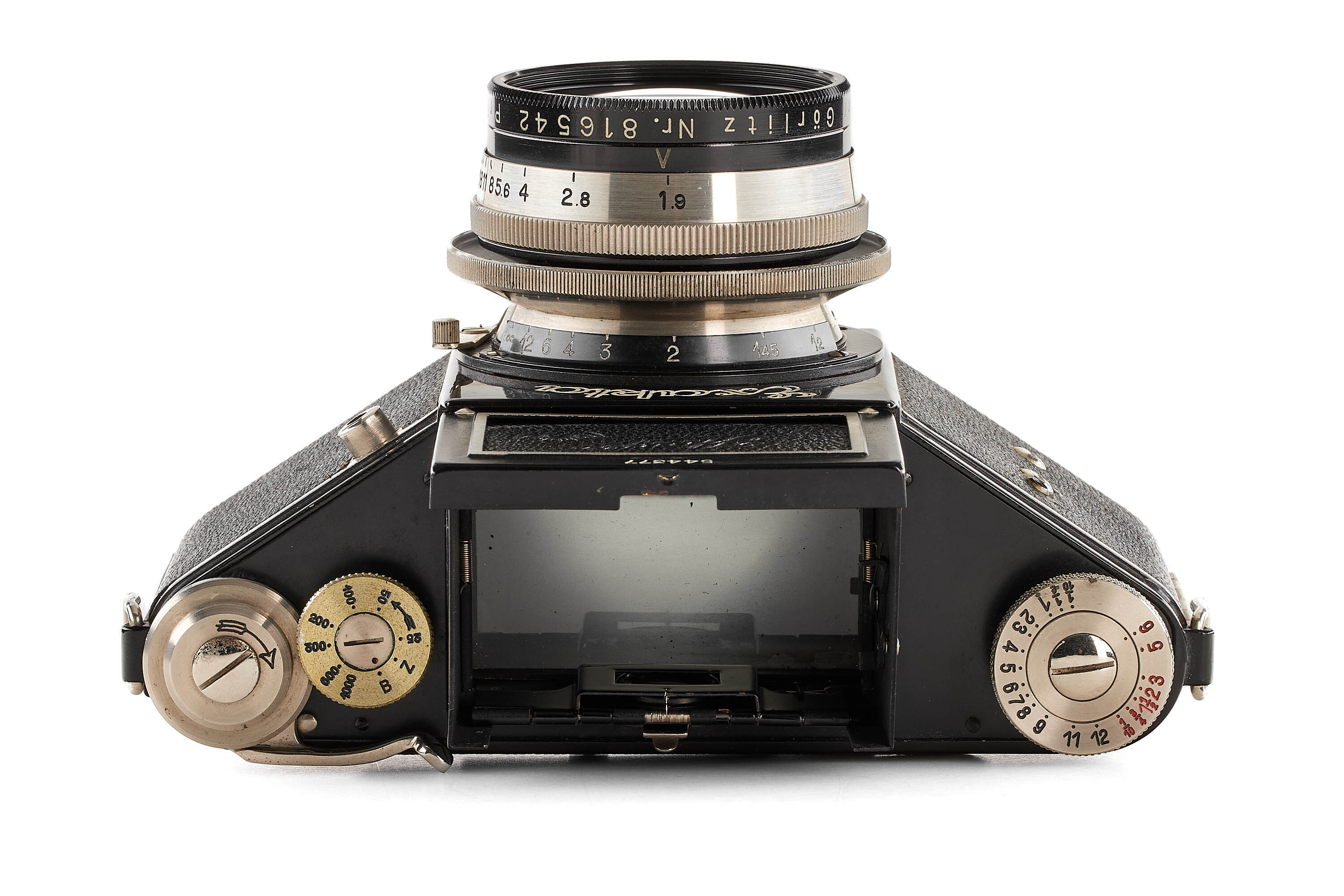 A beautiful, almost mint Night Exakta (shutter not operable) with sought-after, fast Primoplan 1.9/8cm no.816542 in black/nickel (very good optics, with original short hood).