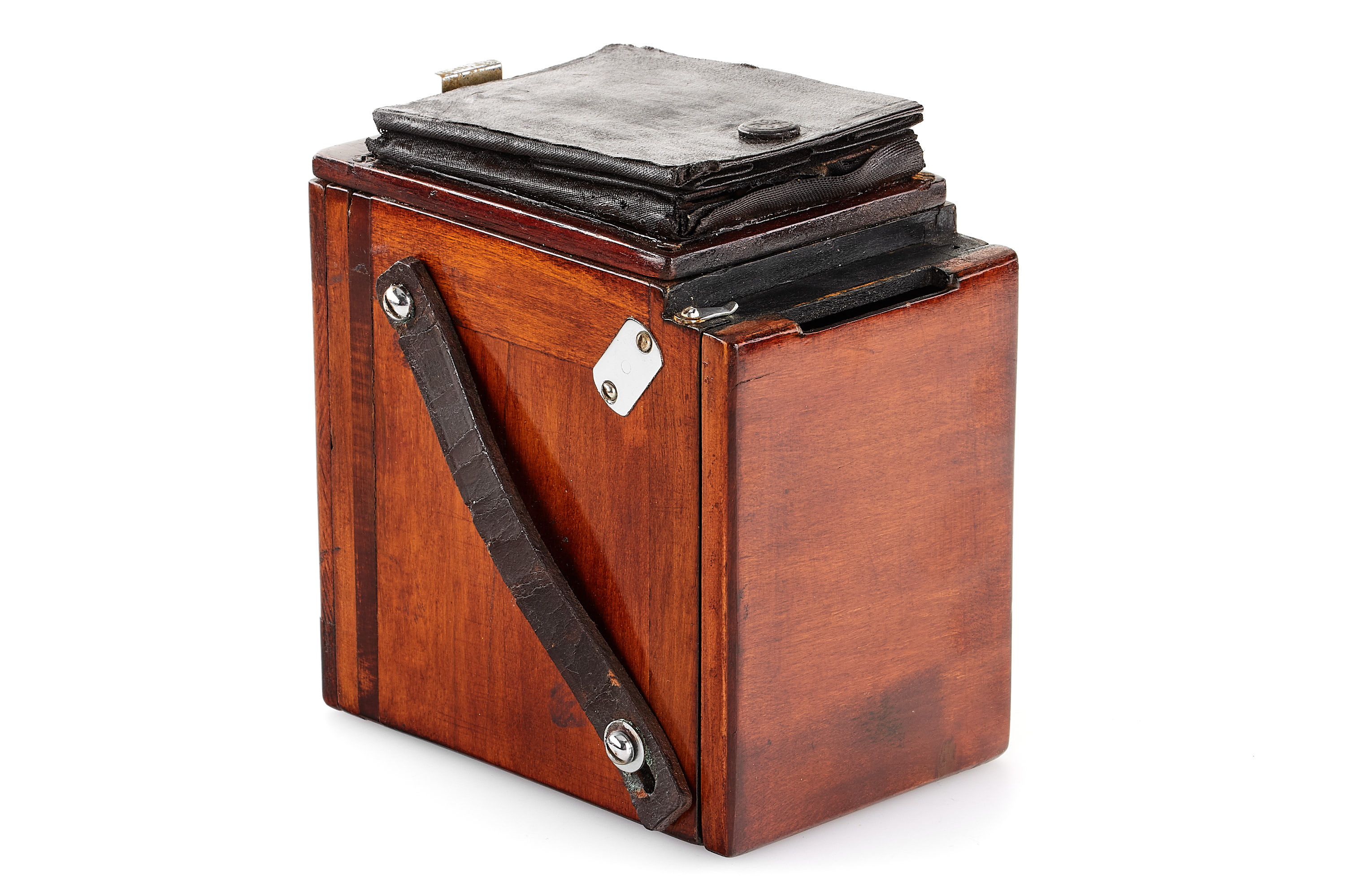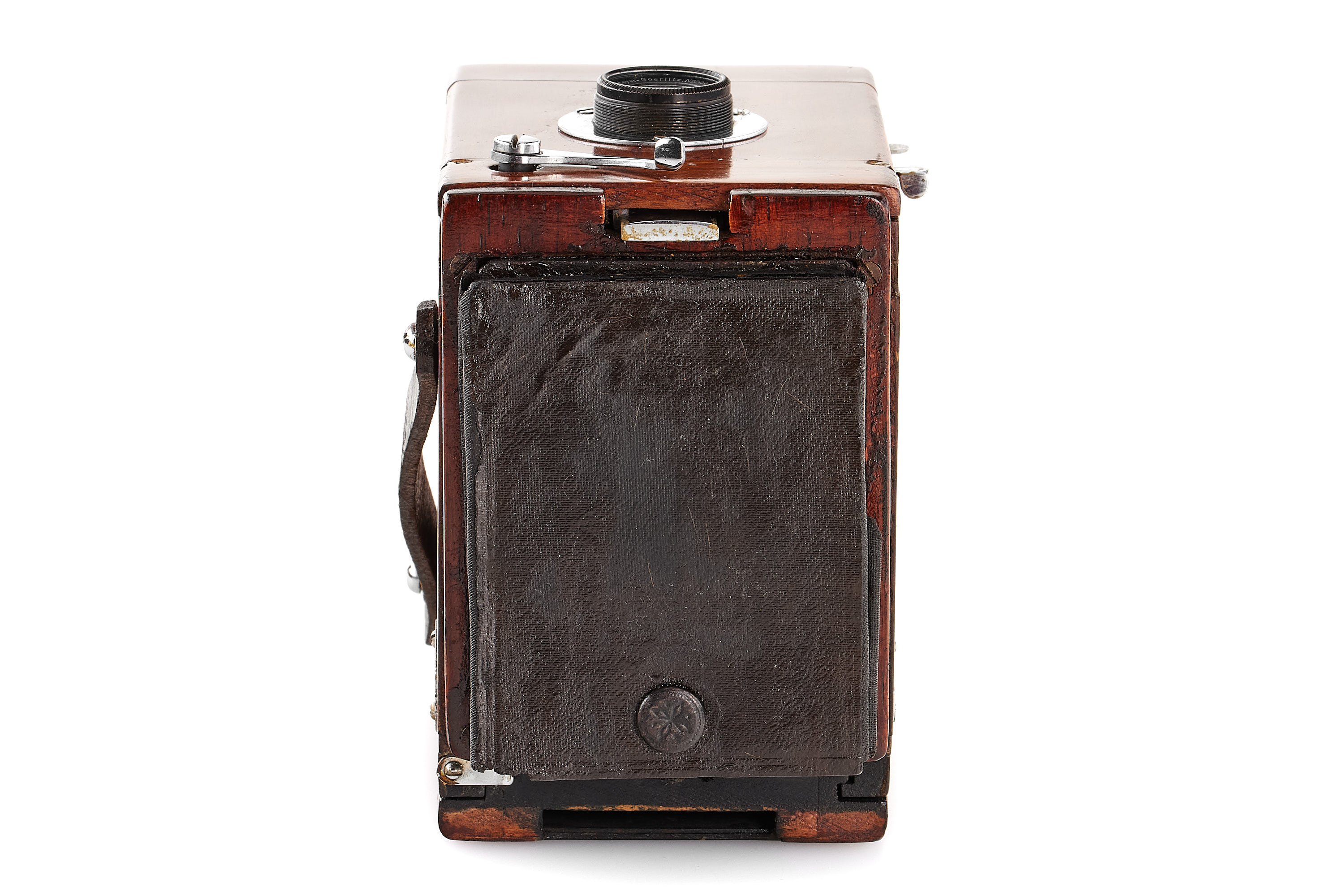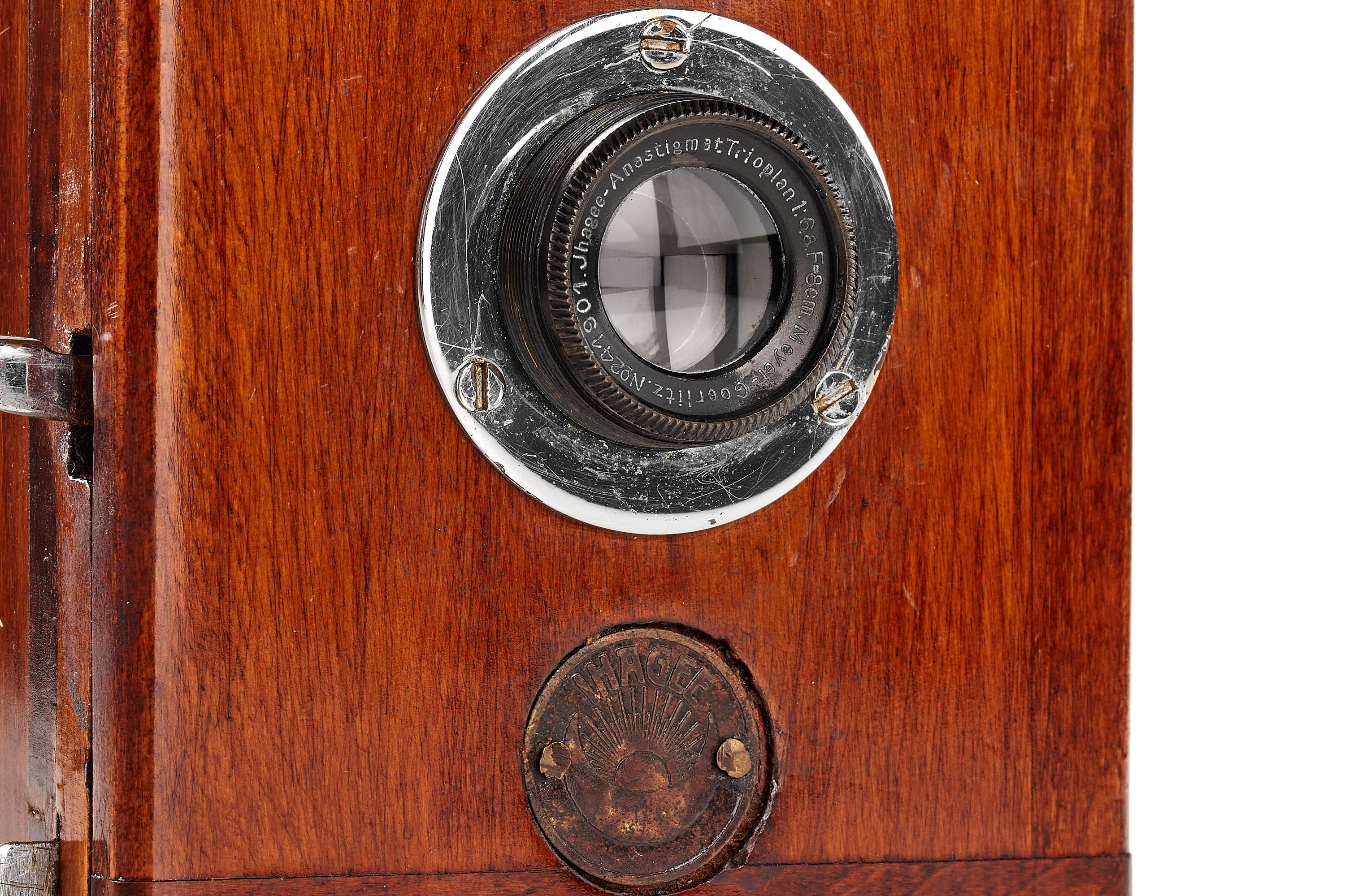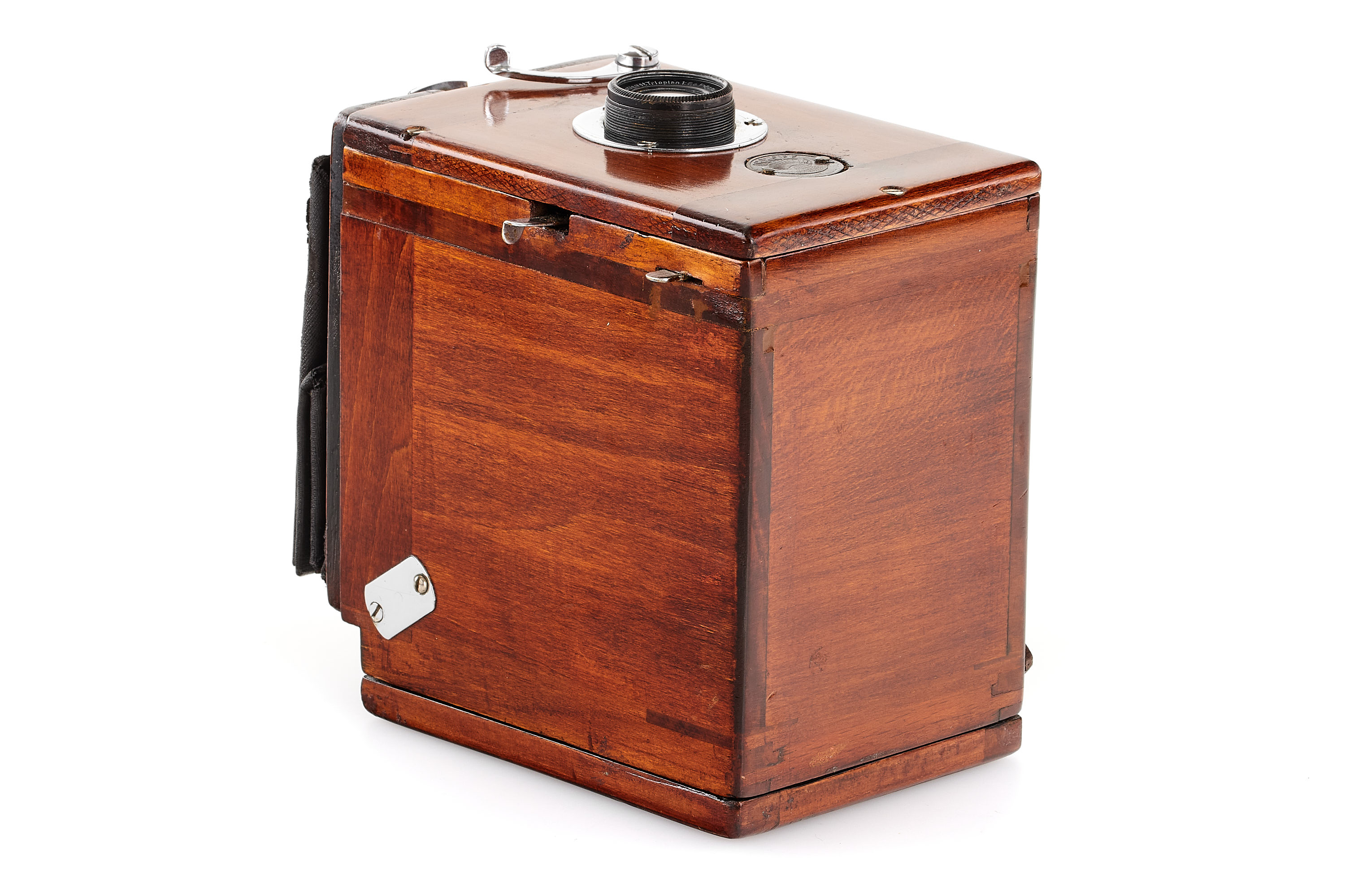 Very nice box camera for 4.5x6cm film plate, late version, unusual wooden finish, completely restored in the 2000s, with Meyer Goerlitz Anastigmat Trioplan 6.8/8cm no.241901, with film pack back.