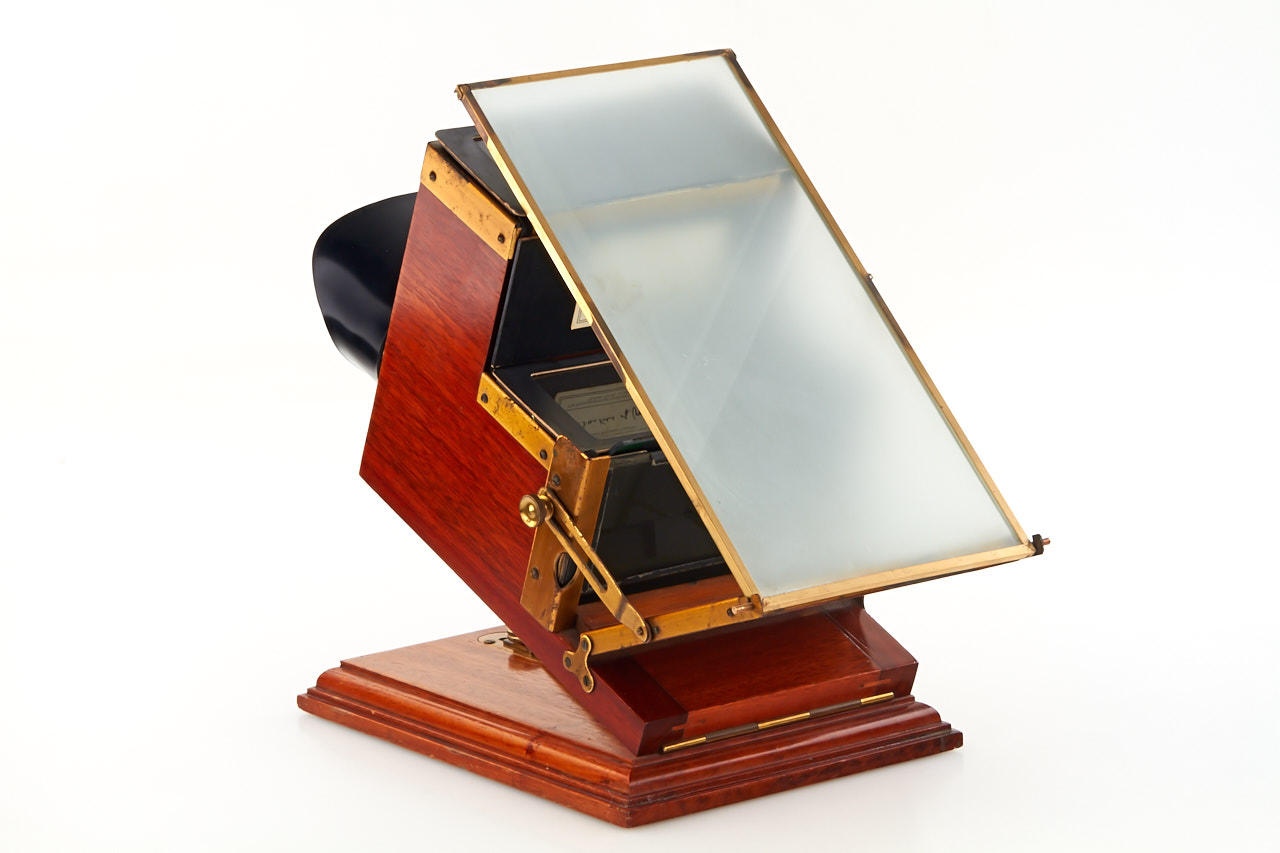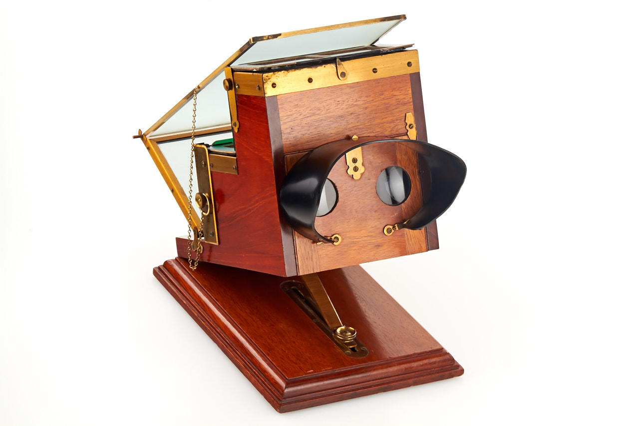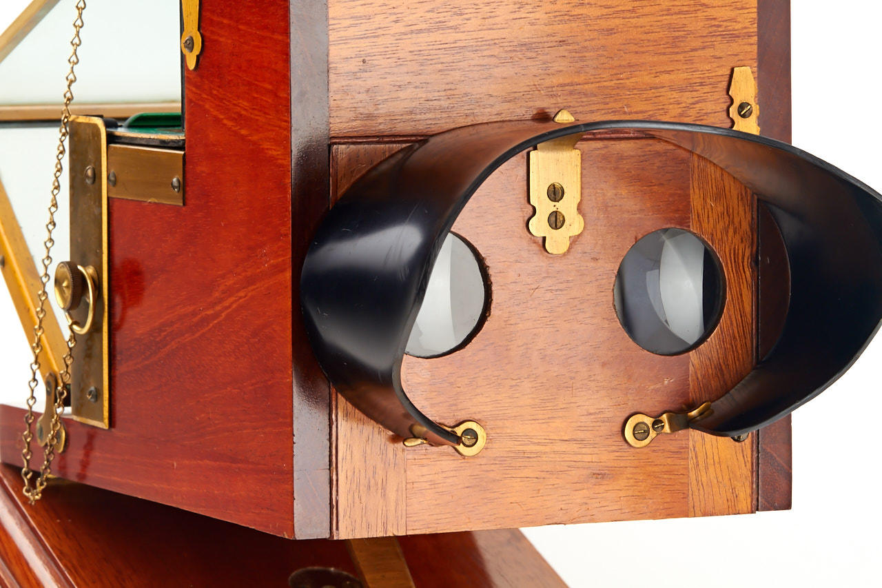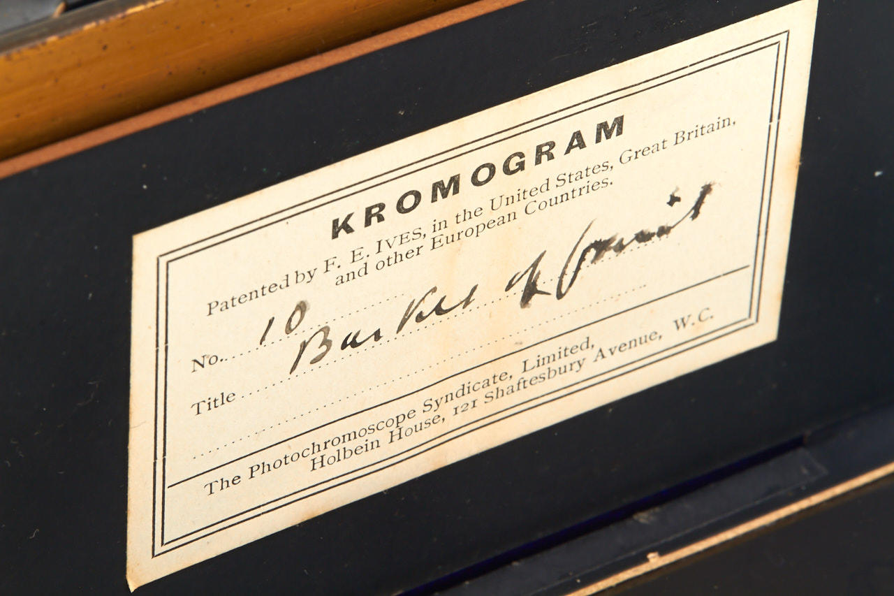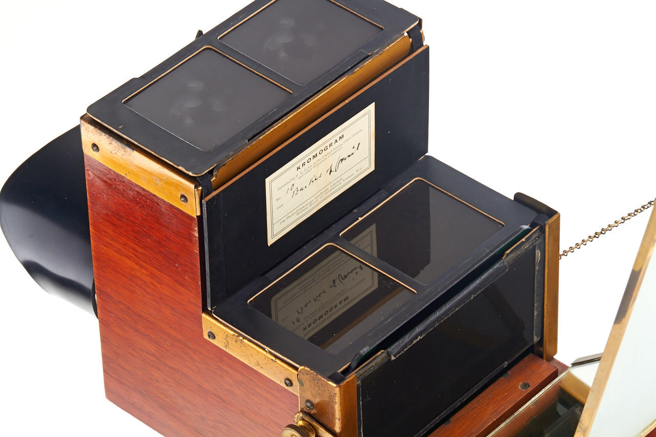 Ives' patent viewer for viewing special 5x5cm stereo colour separation pictures, mahogany body, with plaque: THE "KROMOSKOP" IVES'S PATENT The Photochromoscope Syndicate L'd HOLBEIN HOUSE 121 Shaftesbury Av'e LONDON W.C.', complete with three colour filters, green blue and red, in beautiful original condition, with matching mirror and fitted original wooden box (no lid) and one original Kromskop picture 'No.10 - Basket of Fruits'