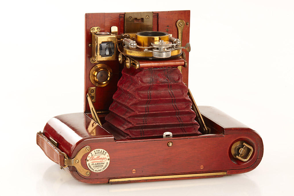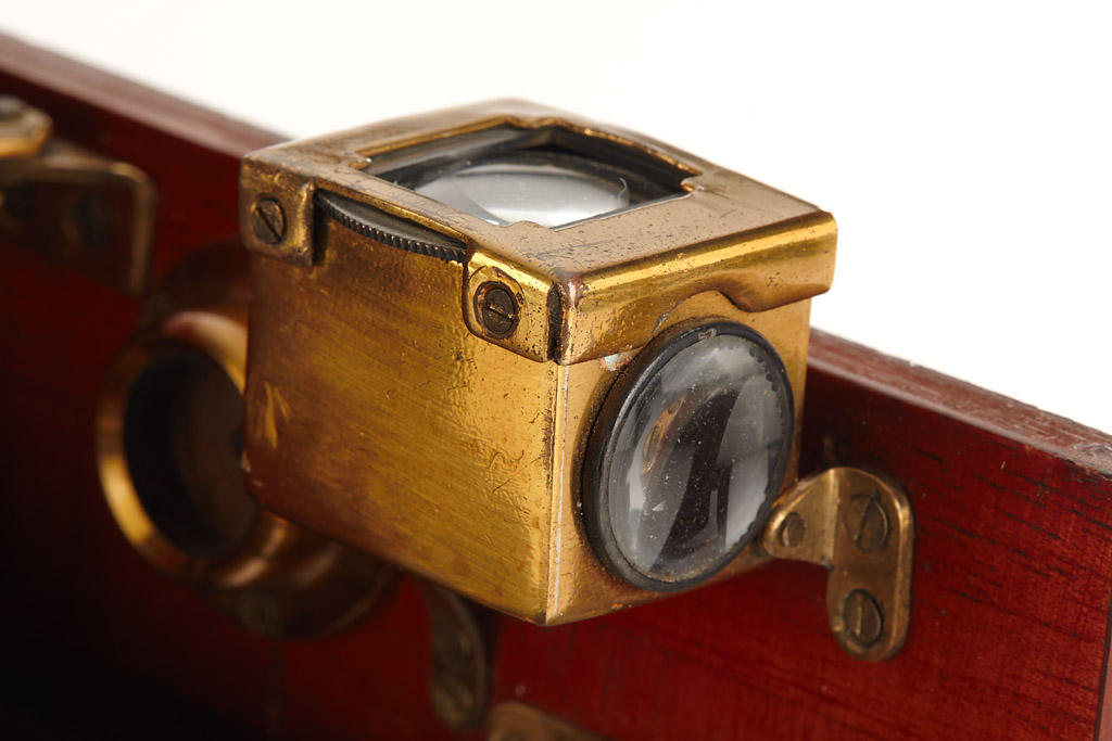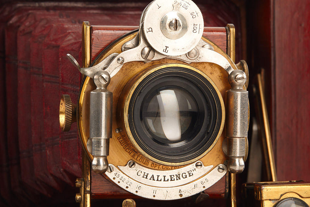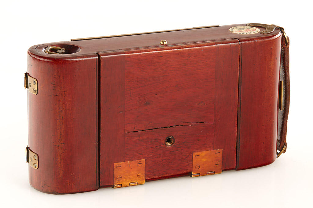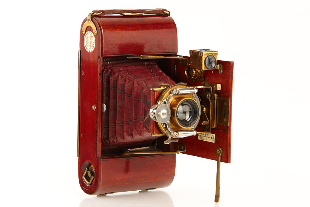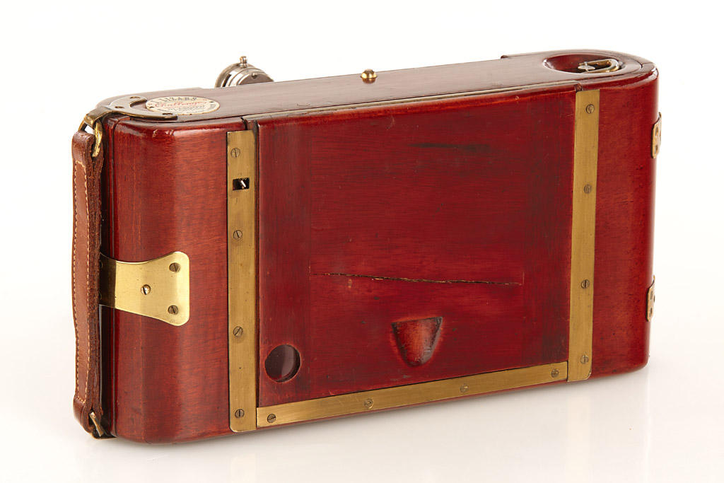 for 3 1/4 x 4 1/4" exposures on 122-6 rollfilm or plates, polished Spanish mahogany body, red leather bellows, Cooke 5.1 inch lens in Bausch & Lomb pneumatic shutter, case