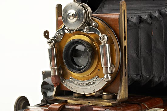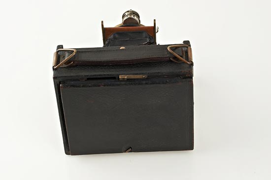 2 1/4 x 4 1/4" folding plate camera, mahogany interior with brass fittings, Ross Rapid Symmetrical 8/5" no.57721, Bausch & Lomb shutter, in good original condition. Ex Spira Collection
