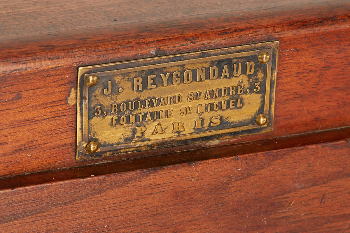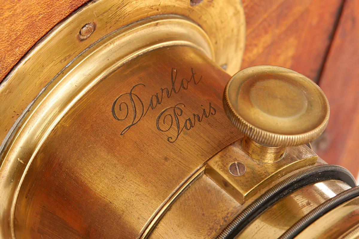 18x24cm, in original condition with good bellows, Darlot convertible Petzval lens with diaphragm disc inside, approx. 24cm focal length, front and rear element diameter c.6cm, very clean lenses, total height incl. hood c.14cm, including two original wet plate holders, name-plate on front, Reygondaud was the successor of A.Giroud