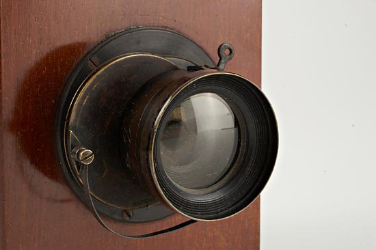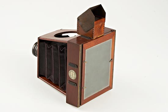 4x5", English folding strut-camera for dry-plates, the mahogany body with oxidized brass fittings and maroon leather bellows, a Shew-Darlot, Paris, no.1809, ƒ/8 lens in a rotating sector shutter, with accessory viewfinder. In very good original condition. Ex Spira Collection.