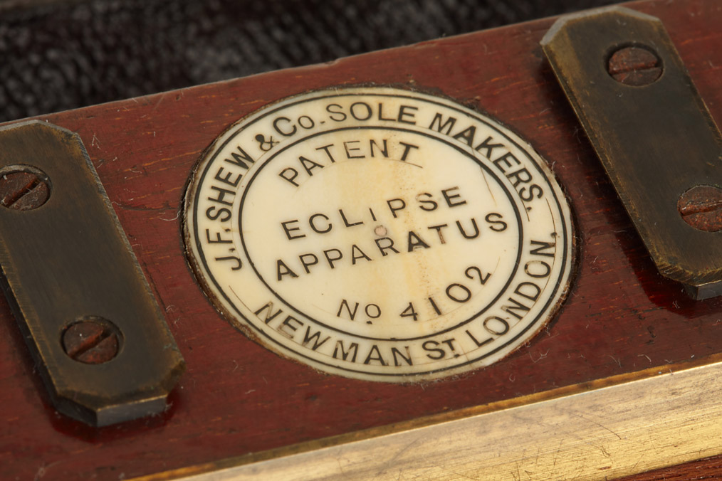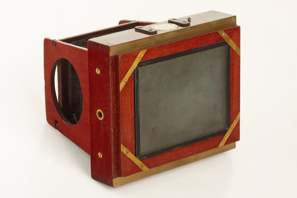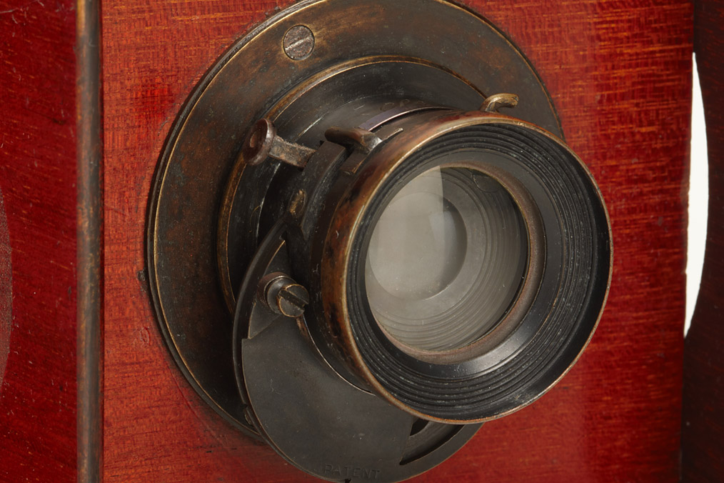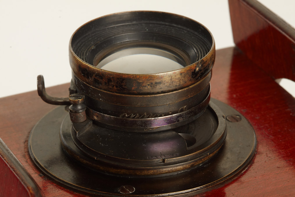 half plate mahogany strut folding camera with Darlot RR lens in inter-lens shutter, two double plate film holders, case