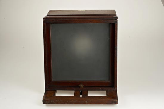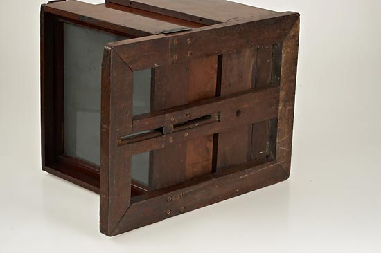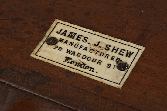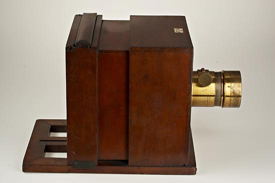 10x10" early English mahogany sliding box camera, with maker's plaque "James J. Shew, Manufacturer, 28 Wardour St., London", Lerebours et Secretan, Paris brass-bound lens no.6113. While it is unusual to find a French lens on a British camera of this period, it appears to be completely original, the camera and the lens are in very good condition with matching wet-plate holder. Ex Sprira Collection