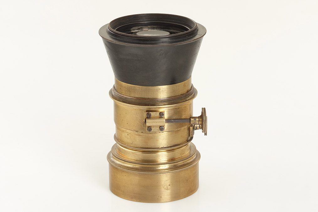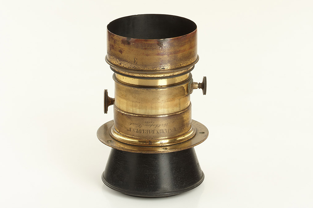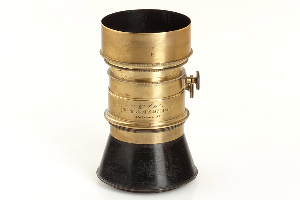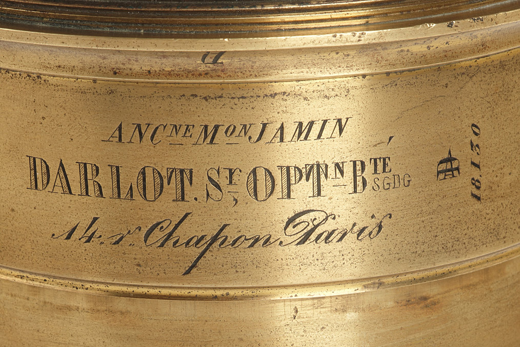 Set of 4 lenses by Jamin Darlot, Paris. The lenses are chosen so that they allow to trace the history of the famous Parisian optical workshop: The company was originally founded by Jamin in the 1850s and in 1860 taken over by his plant manager Darlot. For only one year the lenses carried the name Jamin-Darlot. In 1861, Jamin was dropped and the lenses became Darlot. Depending on their orientation, all the offered lenses can either be used as a landscape or a portrait lens. (1) engraved 'Jamin', serial number 2521, before 1860, condition C, height 22cm, (2) engraved 'Jamin.Darlot', serial number 6594, 1861, condition B-, height 21cm, (3) engraved 'Darlot', after 1861, serial number 18130, condition B, height 22cm, leather cap, (4) engraved 'Darlot Opticien' and indicators for the use as a portrait or landscape lens, after 1861, serial number 28,057, condition B +, height 16cm, leather cap.(4)