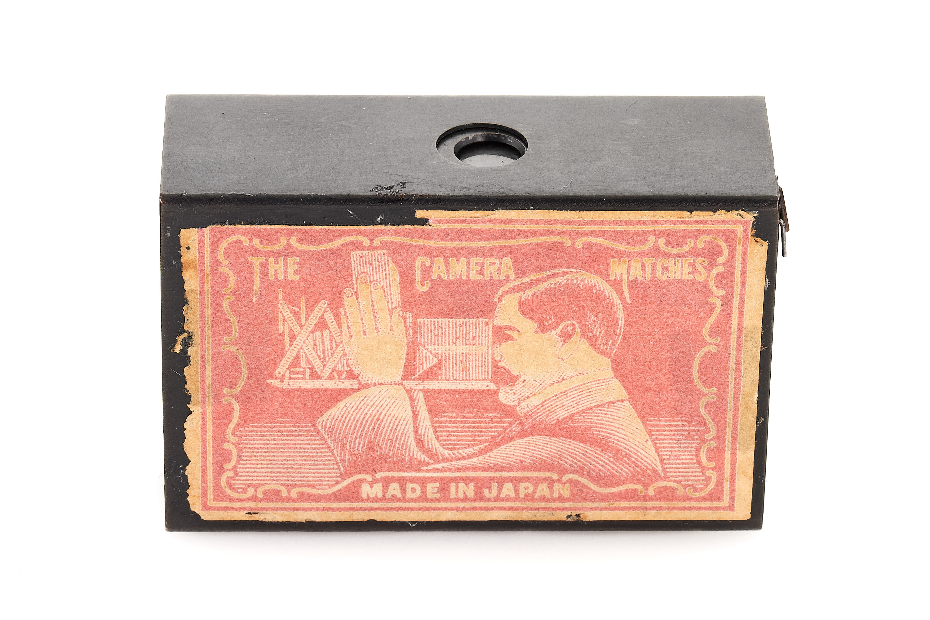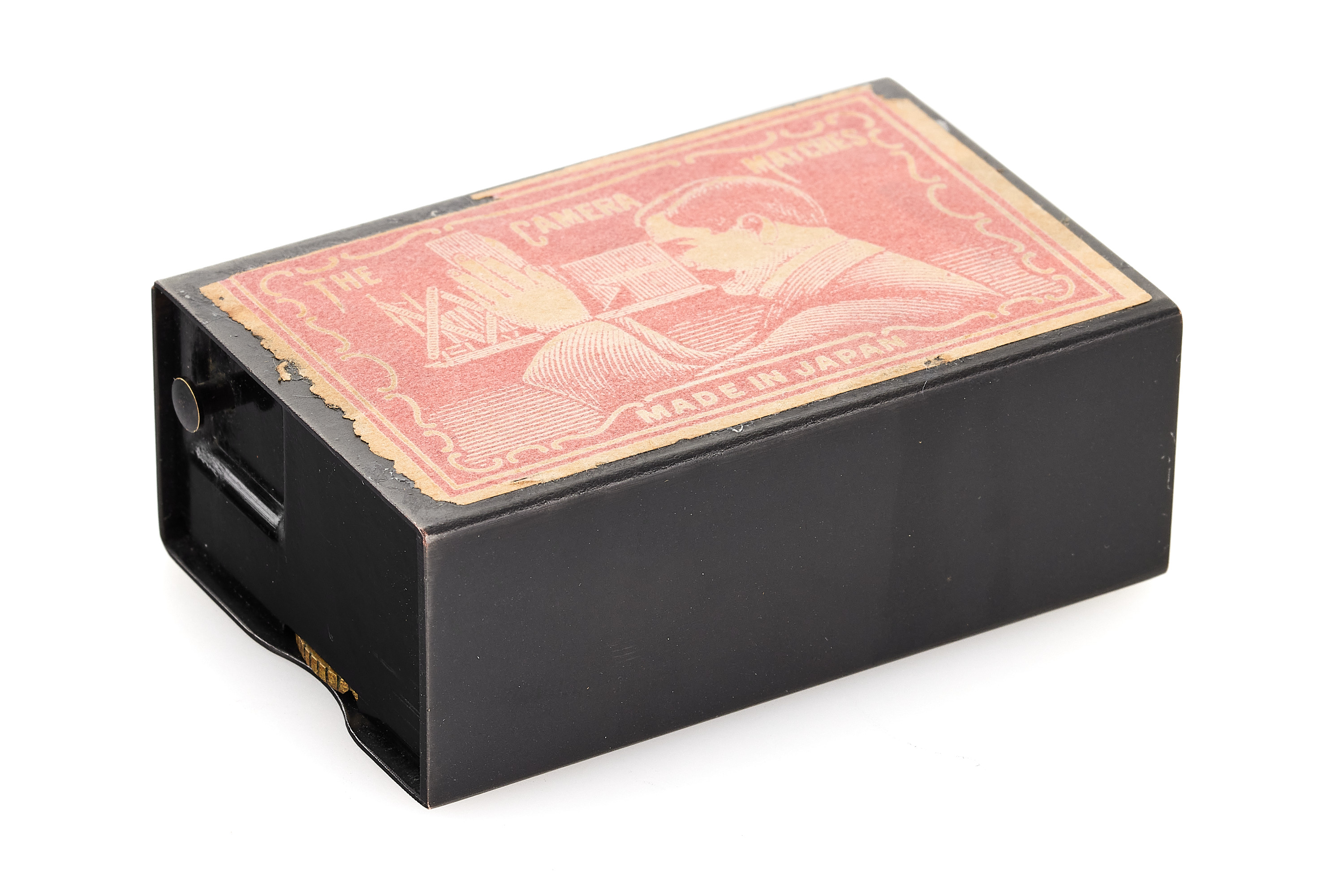 An extremely rare Japanese matchbox camera for 16mm film. In near-mint condition, sticker on the front 'The Camera Matches'. Dimensions 22x39x60mm. The design was copied from the famous Kodak Matchbox camera.