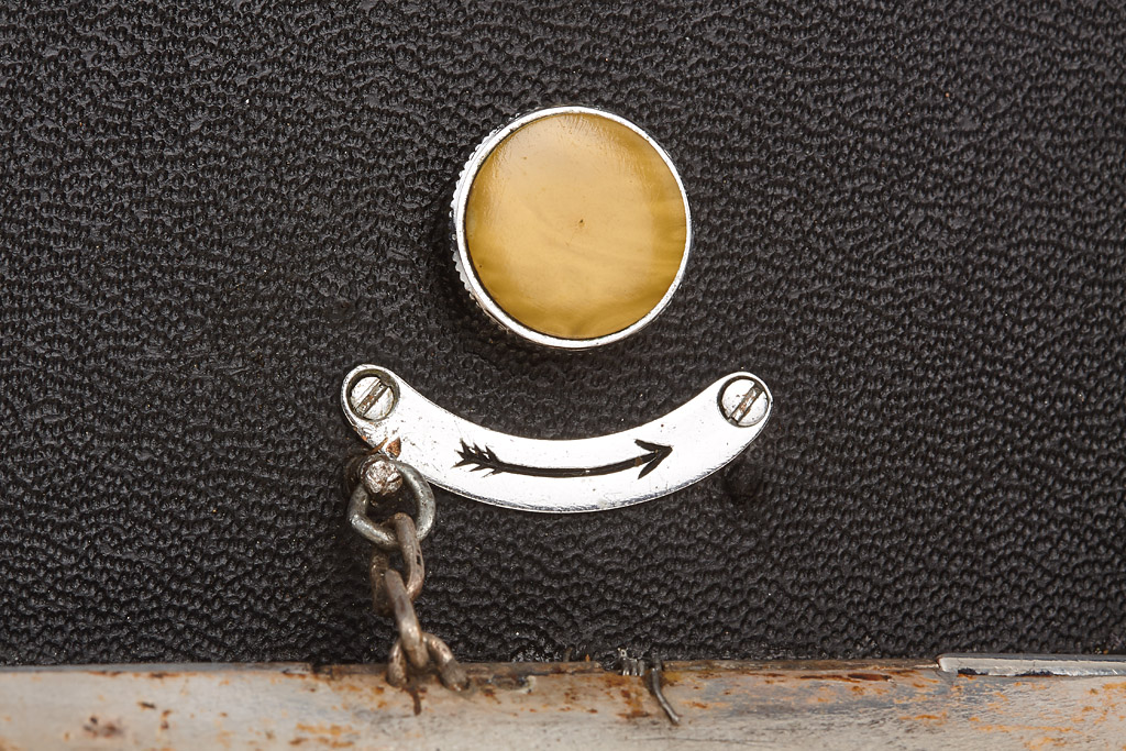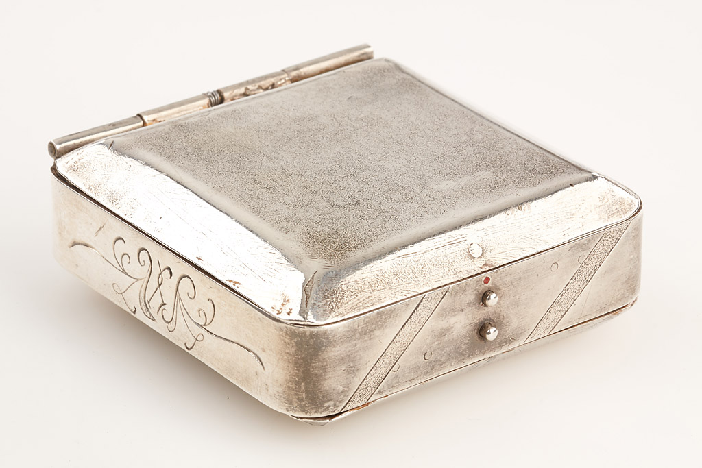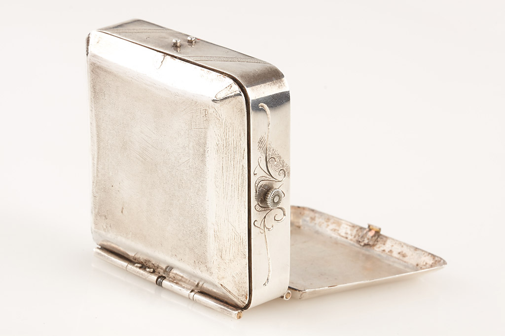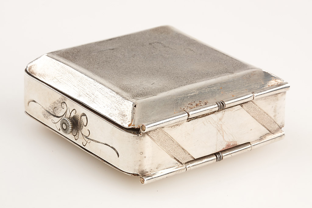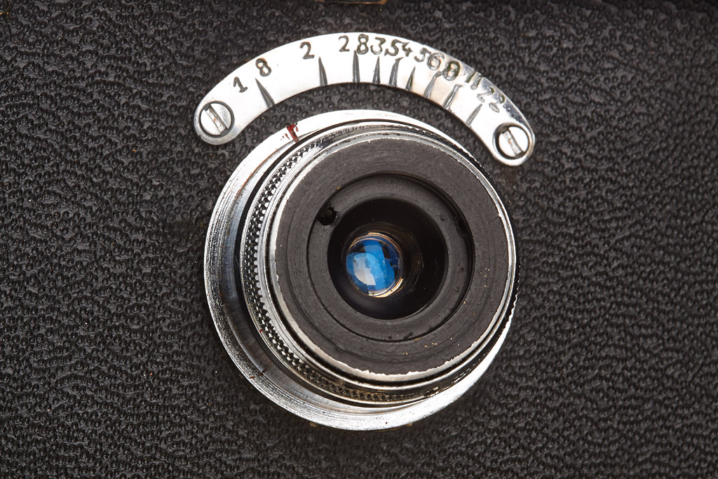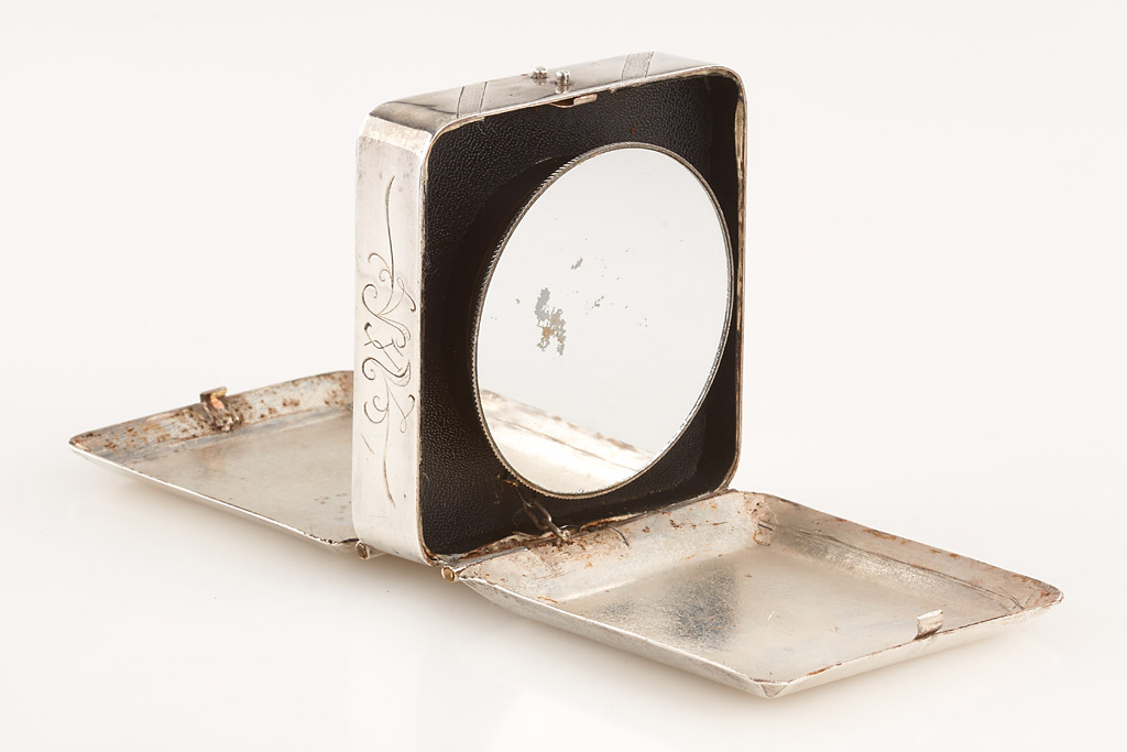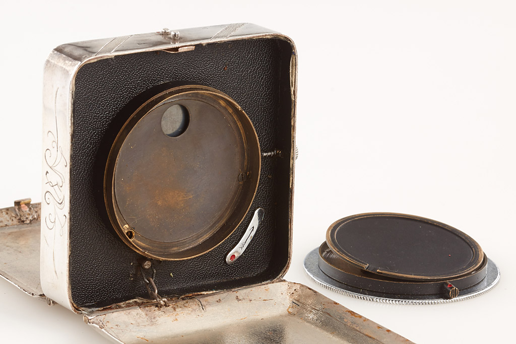 miniature camera for 1cm exposures on round film with 45mm diameter, concealed in a ladies pocket make-up metal case with nicely made ornamentations on each side, inside rear behind the mirror is the film chamber and winding mechanism, on front a fix-focus lens with aperture selector, c. 7x7cm