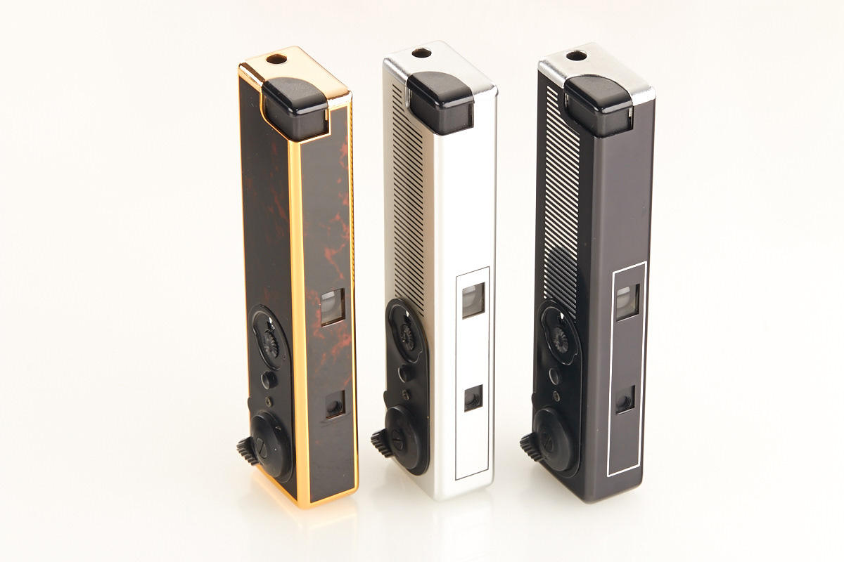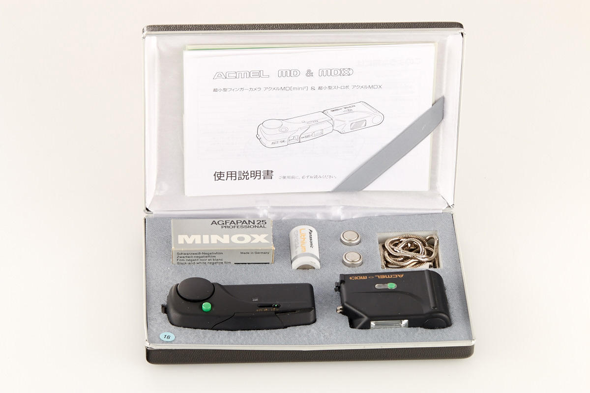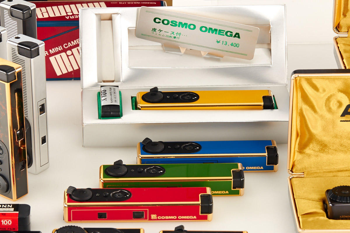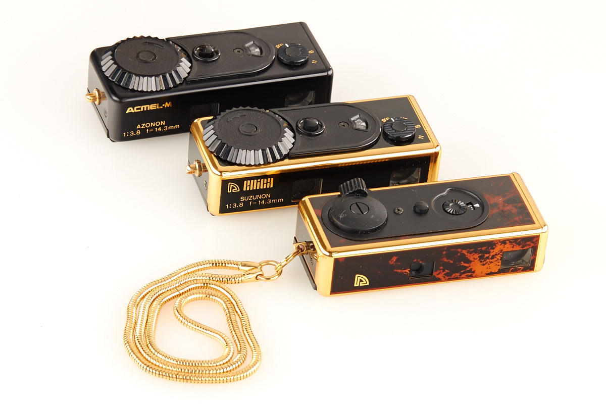 lot of 15 Japanese subminiature cameras for Minox film: Acmel MX black, Acmel M red, Acmel M black, Enica gold/black, Minimax gold/brown, Supra Photolite gold/brown, Supra Photolite chrome, Minimax Lite black, Minimax Lite chrome, Minimax Lite gold/brown, Acmel MD black, Cosmo Omega yellow, Cosmo Omega blue, Cosmo Omega green, Cosmo Omega red, all in mint or near mint condition, most of them complete in maker's box