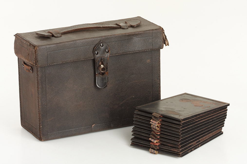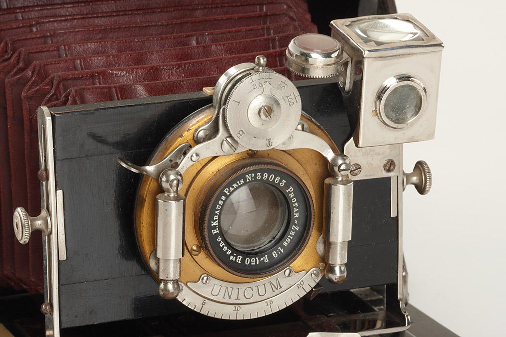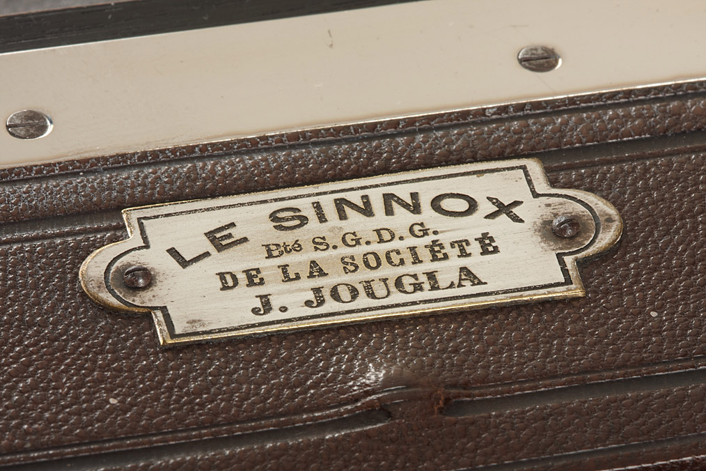 9x12cm folding bed camera, leather covered wood body, focusing screen adapter, red/brown leather bellows, Krauss Protar-Zeiss 9/150mm no.39063 in pneumatic Unicum shutter (needs service), dealer's plaque: LE SINNOX Bte S.G.D.G. De La Societe J.JOUGLA, 12 platefilm holders, matching case