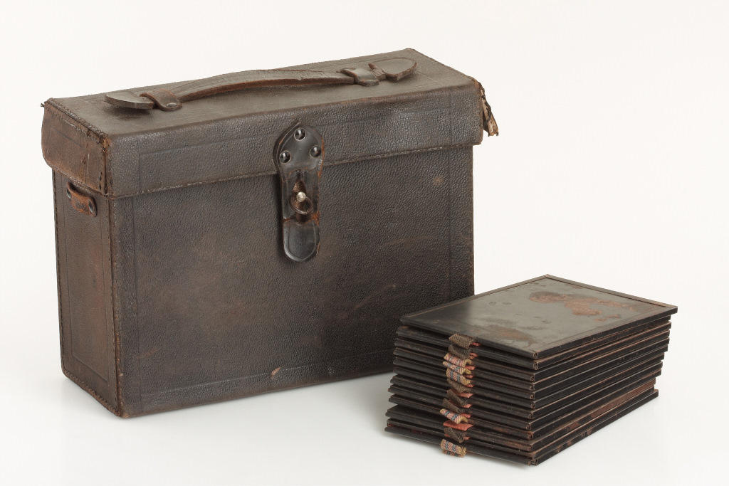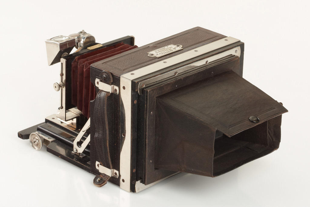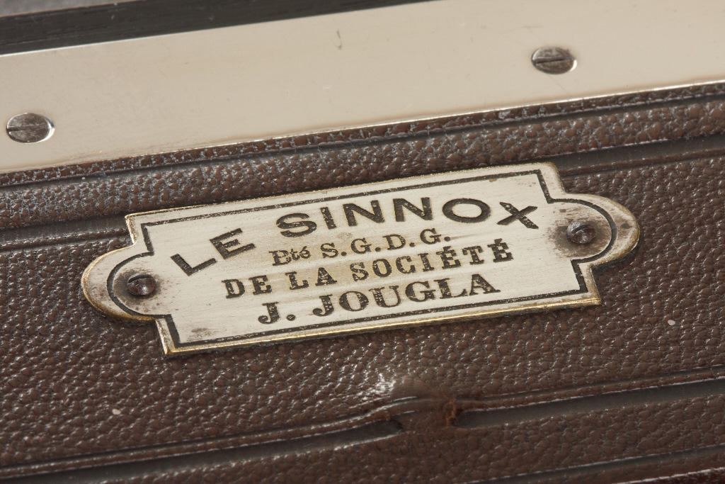 9x12cm folding bed camera, leather covered wood body, focusing screen adapter, red/brown leather bellows, Krauss Protar-Zeiss 9/150mm no.39063 in pneumatic Unicum shutter (needs service), dealer's plaque: LE SINNOX Bte S.G.D.G. De La Societe J.JOUGLA, 12 plate film holders, matching case