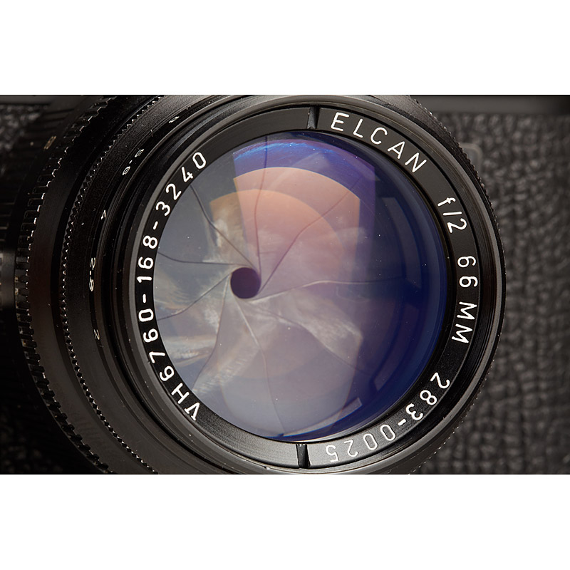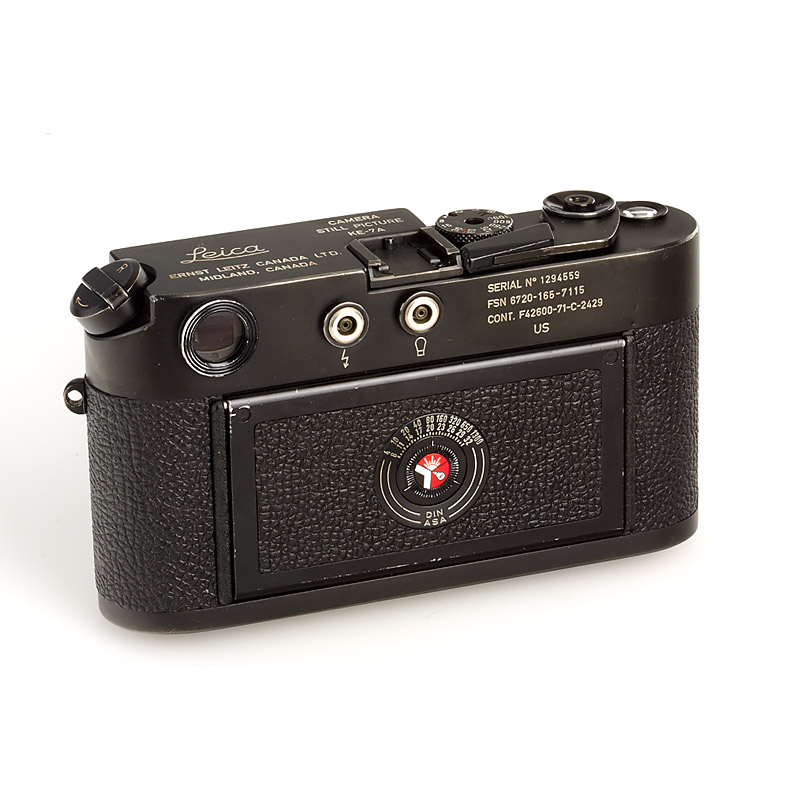 very rare black M4 in good and perfect working condition, produced for the US Army with contract numbers on back of top-plate engraved 'Serial No 1294559 FSN 6720-165-7115 CONT. F42600-71-C-2429 US', with the extremely rare Elcan 2/66mm no.283-0025 and military contract number 'VH6760-168-3240' engraved on front ring (see Lager II page 228), lens in good condition with clean optics (cap), the offered camera was delivered with this 66mm Elcan lens !