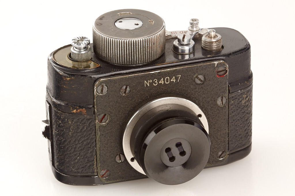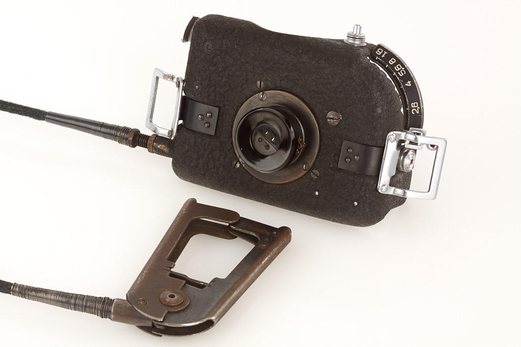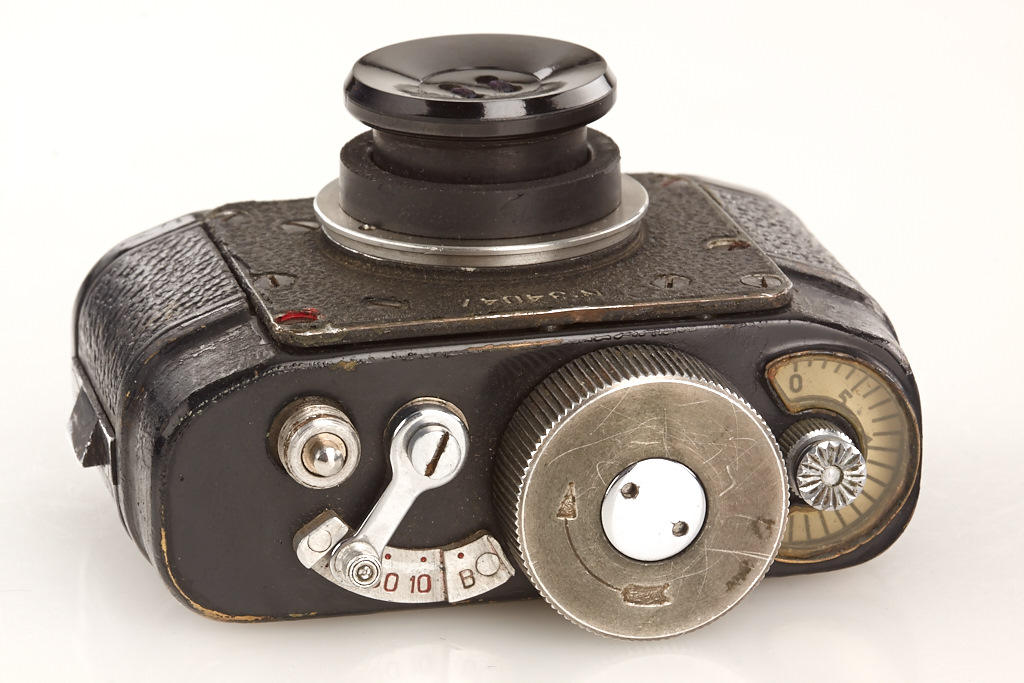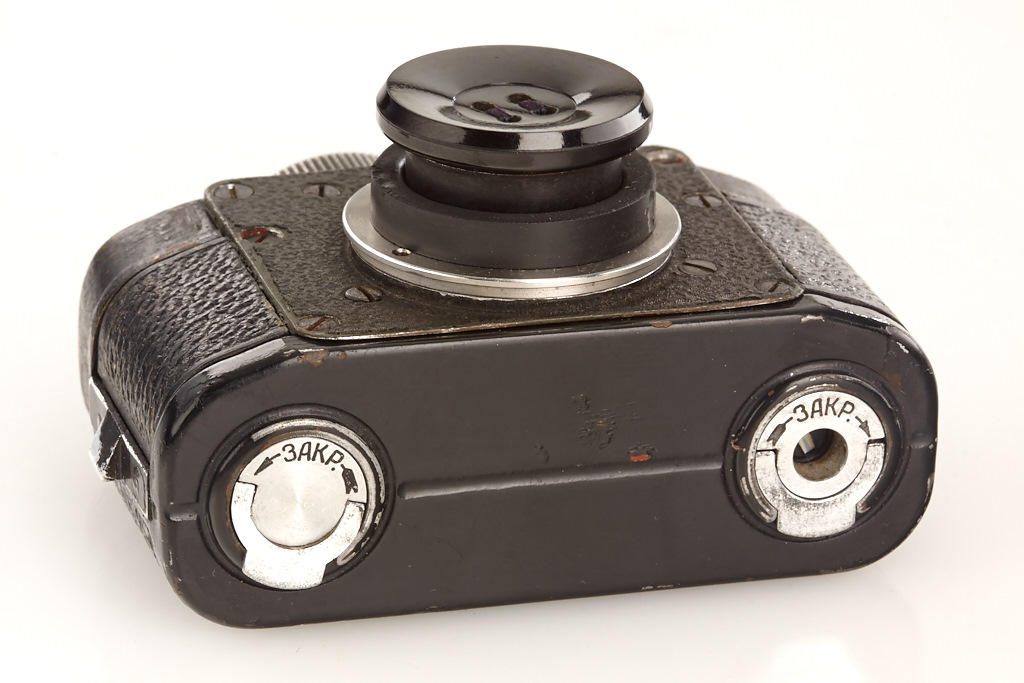 very rare original KGB outfit consisting of a F-21 camera with a 4.5/28mm lens with button concealment, a spare 4.5/28mm and a 2/28mm lens, with mechanical release which pictures through a concealed button on a jacket, with the original film splicer and copy of the instruction book