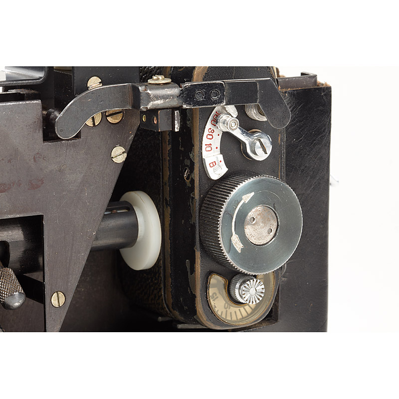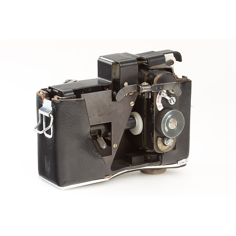 Russian F-21 in Zenit case made by a special workshop of KMZ (Krasnogorsk Mechanical Enterprise) for the KGB, interchangeable lens 2,8/28, clockwork mechanism. The small camera takes photographs through a small hole underneath one of the neckstrap lugs, that opens for a moment only when the shutter is released (by pressing on a certain point of the back of the camera case). The shutter speeds (B, 1/10, 1/30 and 1/100) have to be changed on the camera itself, while the diaphragm can be changed conveniently by turning the tripod screw of the camera case, which is engraved with the f-stops. Authentic outfit from a KGB spy.