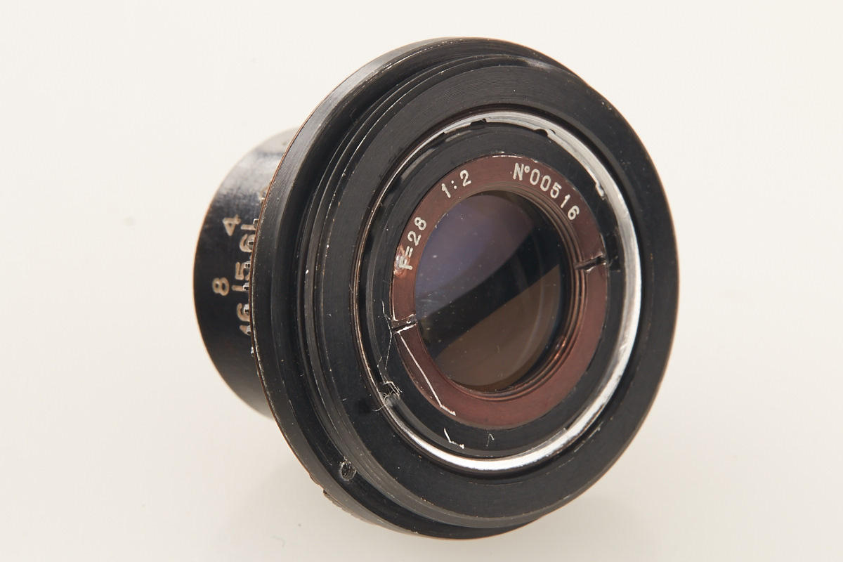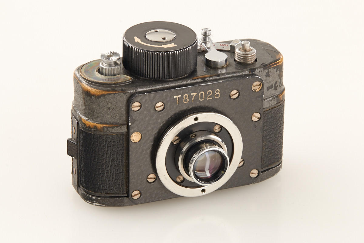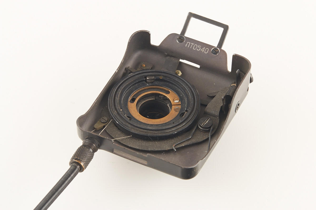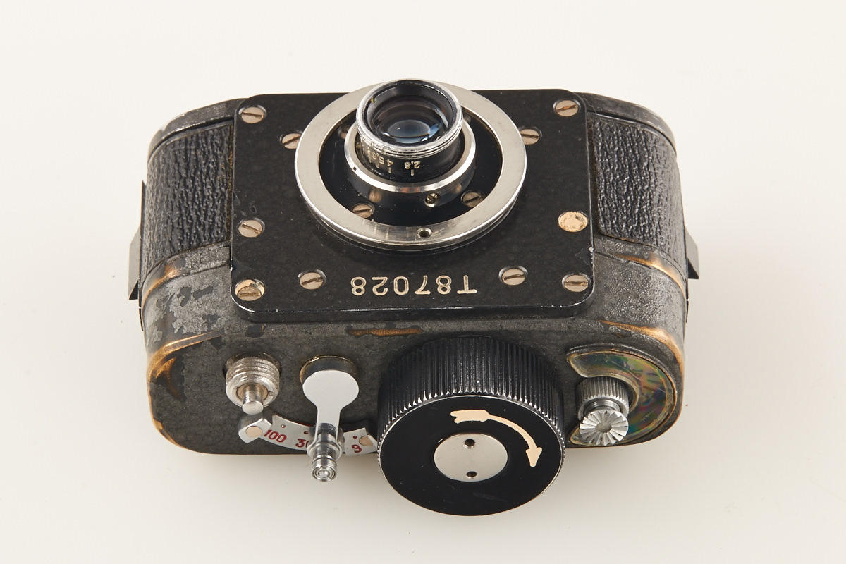 clockwork motorized spy camera for the Russian secret service with 2.8/28mm lens no.T87029, additional fast 2/28mm no.00516 lens, rare matching film splitter, button type concealment device with aperture and shutter control, two film spools