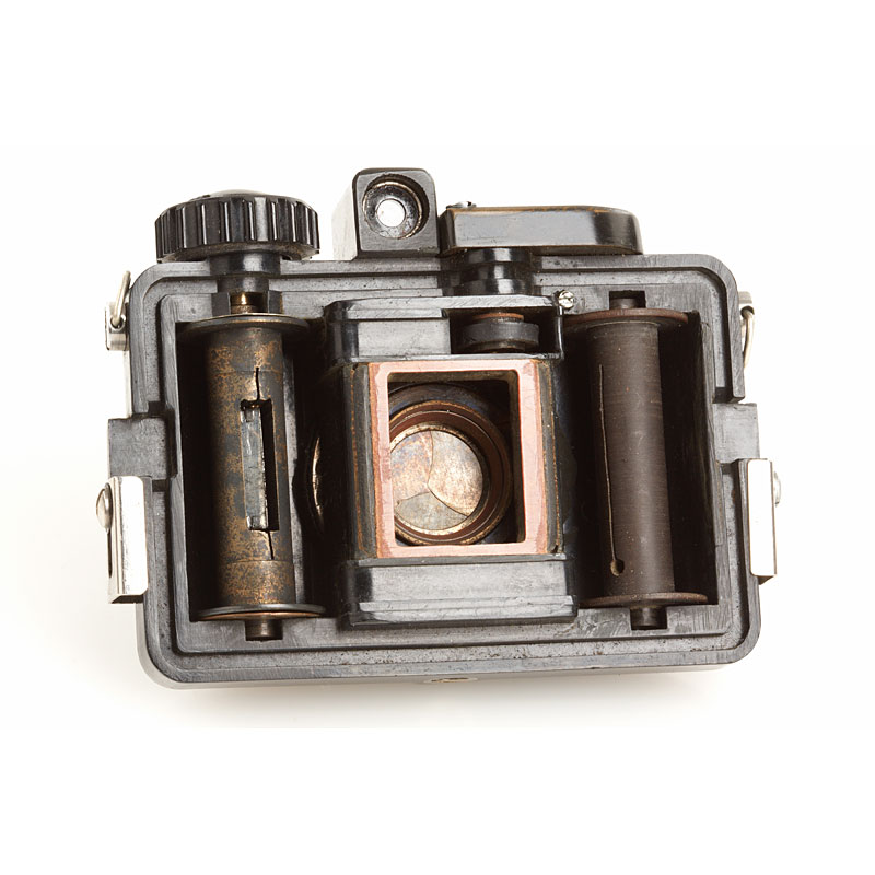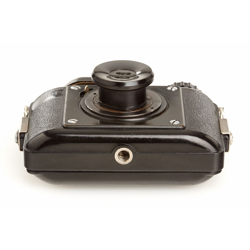 extremely rare 24x24mm bakelite camera modified by the KGB, metal top part and front plate with 2.8/28mm lens, pictures are taken through a false button, including 7 equal buttons to install on a jacket