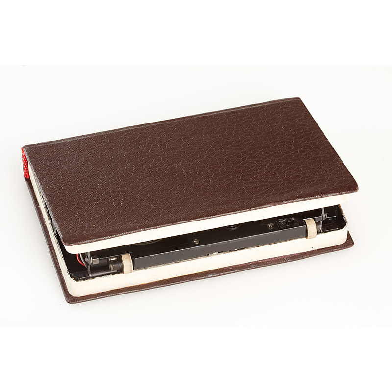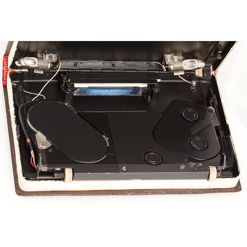 This very rare rollover camera was made in a special workshop of KMZ at Krasnogorsk. It is rolled over the document at a speed of 20cm/sec by hand and copies a 10cm wide strip of the document to a 8.3mm filmstrip in a special cassette. Outfit in a grey aluminum case with red interior plastic fitting. The camera is perfectly disguised as a notebook (there is also a real brown notebook in the outfit that looks exactly the same). The camera has its own light source that is switched on automatically when the camera is moved across the document. The outfit also comprises a crank activated precision film cutter that cuts two strips of 8,3mm out of a 35mm film, spare cassettes and batteries with matching charger (115 and 220V). A similar outfit is illustrated in 'Keith Melton, Ultimate Spy, Expanded Edition', page 100