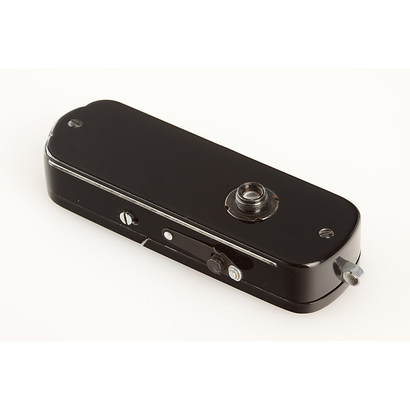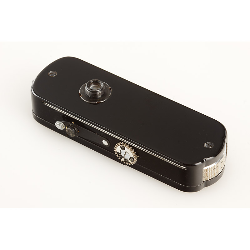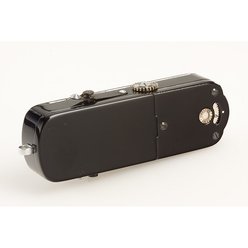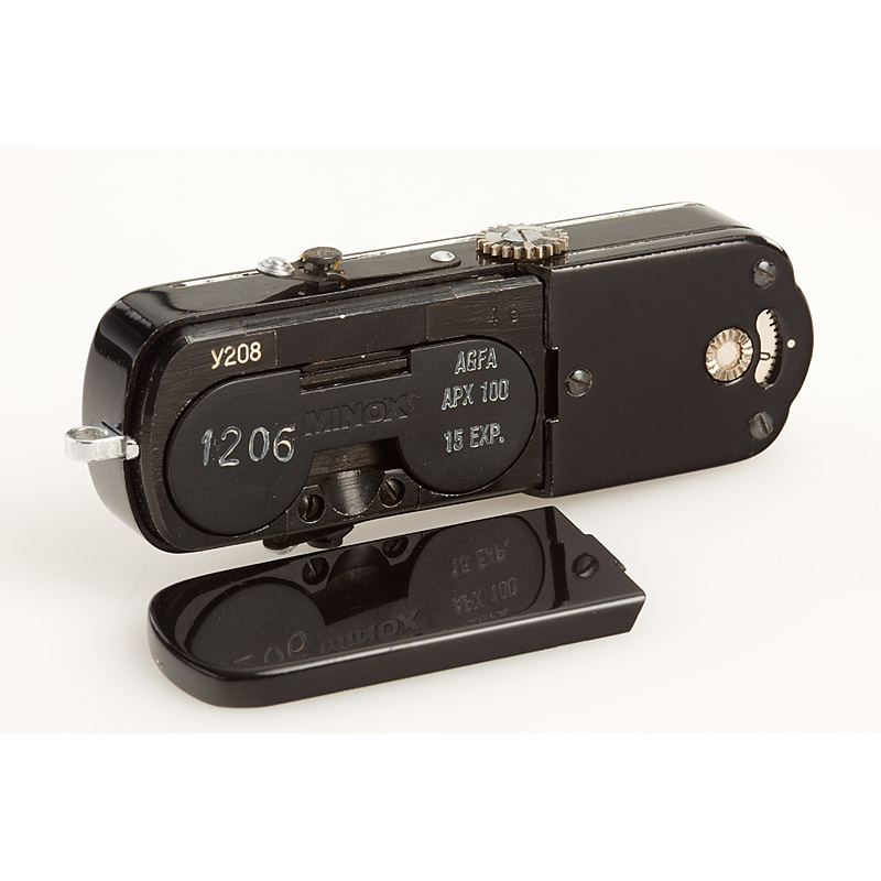 first model of Totschka spy camera for the Russian Secret Service KGB, uses Minox film with clockwork motor drive, in very good and original working condition, 5 film spools in keeper, film cutter, all in a matching wooden maker's box