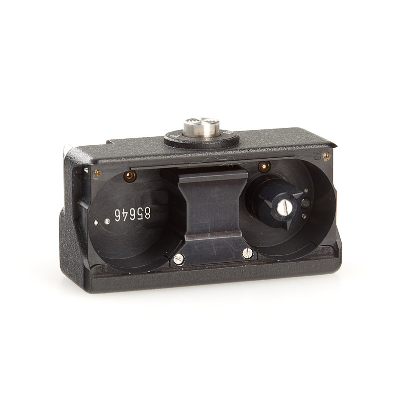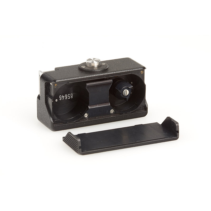 This very rare camera is only 47x23x17mm in size and takes regular Minox cassettes for negatives 8x11mm. Made by a special KMZ workshop near Moscow. Easily operated by a sliding lever for transport and shutter (exposure time 1/60 sec). Fixed focus set at 10 inches. To take a photograph, position the object on a desktop, take the camera in both hands with lens downwards and position your elbows left and right laterally to the object, which will amount in a focus-film distance of about 10 inches. The lens is a multi-coated, high performance 5-element Carl Zeiss Lamegon f3.5 f=8mm (equivalent to a 28mm wide-angle lens in 35mm photography, 75° angle), the same lens is also used in the East German Venus-Z camera. Very sturdy and reliable mechanism, the film pressure plate stays retracted while the film is transported which means a smooth and easy transport (the pressure plate is activated by the release knob !) A similar camera is illustrated in 'Keith Melton, Ultimate Spy, Expanded Edition', page 101
