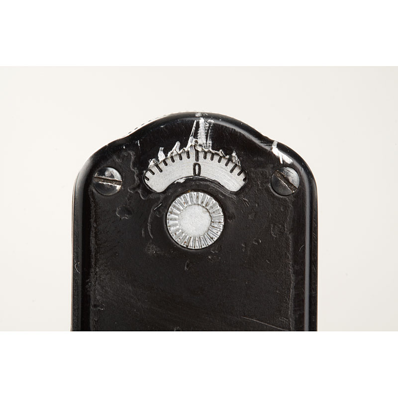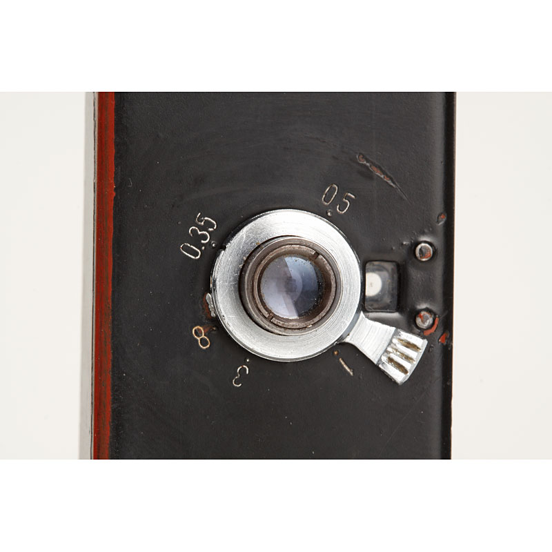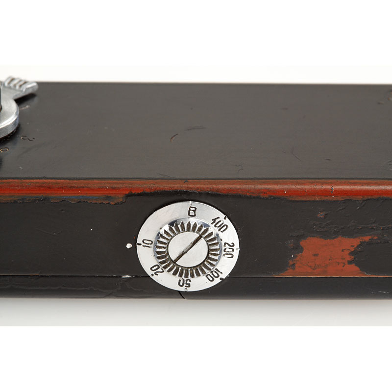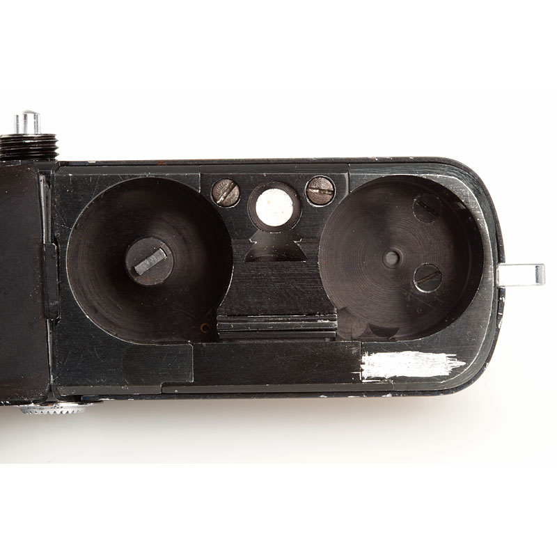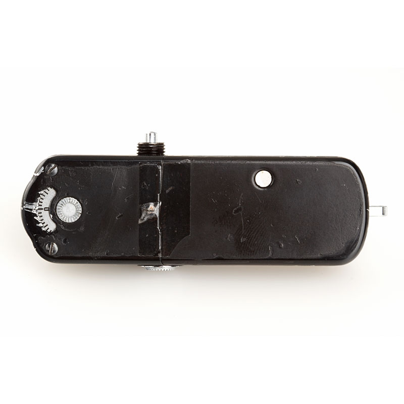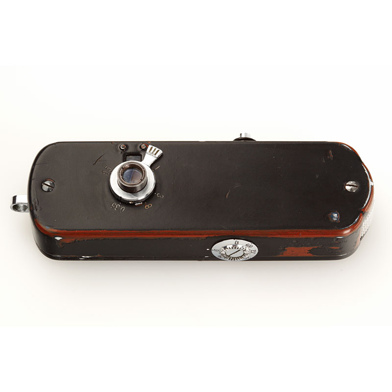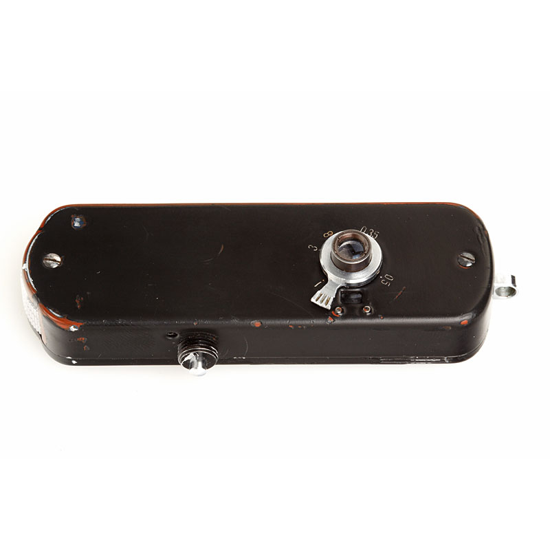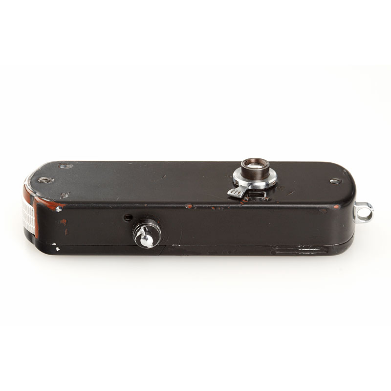 the only known pre-series or prototype Totschka camera with focusing Industar 3,5/15mm lens (0.35m-infinity), Galilean finder, round shutter speed dial (marked B, 10, 20, 50, 100, 200 and 400), frame counter with rotating engraved disc under small round hole in front, two small rails on both sides to mount the camera into spy devices (belt, umbrella, neck tie, etc.), in good working condition with very nice patina, serial number inside defaced, original metal container