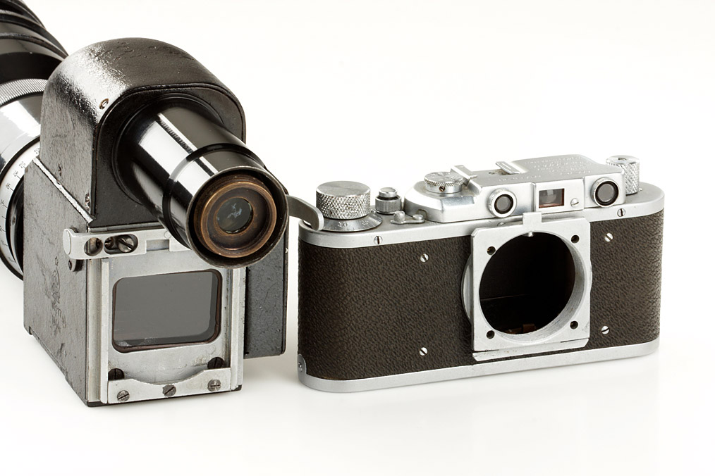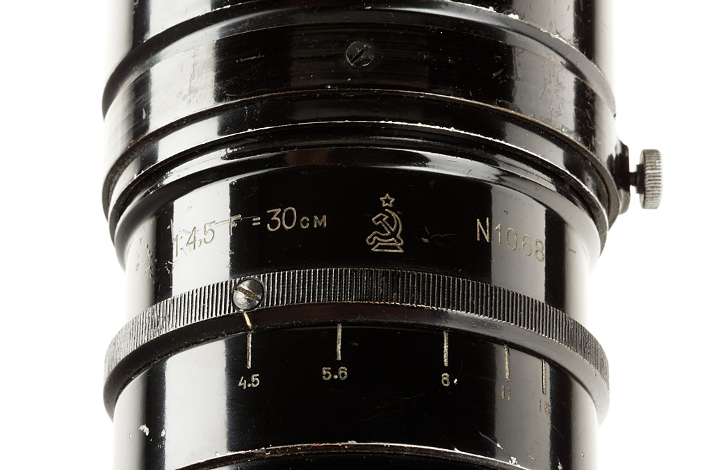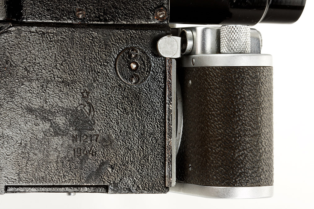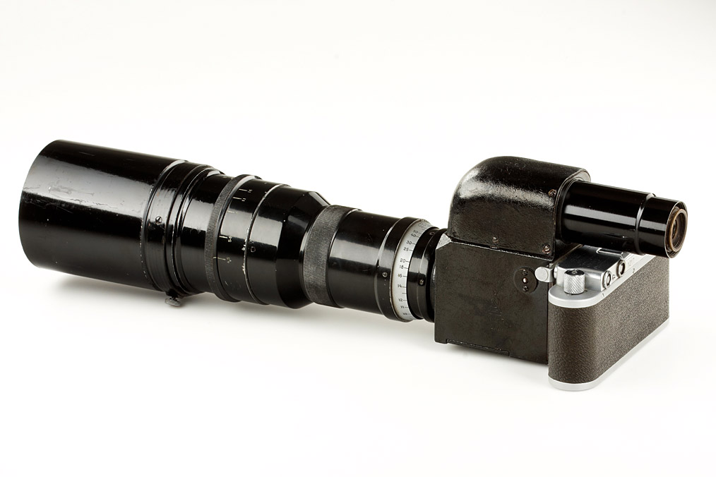 lens and reflex housing of the famous KMZ photographic gun, KMZ 4.5/30cm no.1068, hood, parts repainted, adapted Fed no.135790
