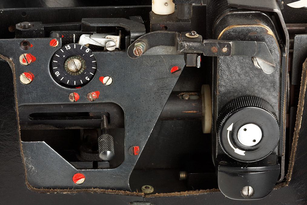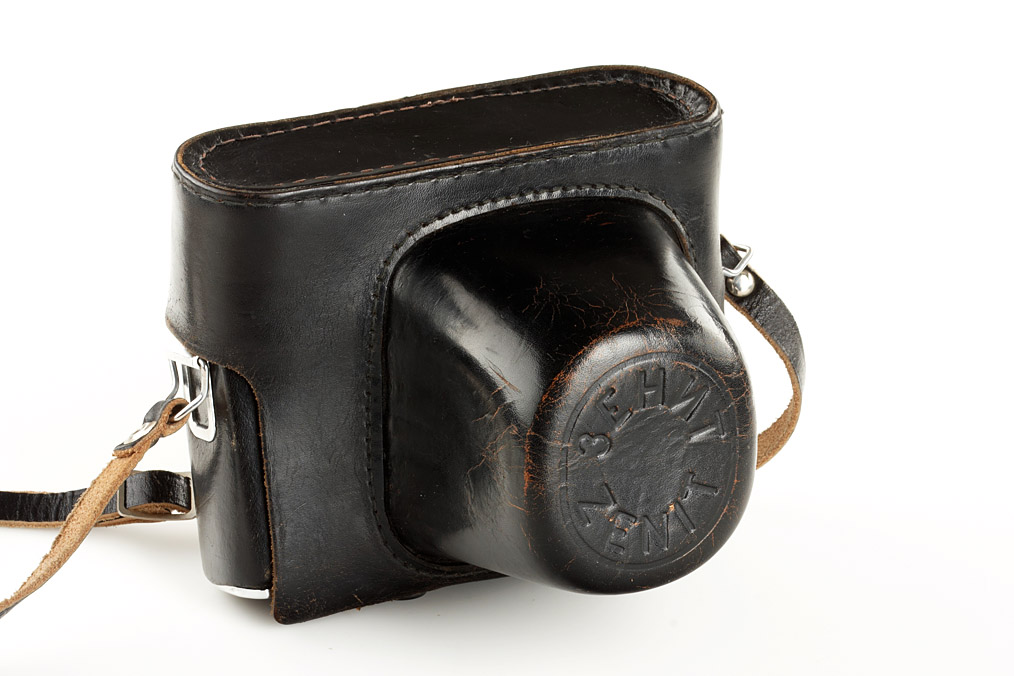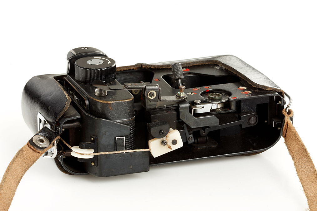 F21 mounted sideways in a Zenit SLR case to take pictures at right angles to front of the case, authentic and rare KGB spy outfit