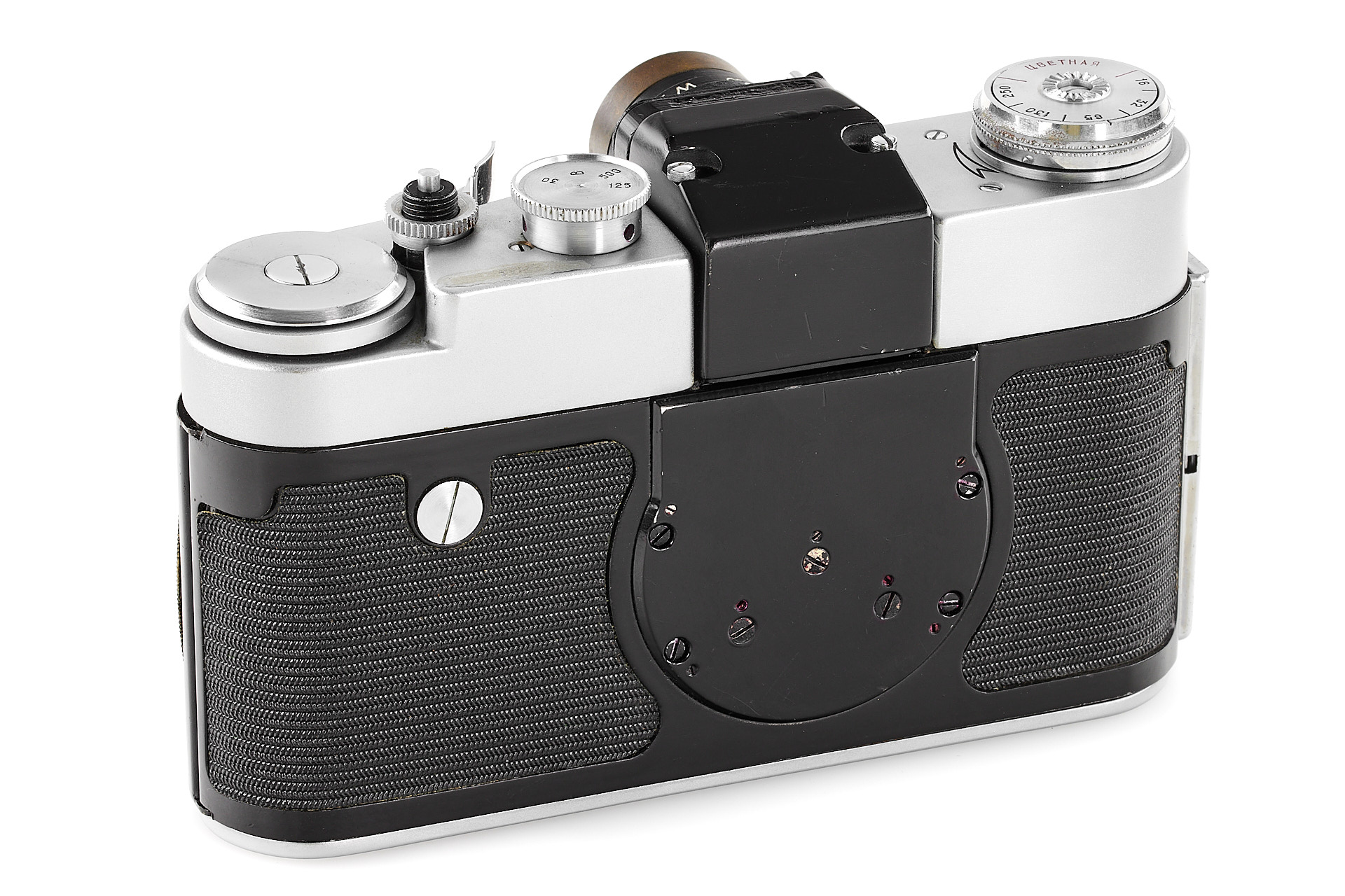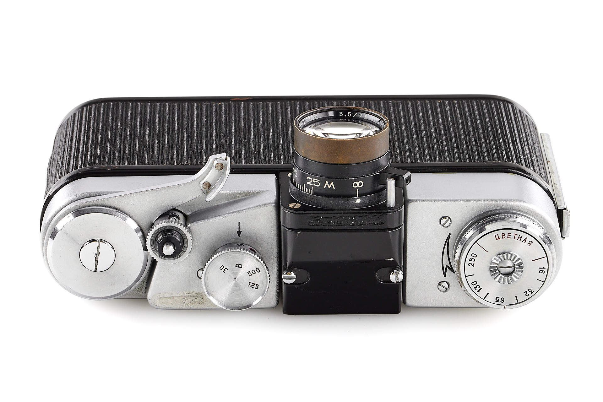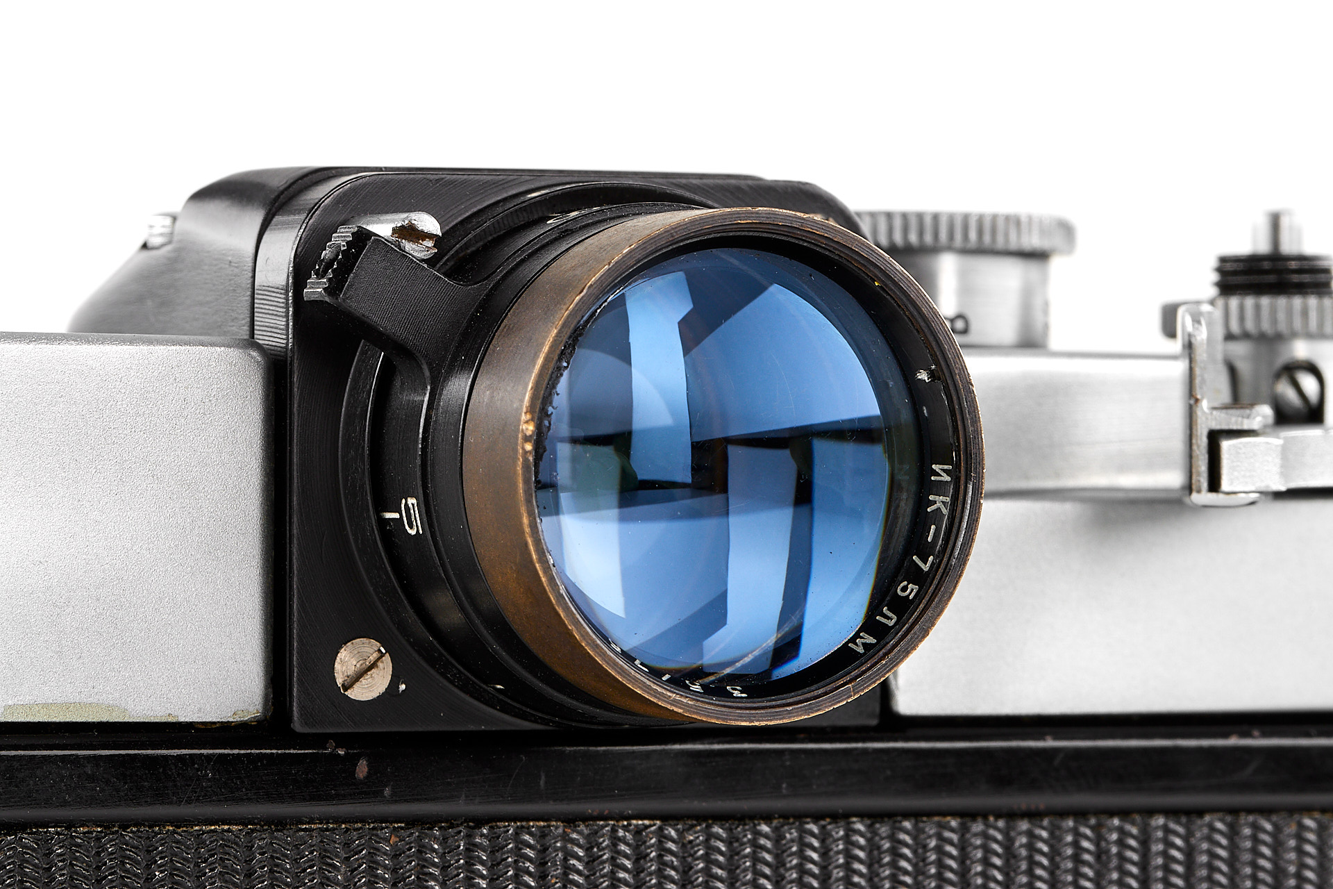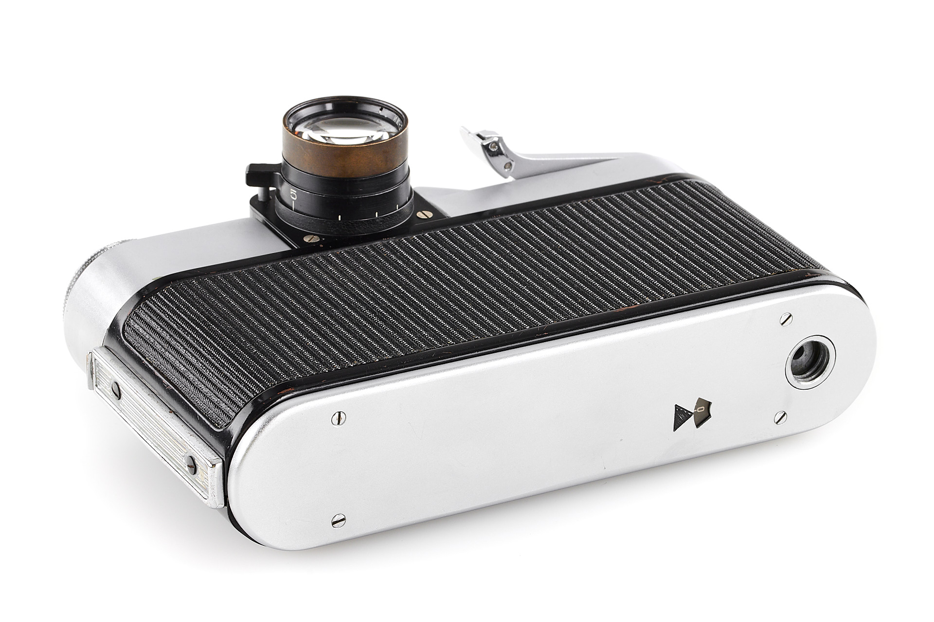 Rare original KGB spy camera, 35mm Zorki 6 - based body, heavily modified with built-in clockwork motor, special angled IK-75LM 3.5/75mm lens (here the horizontal version), in very good condition, the camera has no viewfinder, it was destined for use at waist-level or concealed in case, book etc, both serial numbers are defaced.